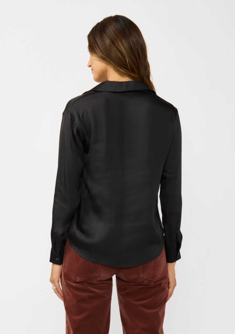 Crafted from smooth poly satin, this blouse exudes timeless elegance with its split neckline and crisp collar with a structured collar stand. The long sleeves are finished with a single-button closure for a tailored touch. A clean-finished hemline and subtle inside facing at the neckline enhance its polished look, making it a versatile choice for both work and evening wear.