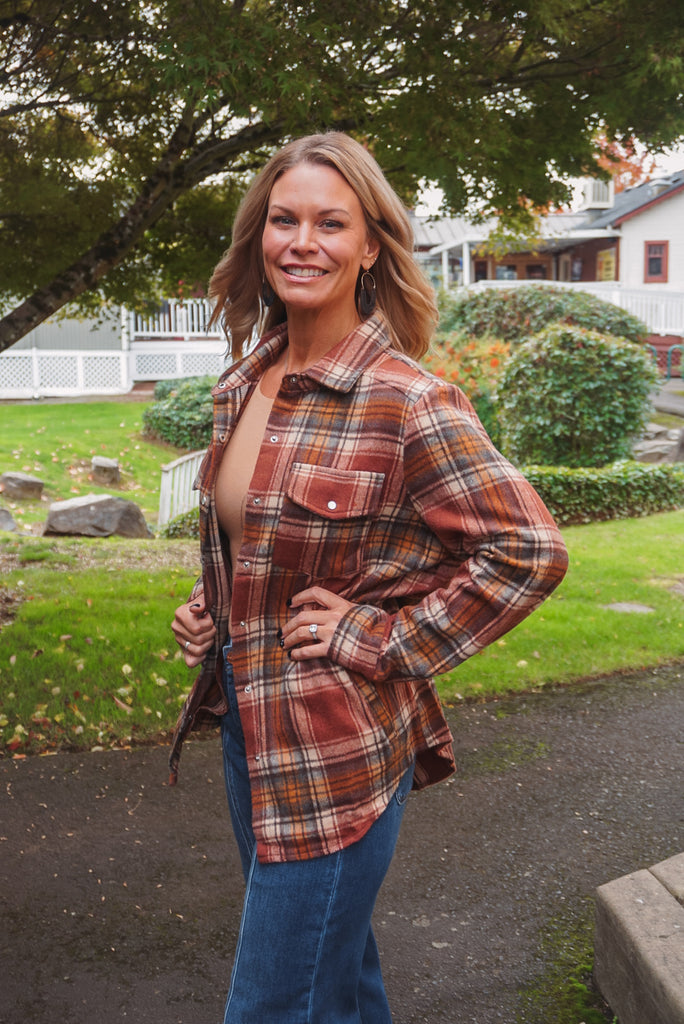The Tamarack Plaid Shacket is a versatile layering piece that combines the warmth of a jacket with the casual style of a shirt. This shacket features a classic plaid pattern, giving it a timeless, rustic appeal. The button-down front allows for easy wear and adjustable comfort, while the soft fabric ensures a comfy cozy wear. With its relaxed fit and slightly oversized design, the shacket can be worn over a simple tee or layered with a sweater. It's perfect for a laid-back look, whether you're running errands or enjoying a casual day out.
