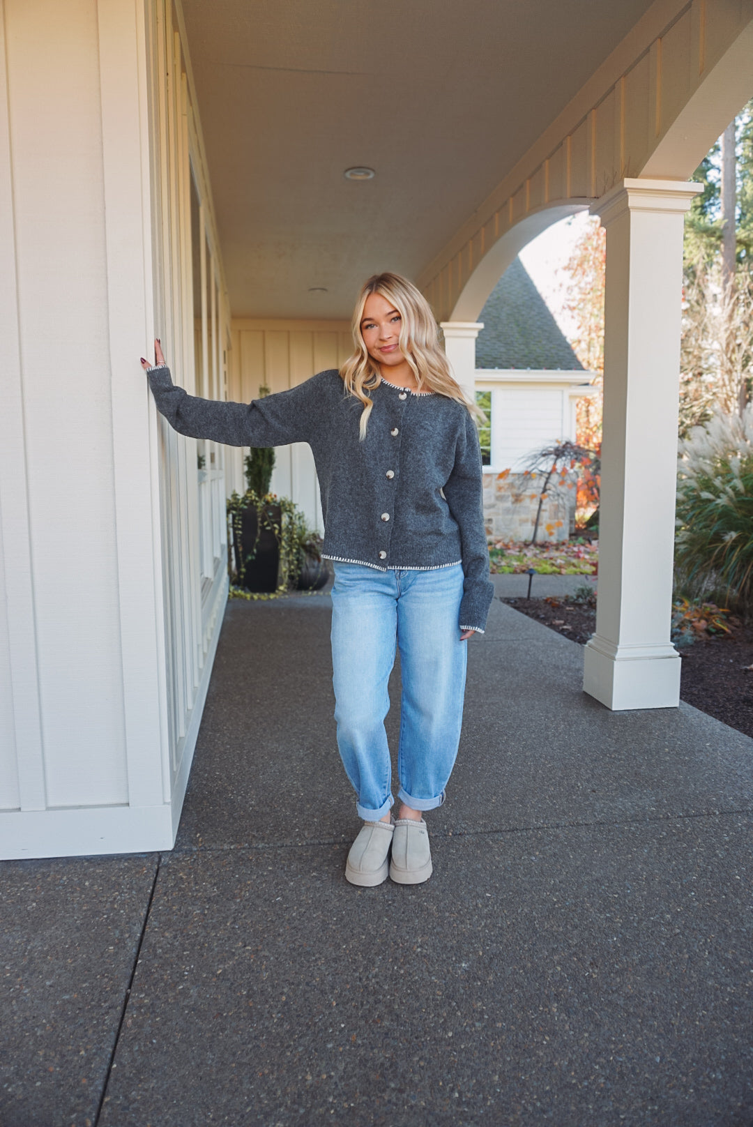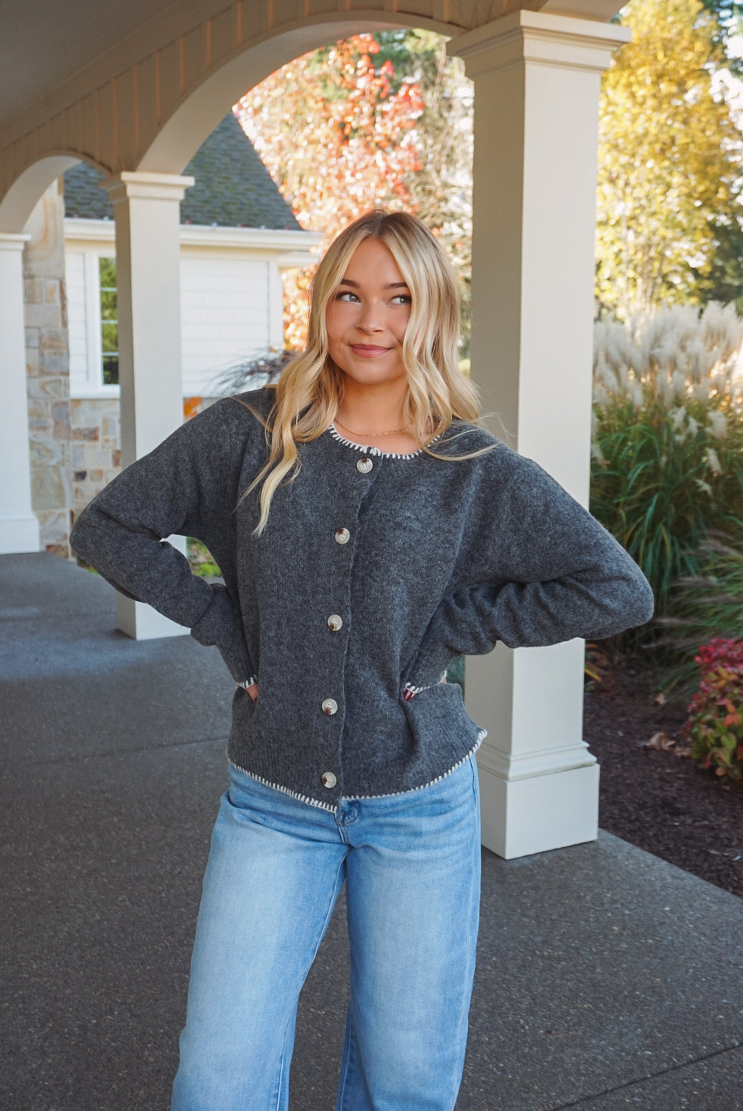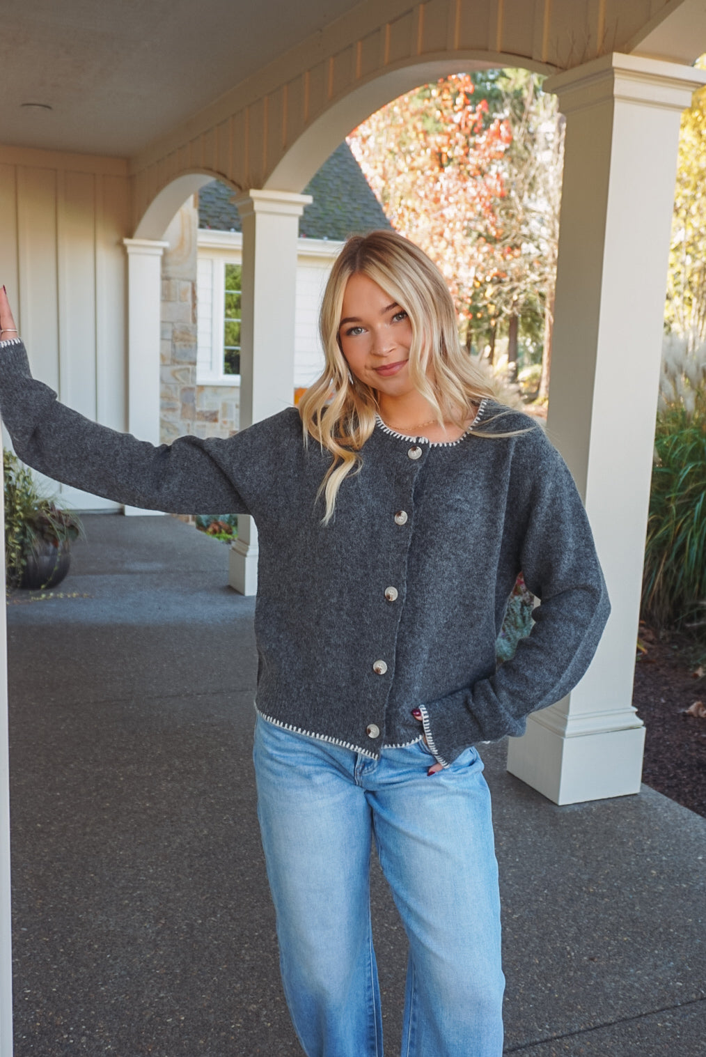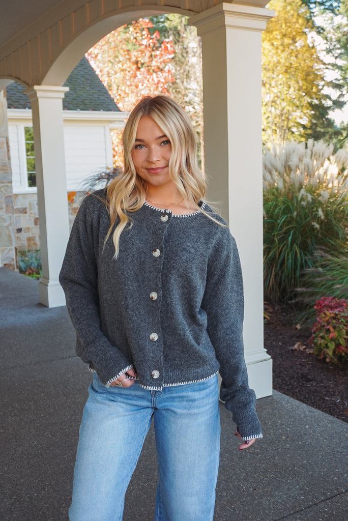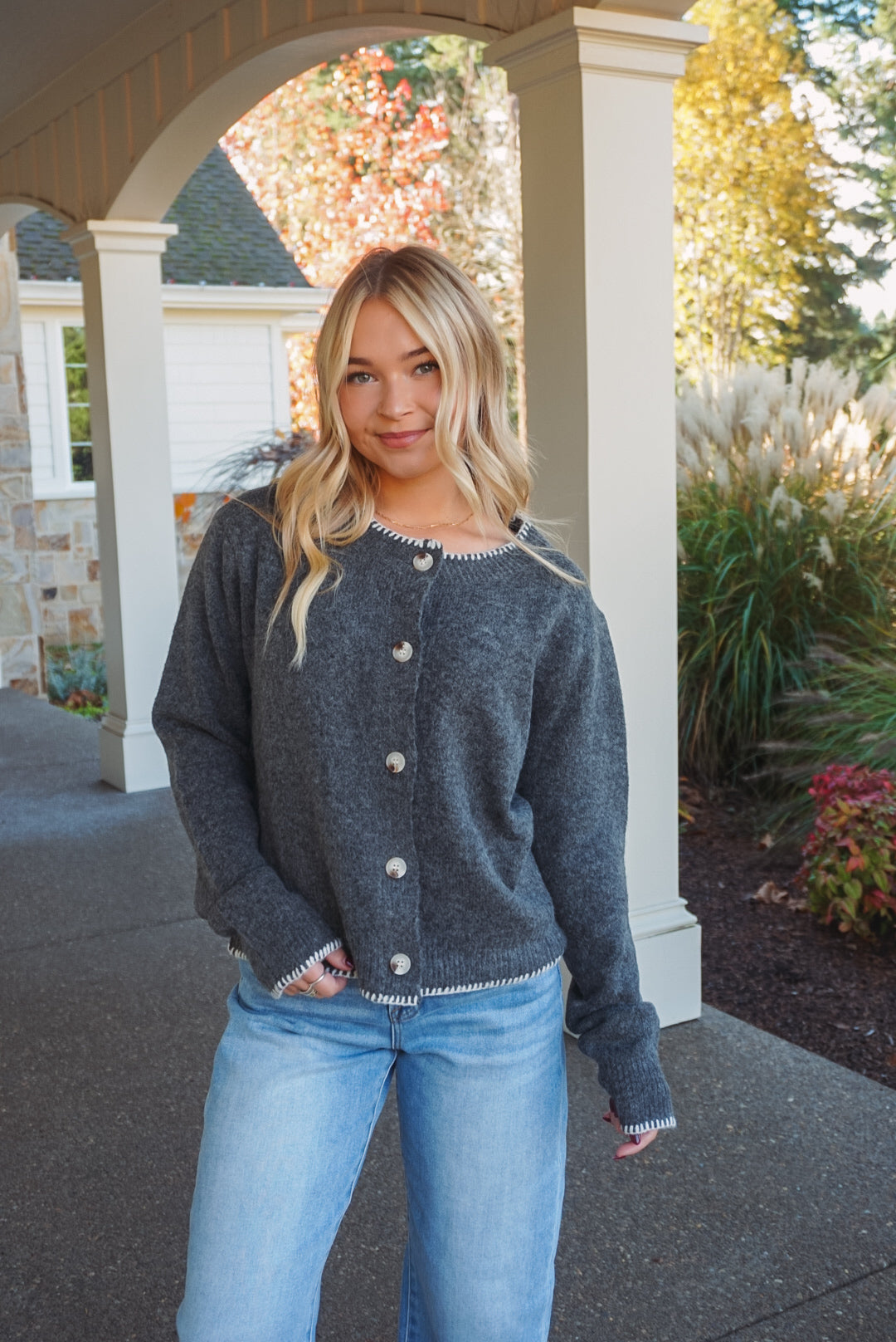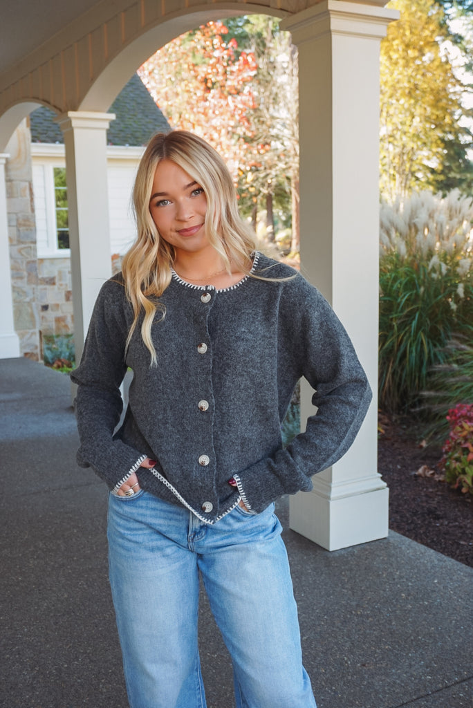 Elevate your layers with this soft, fuzzy cardigan featuring elegant marbled buttons along a vertical ribbed button band. The long sleeves, crew neckline, and waist hem are finished with contrast blanket stitch edges and ribbed cuffs for a refined touch. Stretchy and sophisticated, it's the perfect cozy-chic addition to your wardrobe.