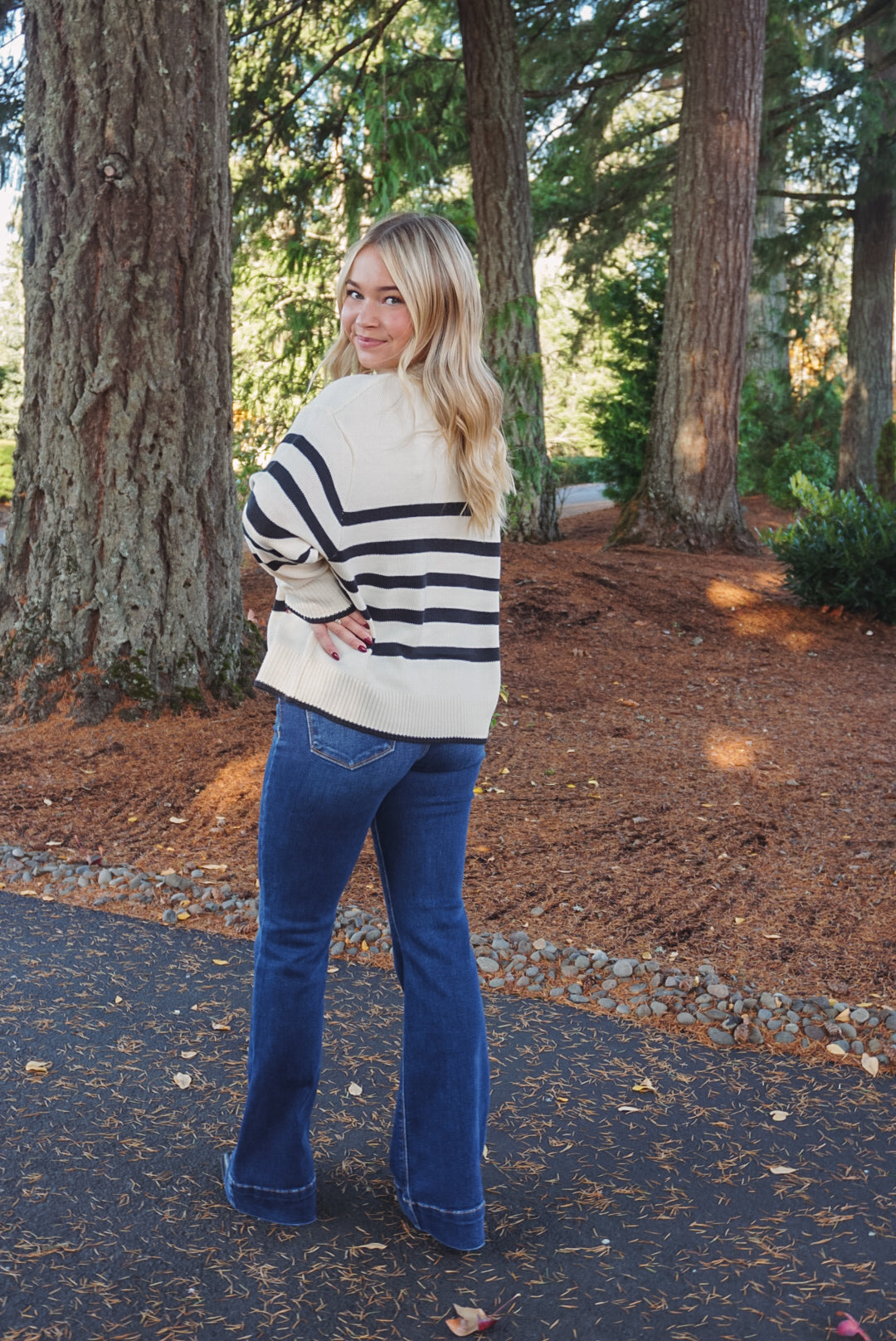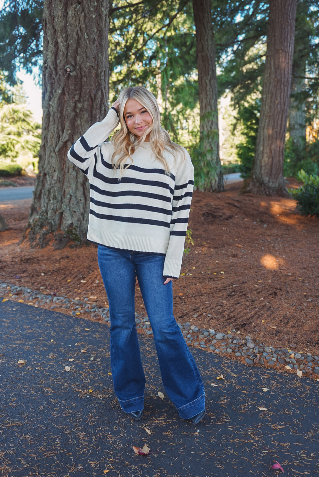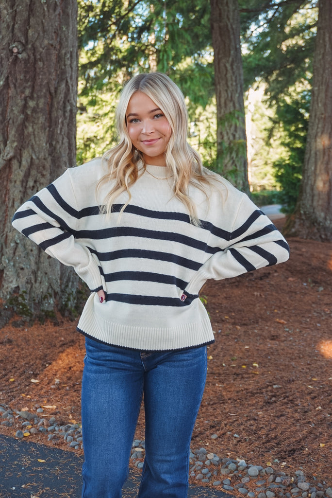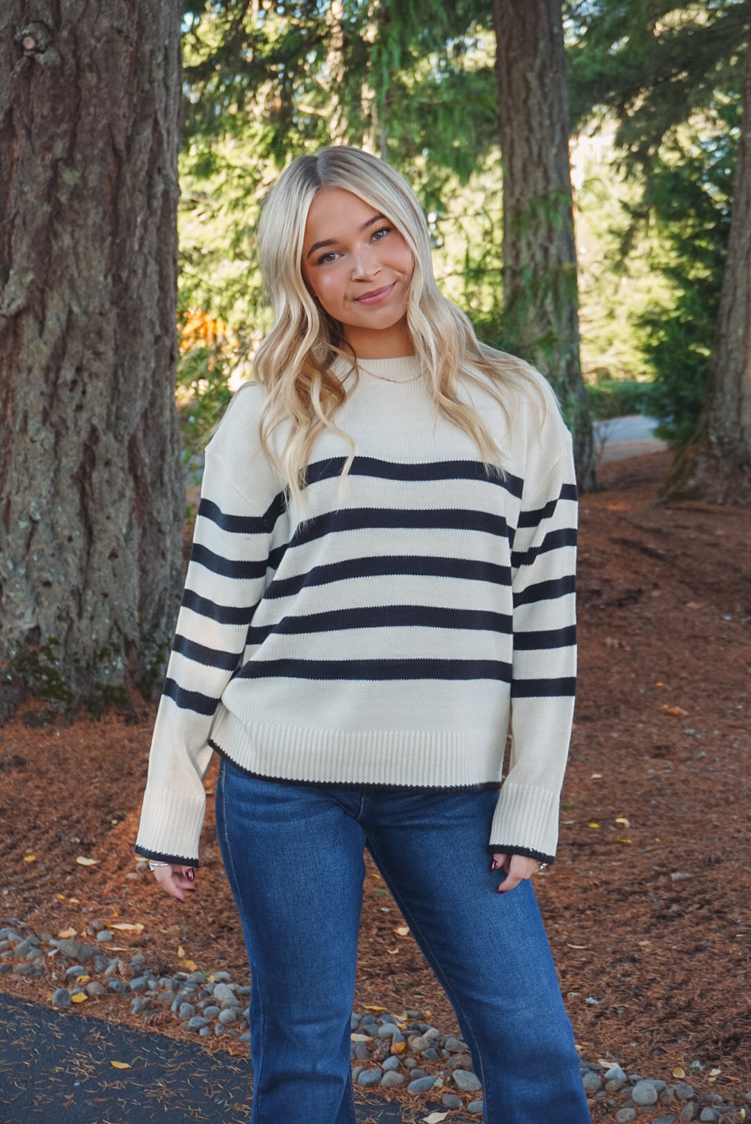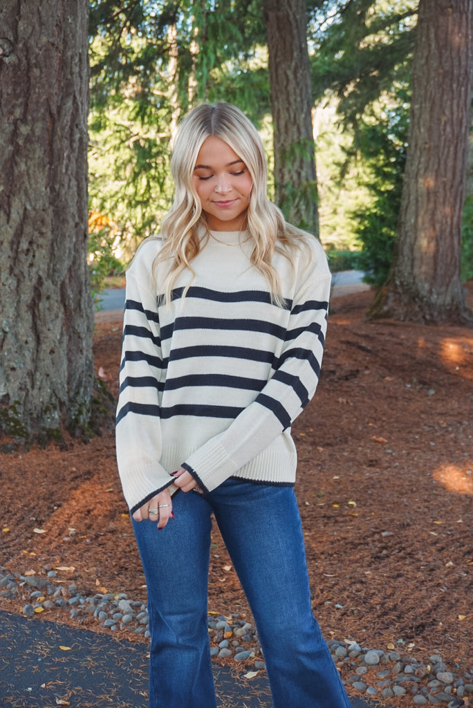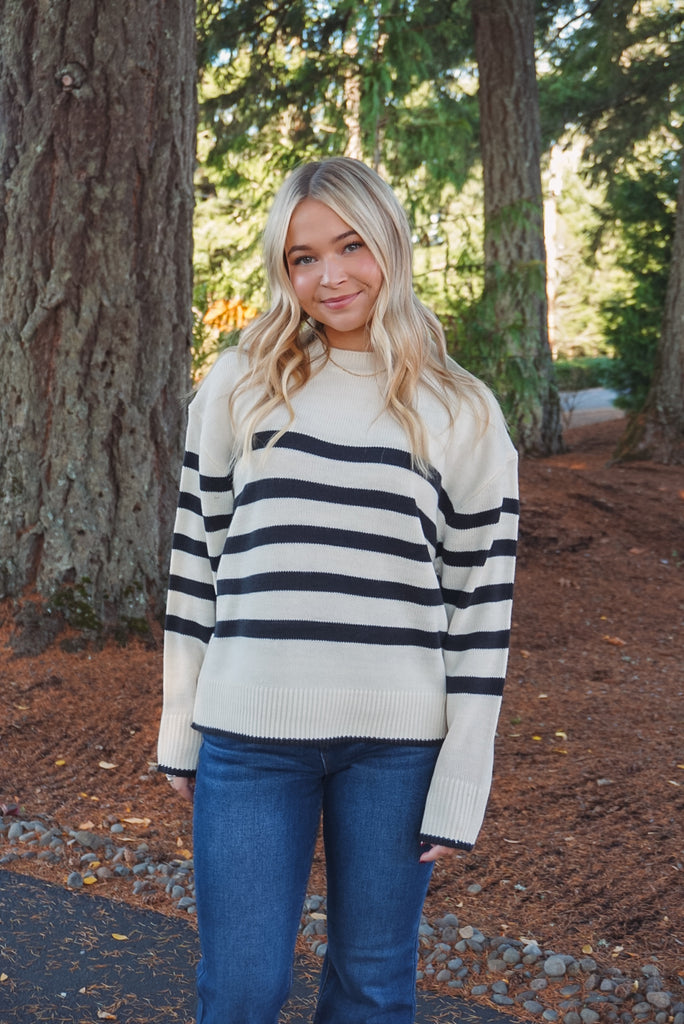 Embrace effortless style with this crew neck sweater featuring a timeless striped pattern. Perfect for any season, it offers a relaxed fit that promises comfort and versatility. Pair it with jeans or layer over a collared shirt for a smart-casual look, suitable for a relaxed weekend outing or a casual office day.