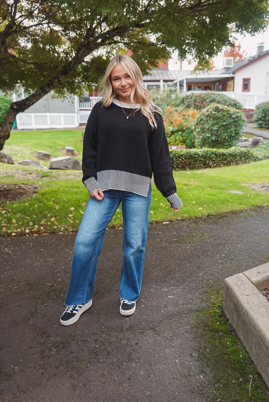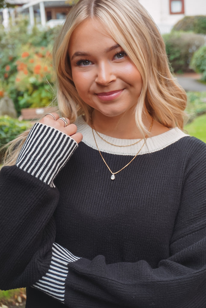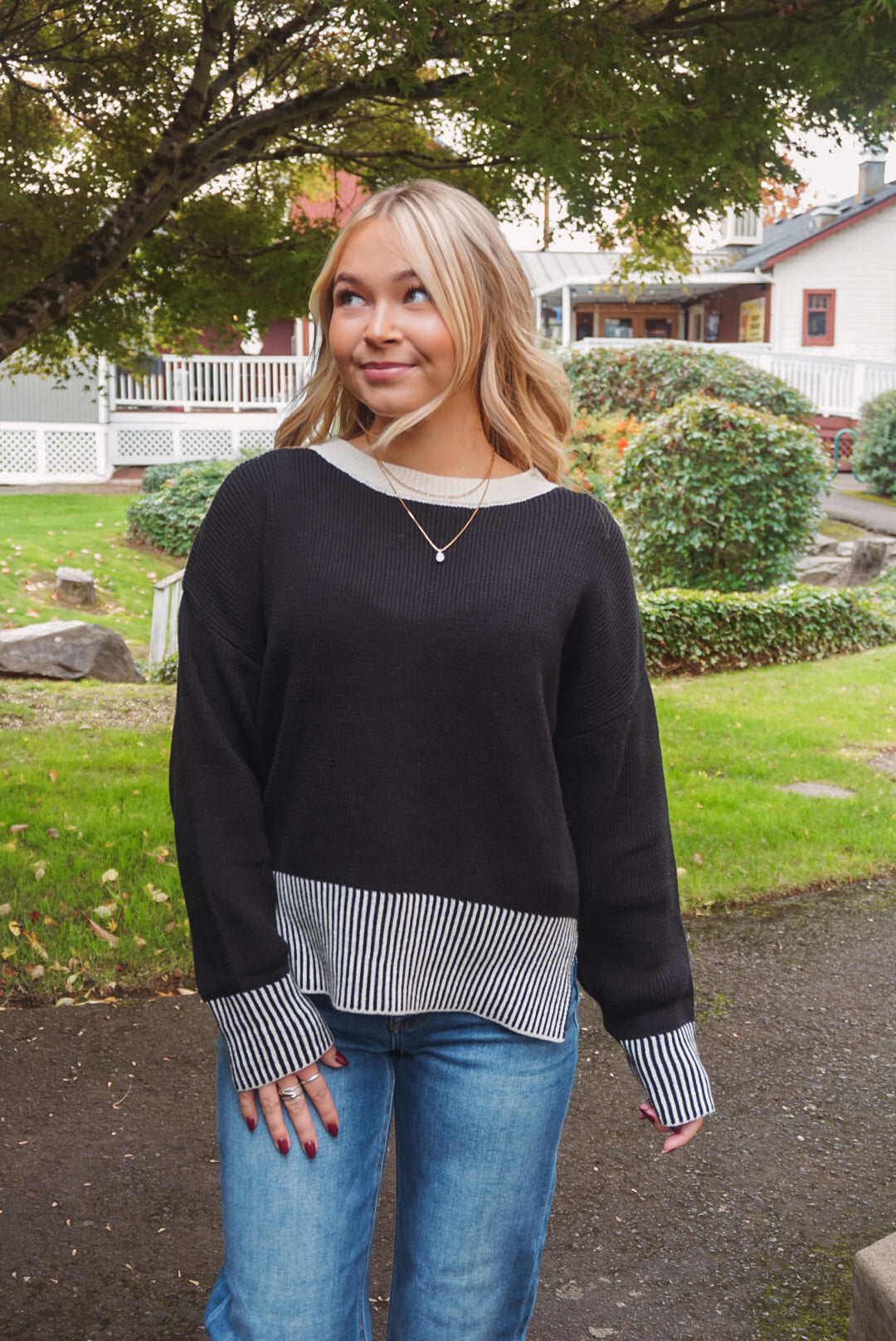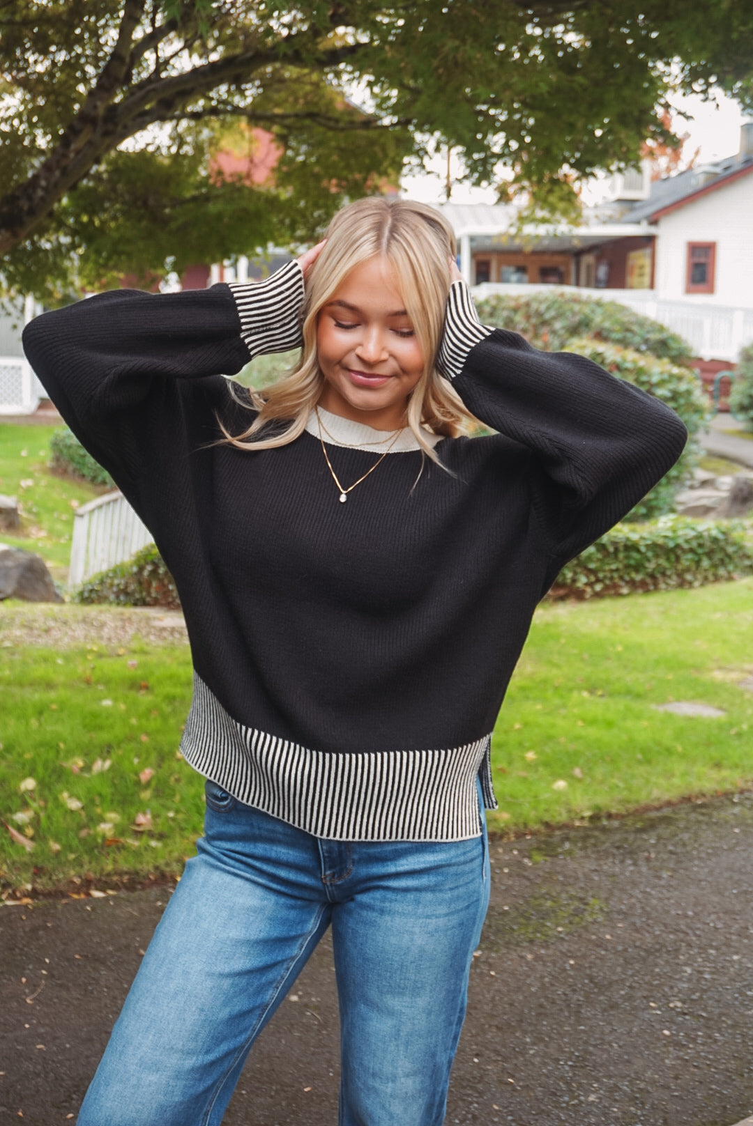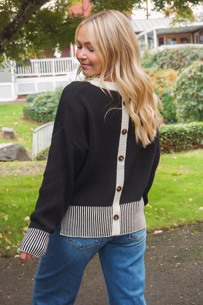 Stay comfy and stylish in our Rowan Stripe Sweater. Featuring a round neckline, long sleeves, and drop shoulder design, this relaxed fit pullover is the perfect addition to your wardrobe. With a contrast stripe hem trim and back button detailing, you'll stand out in the best way.