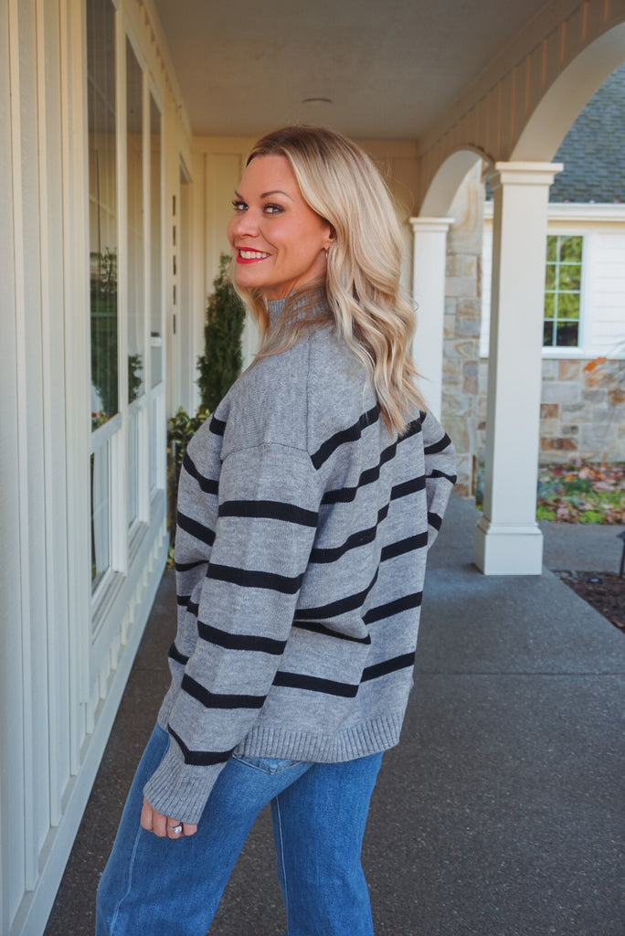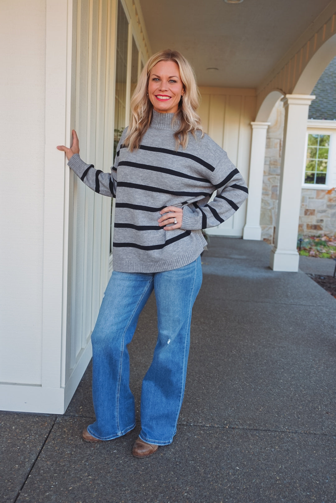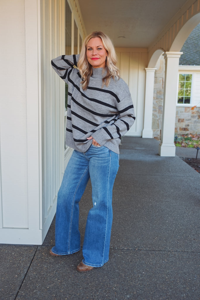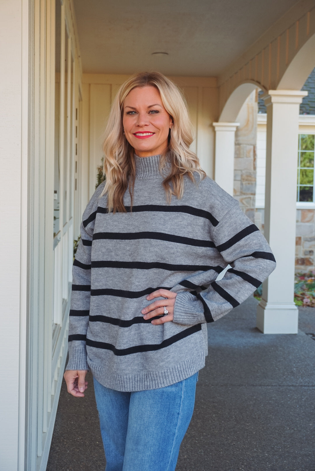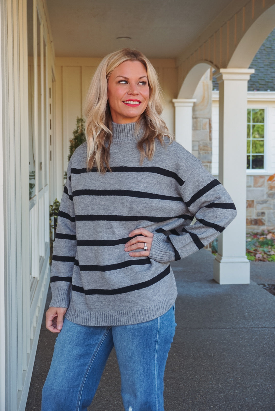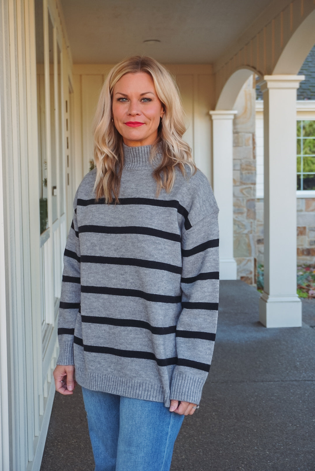 Start your day on the right note with this ultra-cozy sweater. Its oversized silhouette is adorned with a classic striped pattern, featuring an elegant high neck, drop shoulders and long sleeves. Ribbed edges add to the textural interest.
