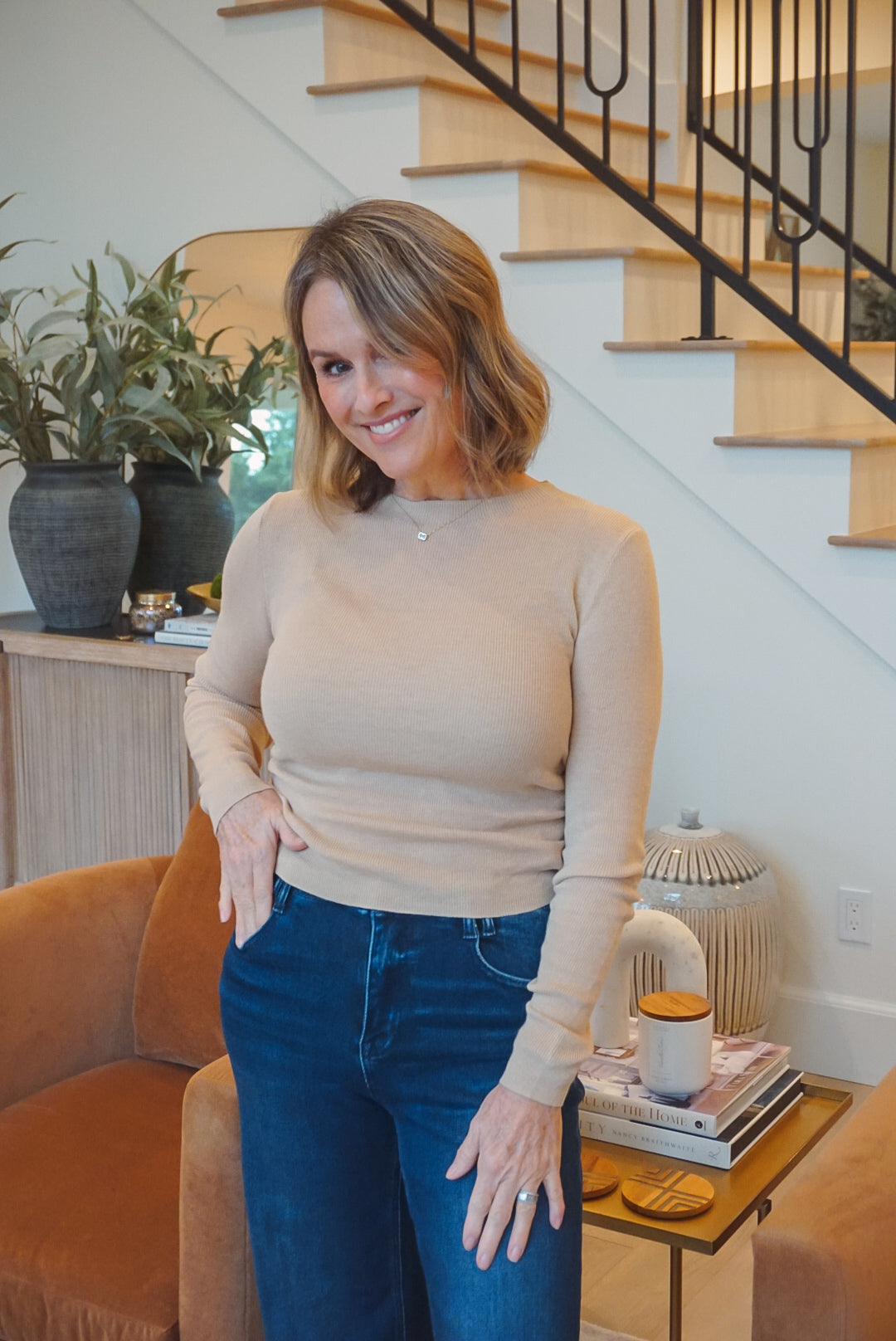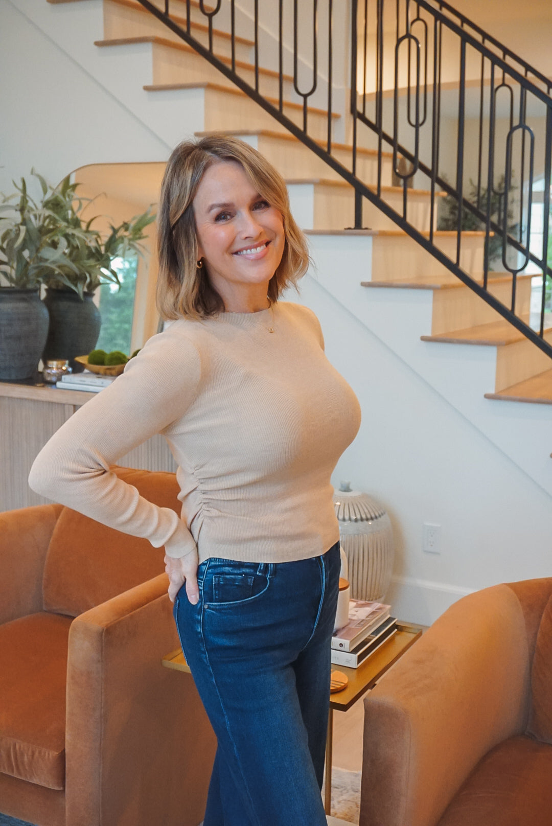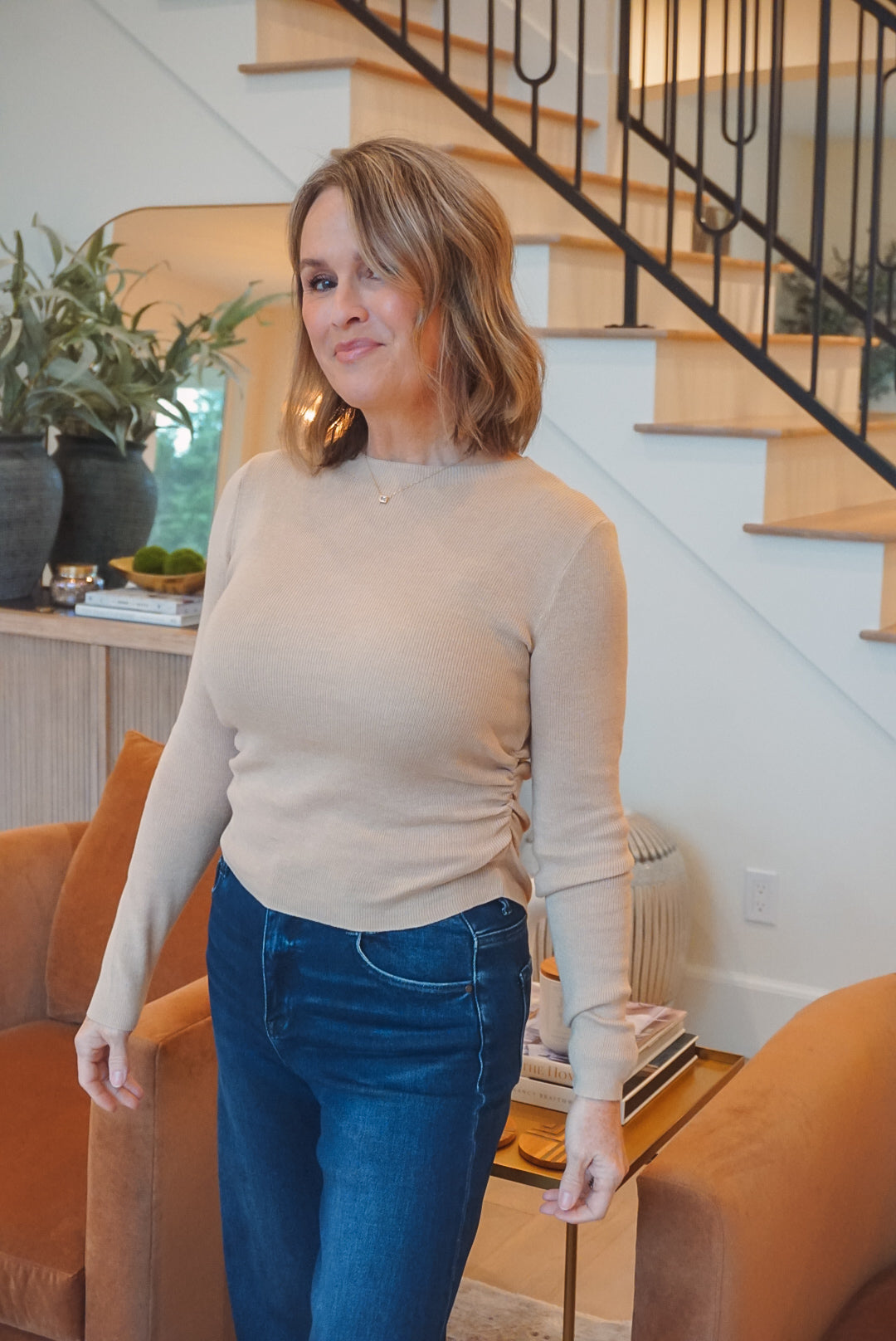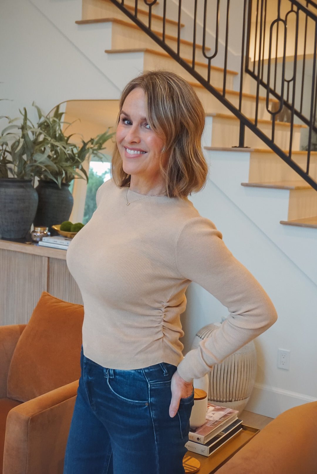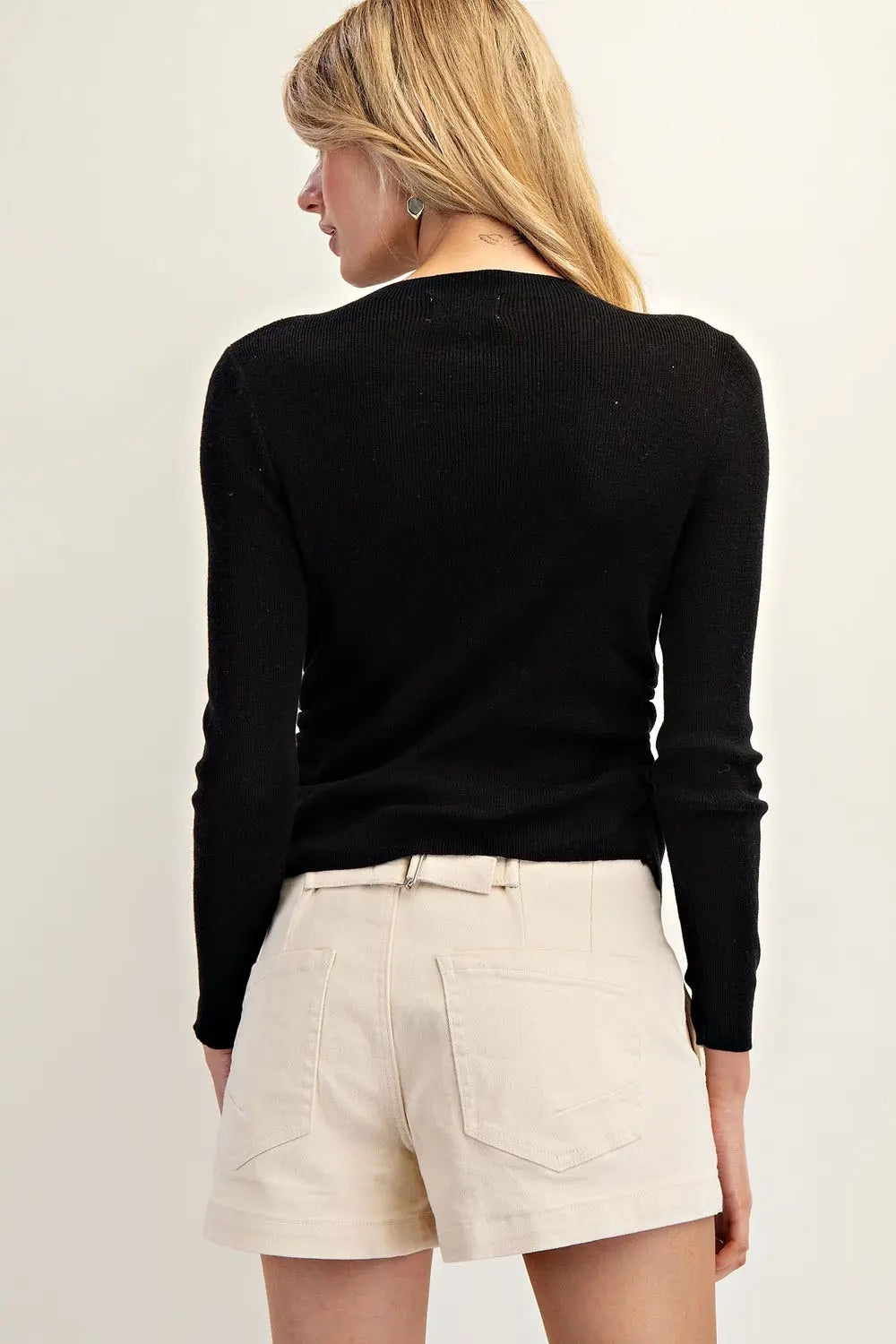 This fitted long sleeve knit top showcases a sleek, ribbed texture, subtle side ruching for a flattering silhouette, and a classic round neckline, offering a versatile and chic look perfect for layering or wearing on its own.