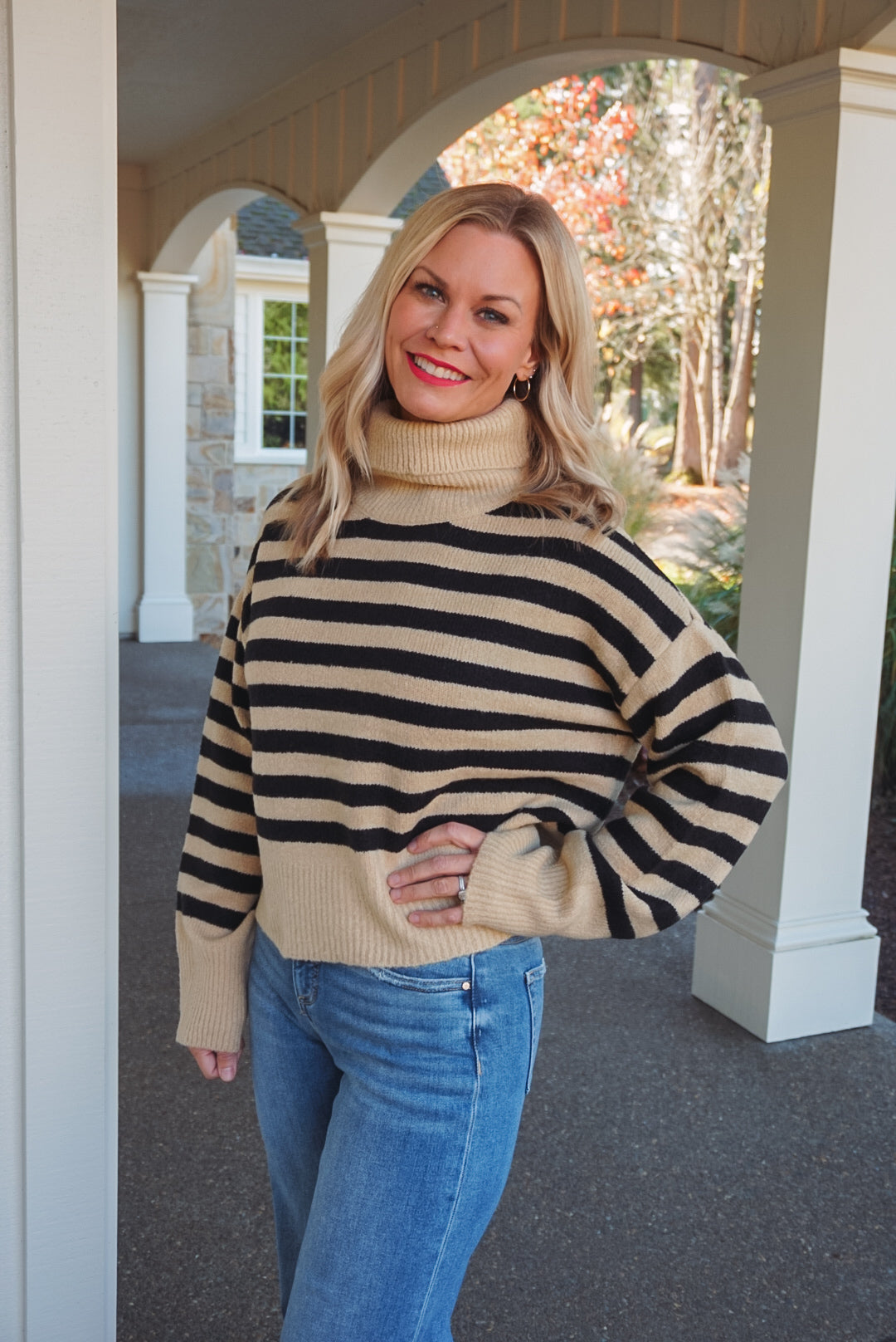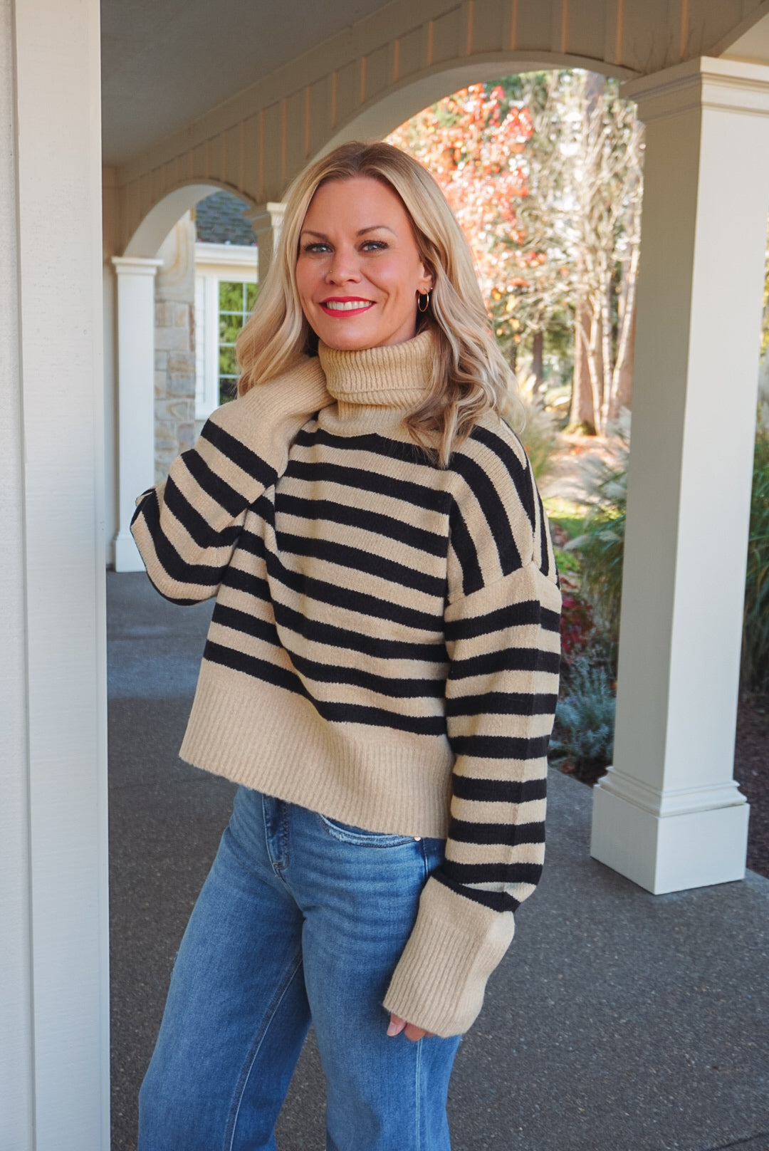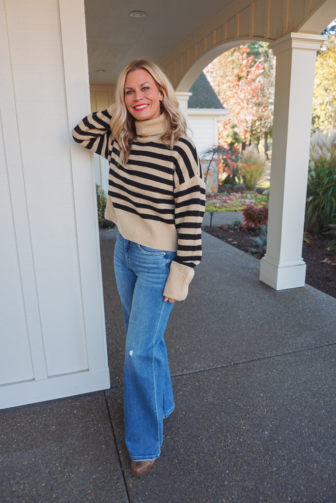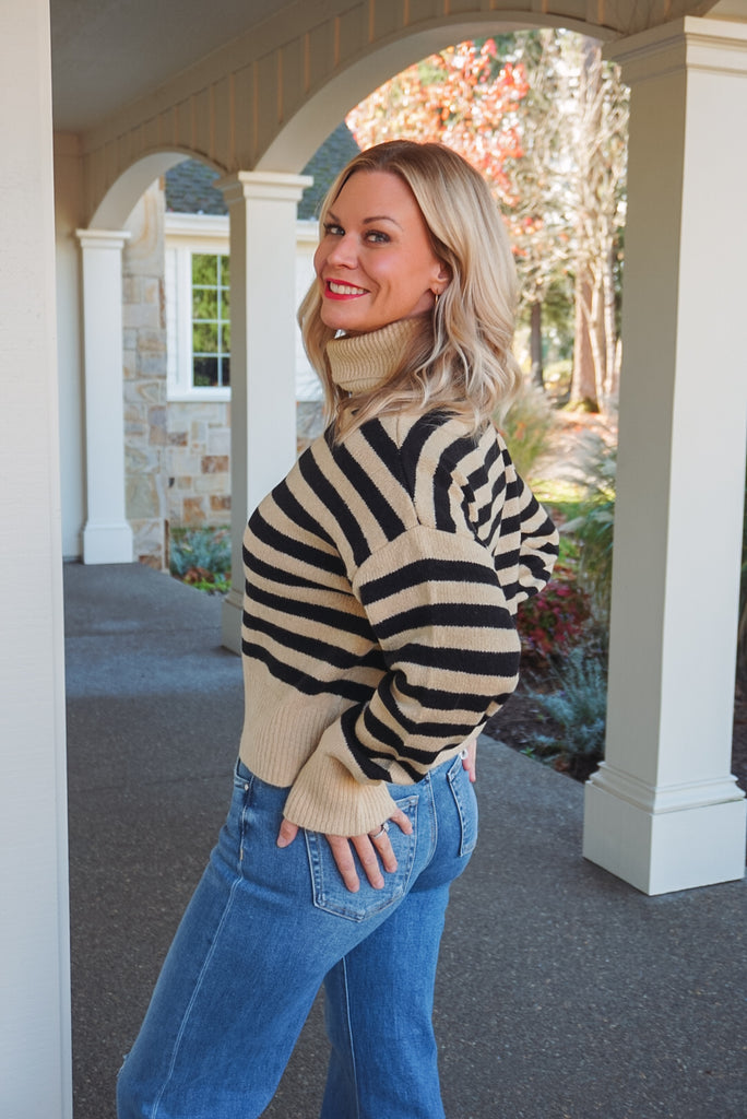 Get ready to be cozy and stylish in our Rudy Sweater! With a trendy turtleneck and a classic striped pattern, you'll be sure to stand out in style. The ribbed accents add a touch of texture and the relaxed fit allows for maximum comfort. Don't sacrifice fashion for comfort - have both with our Rudy Sweater!