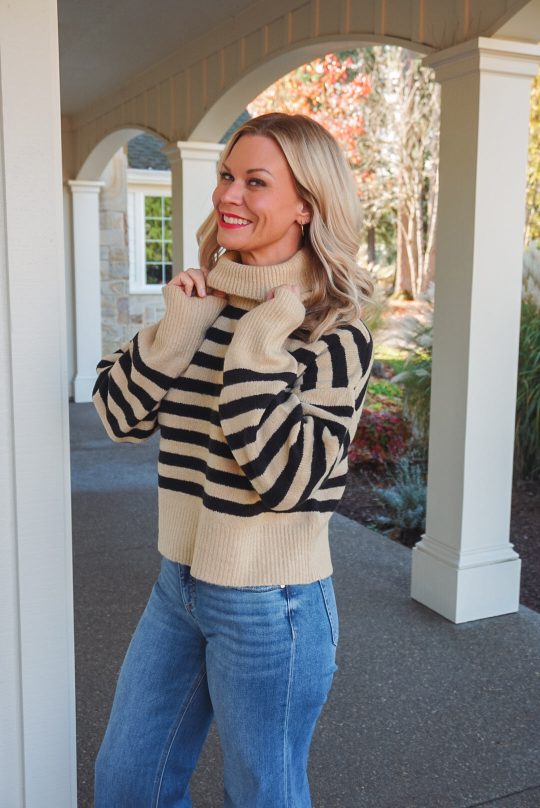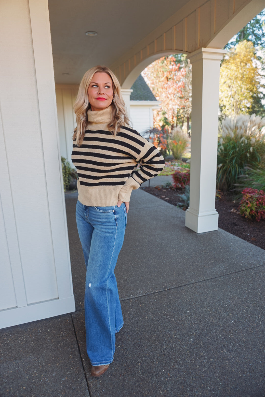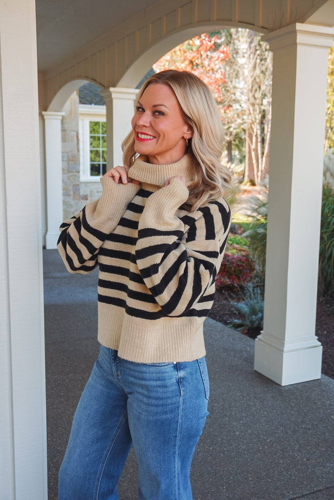 Get ready to be cozy and stylish in our Rudy Sweater! With a trendy turtleneck and a classic striped pattern, you'll be sure to stand out in style. The ribbed accents add a touch of texture and the relaxed fit allows for maximum comfort. Don't sacrifice fashion for comfort - have both with our Rudy Sweater!