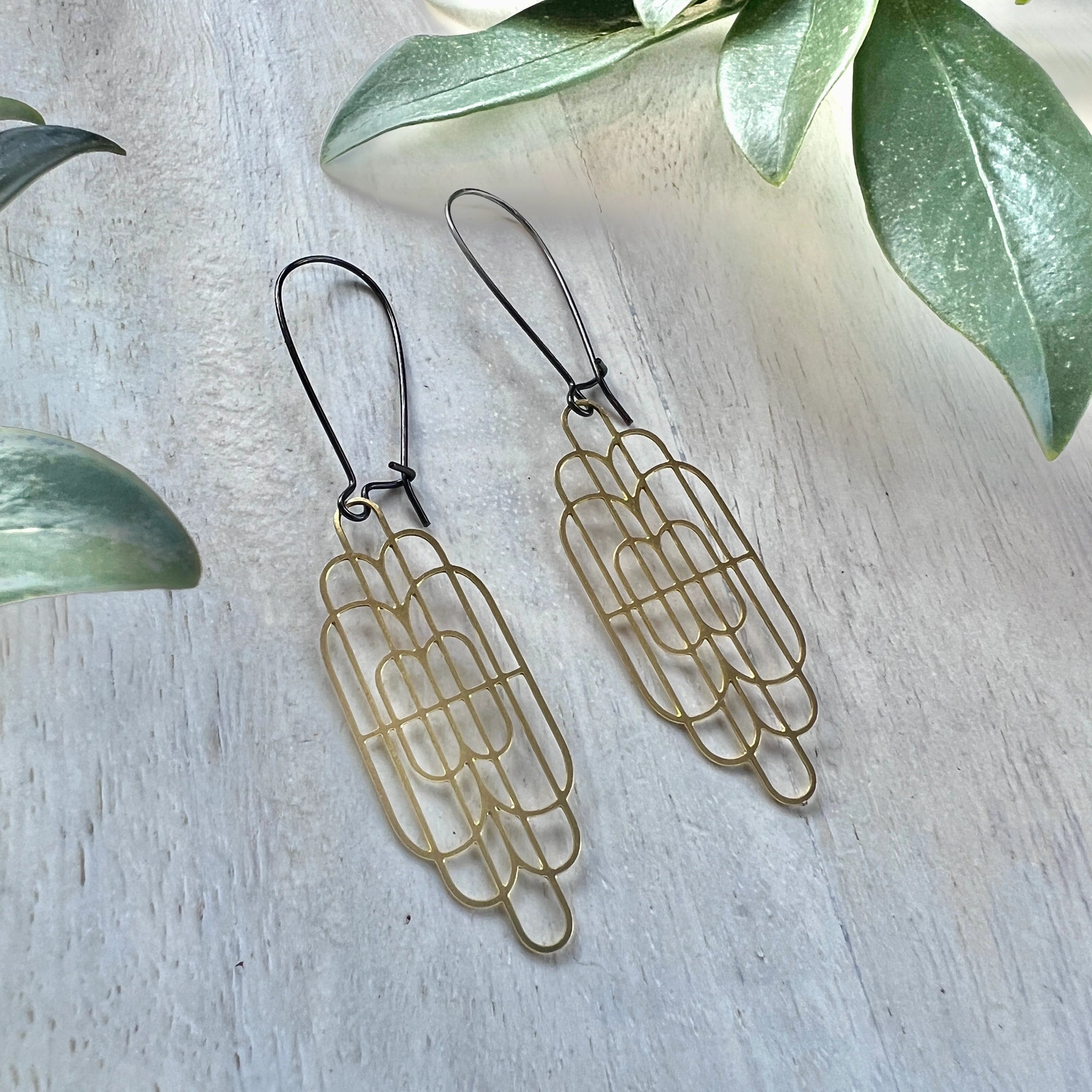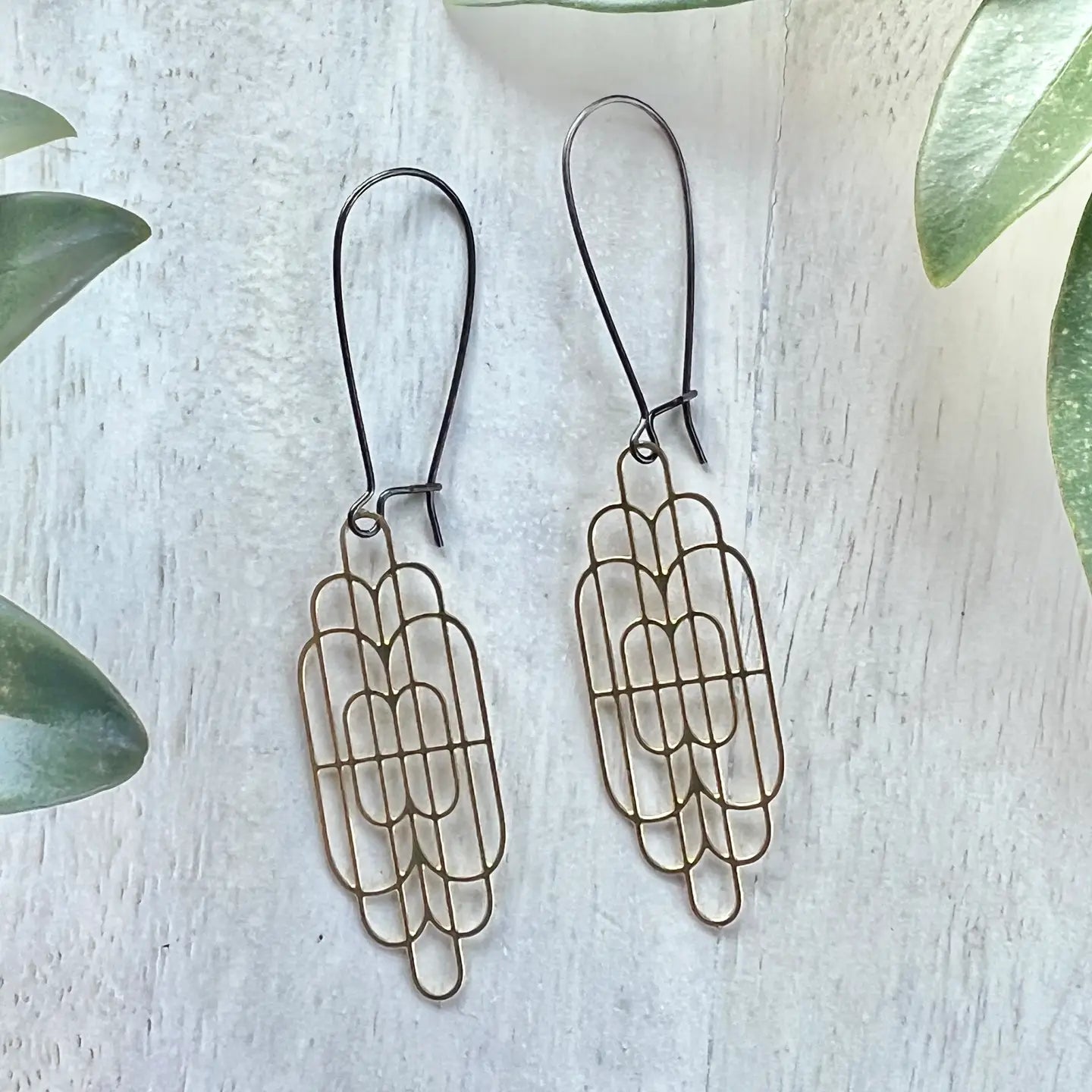 Upgrade your style with Karissa Earrings! These brass pendant earrings, featuring an art deco design, will add a touch of vintage charm to any outfit. The antiqued gunmetal earwires add a unique touch, and with a total length of 2.87 inches, these earrings are sure to make a statement.