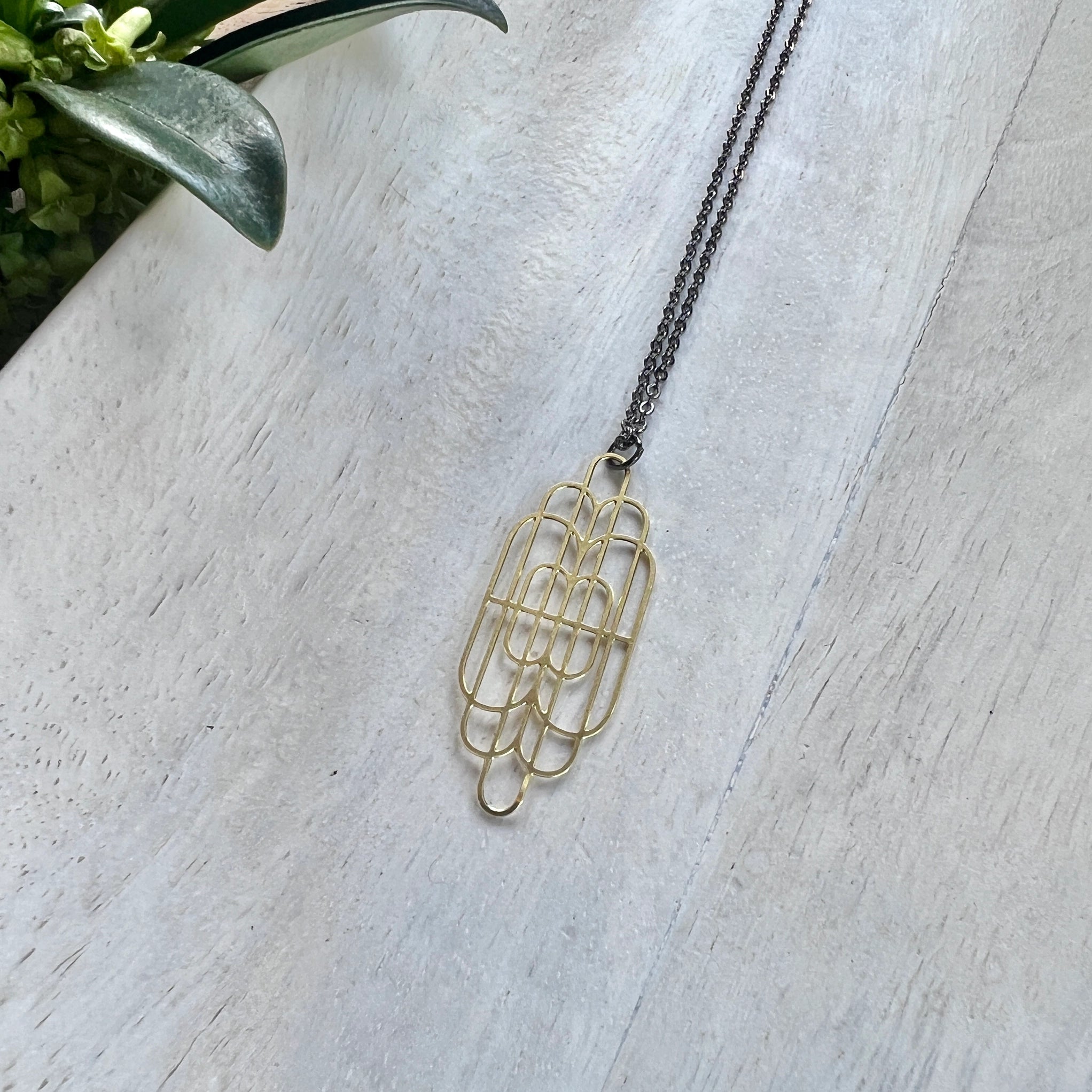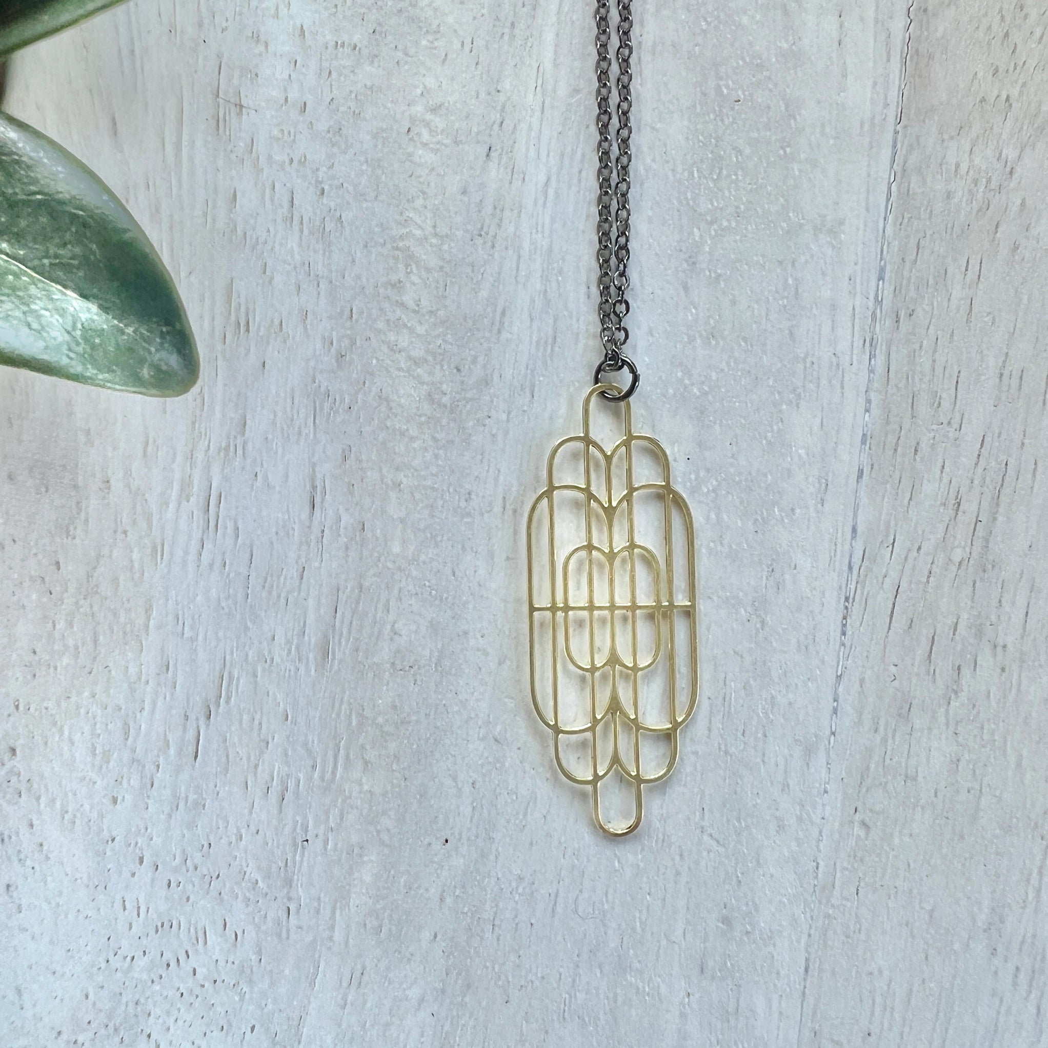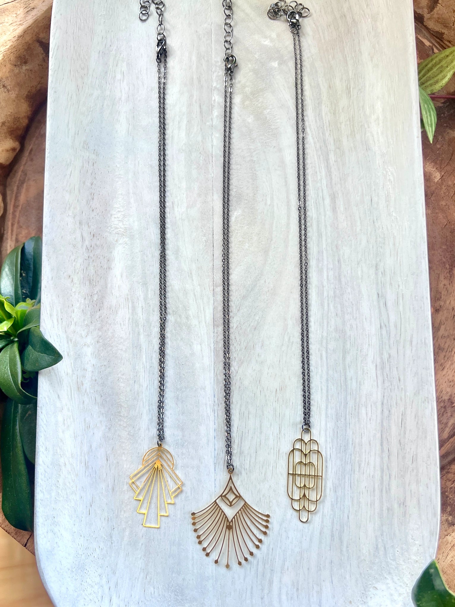 The Karissa Necklace boasts an adorable art deco brass pendant on an adjustable gunmetal brass chain, measuring 16-18 inches. Elevate any outfit with this charming and versatile piece.