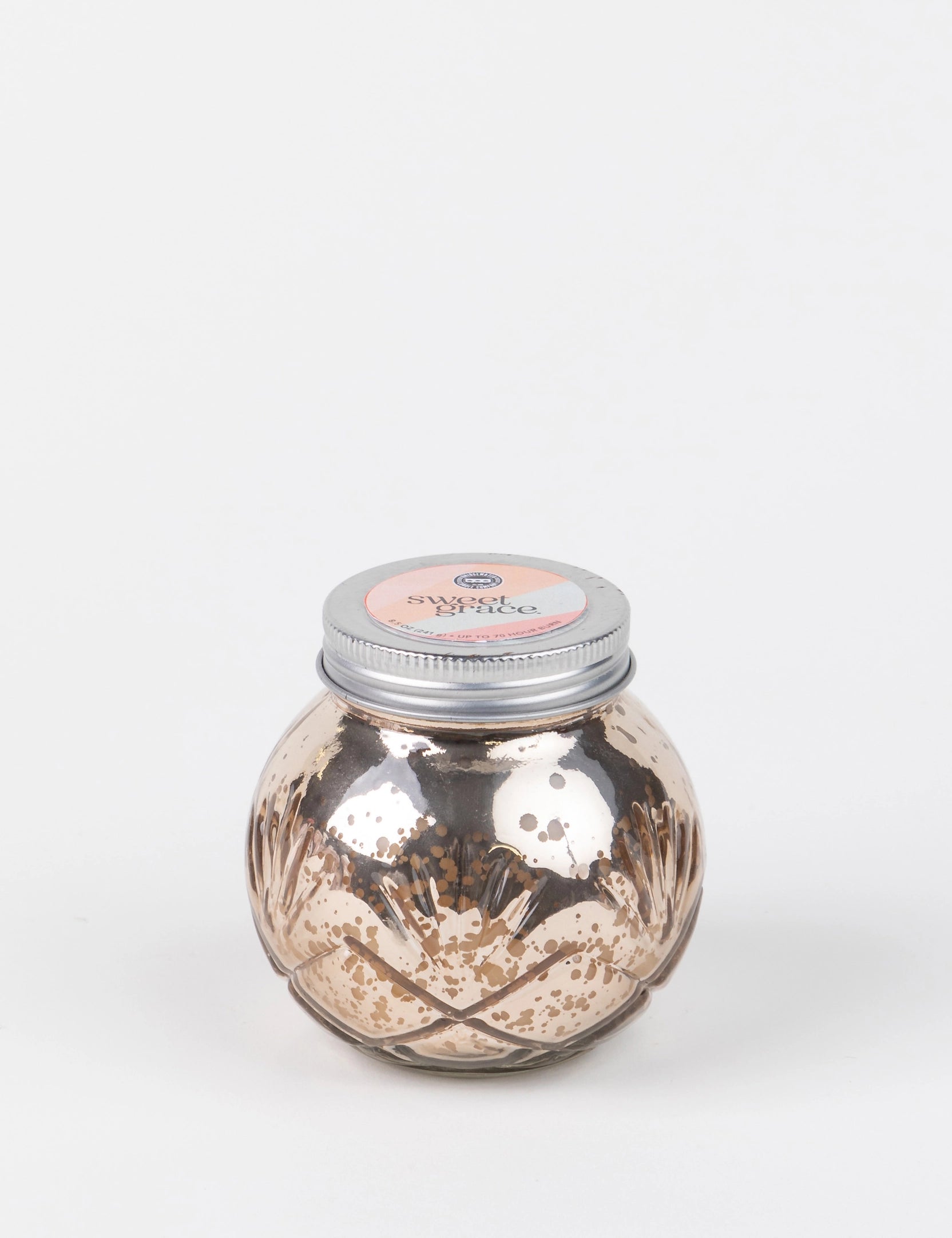 Undeniably warm, peaceful and pure, Sweet Grace illuminates with effortless beauty. Full-bodied fruits embrace the heart-warming aroma of sparking tea and patchouli for a heaven sent fragrance formula. A blush-toned mercury glass finish imparts a rosy feel to this etched glass votive with lid. Burn Time is up to 70 hours Content/Weight is 8.5oz/241 grams