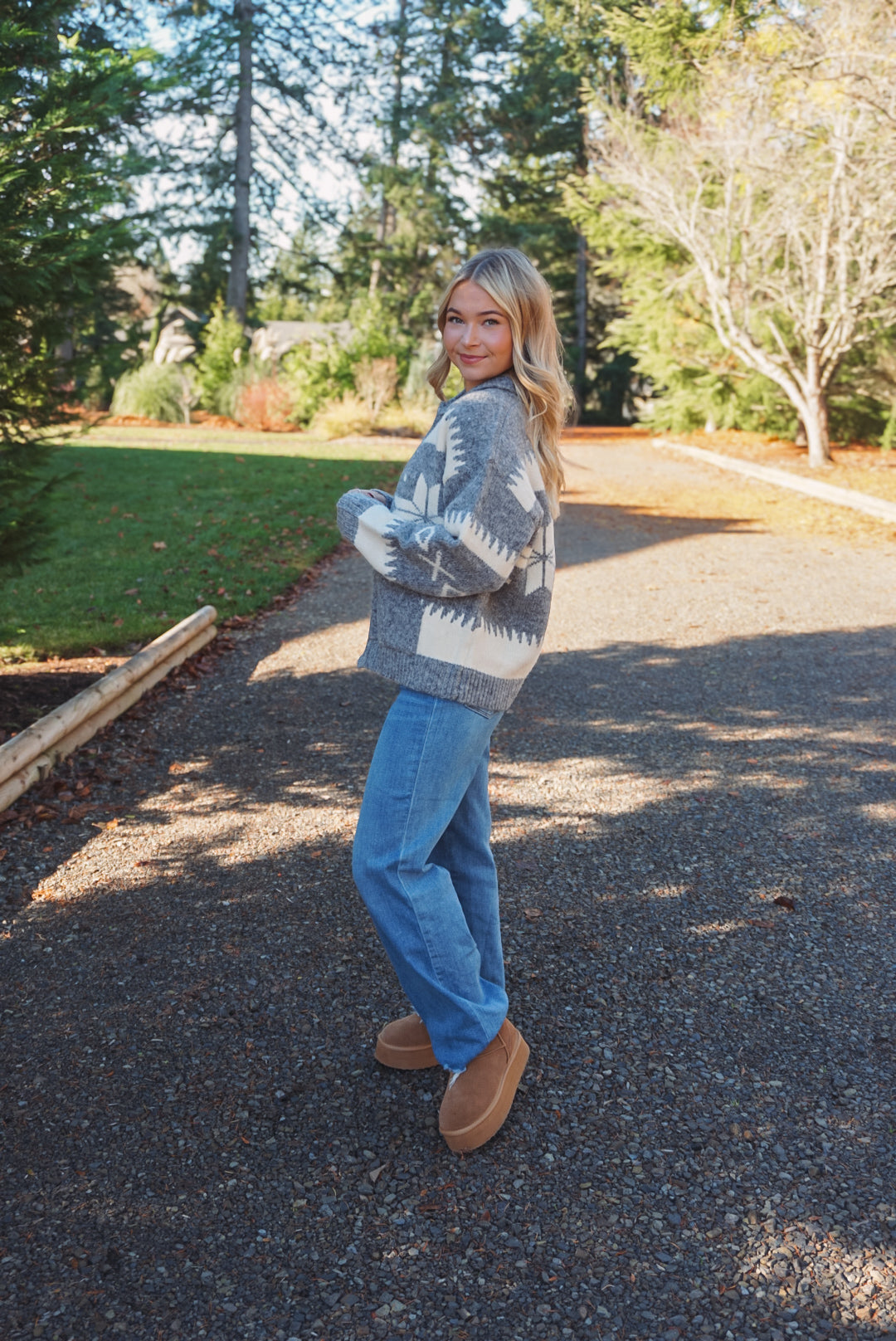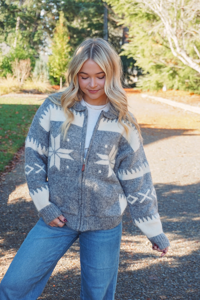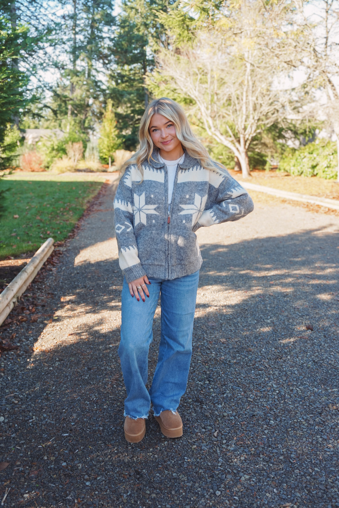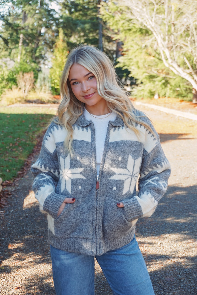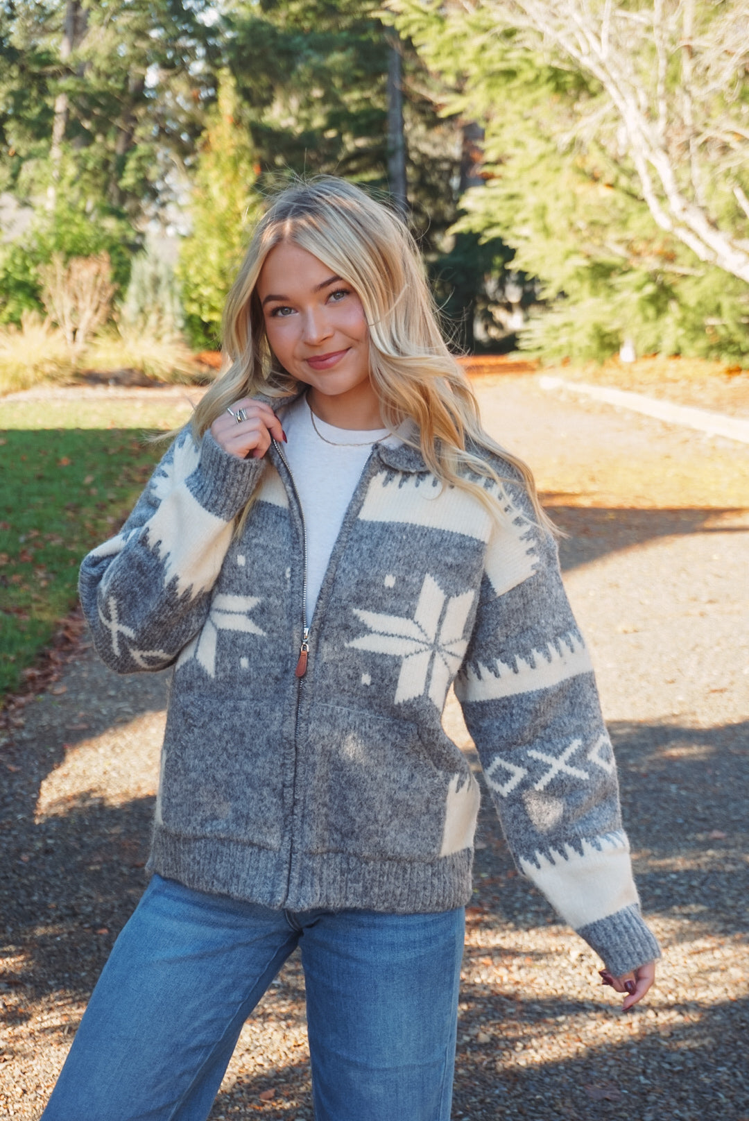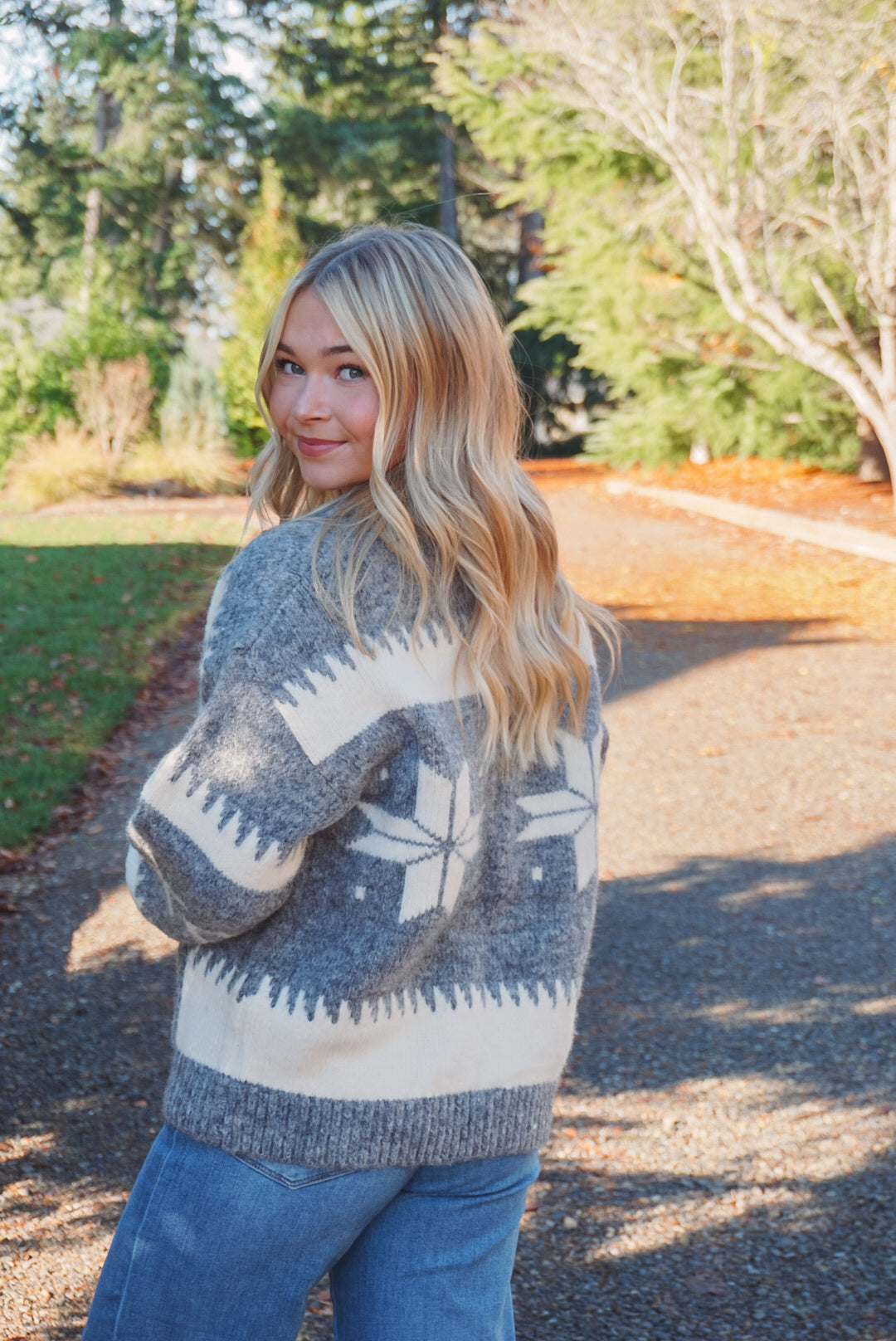 This cozy cardigan brings a playful twist to a classic style with a distinctive fair isle pattern and snowy accents. The soft, fuzzy knit provides warmth and comfort while the full-zip front, collar, and pockets add practicality. Bundle up in style this winter with our Snow Fair Isle Cardigan!