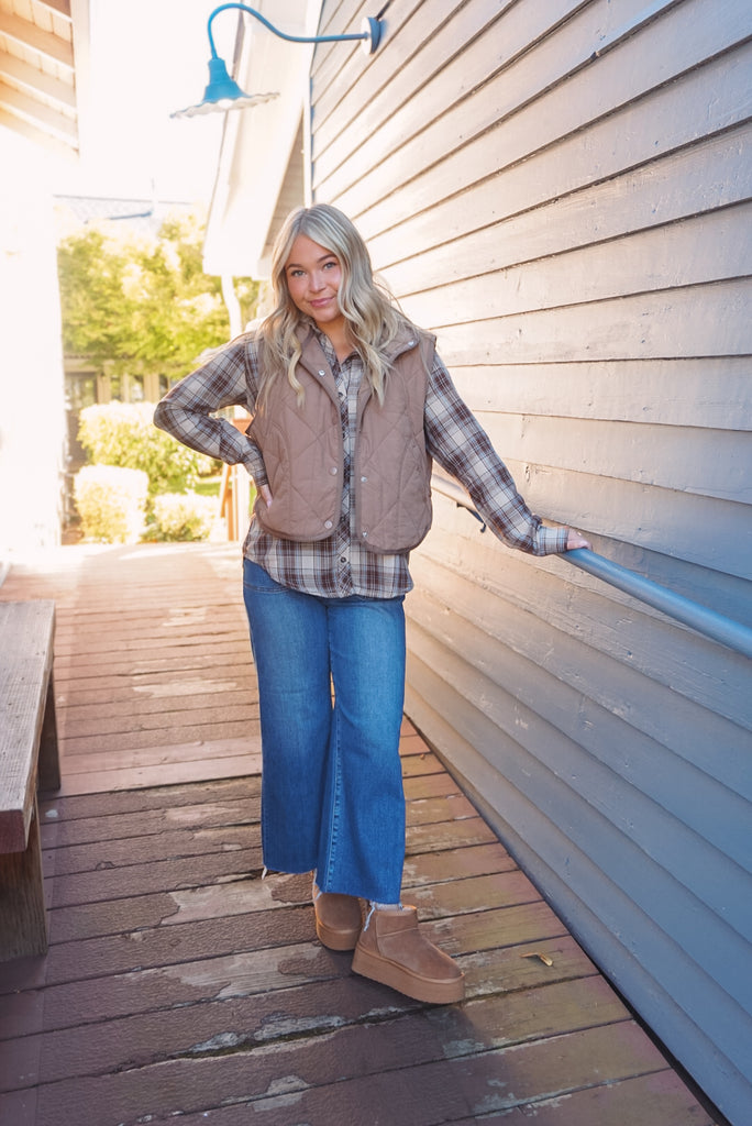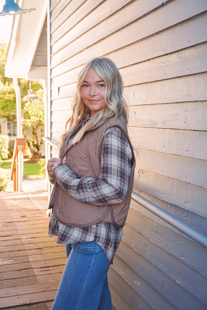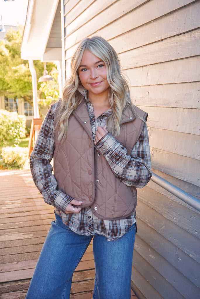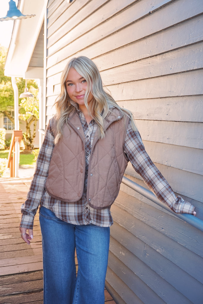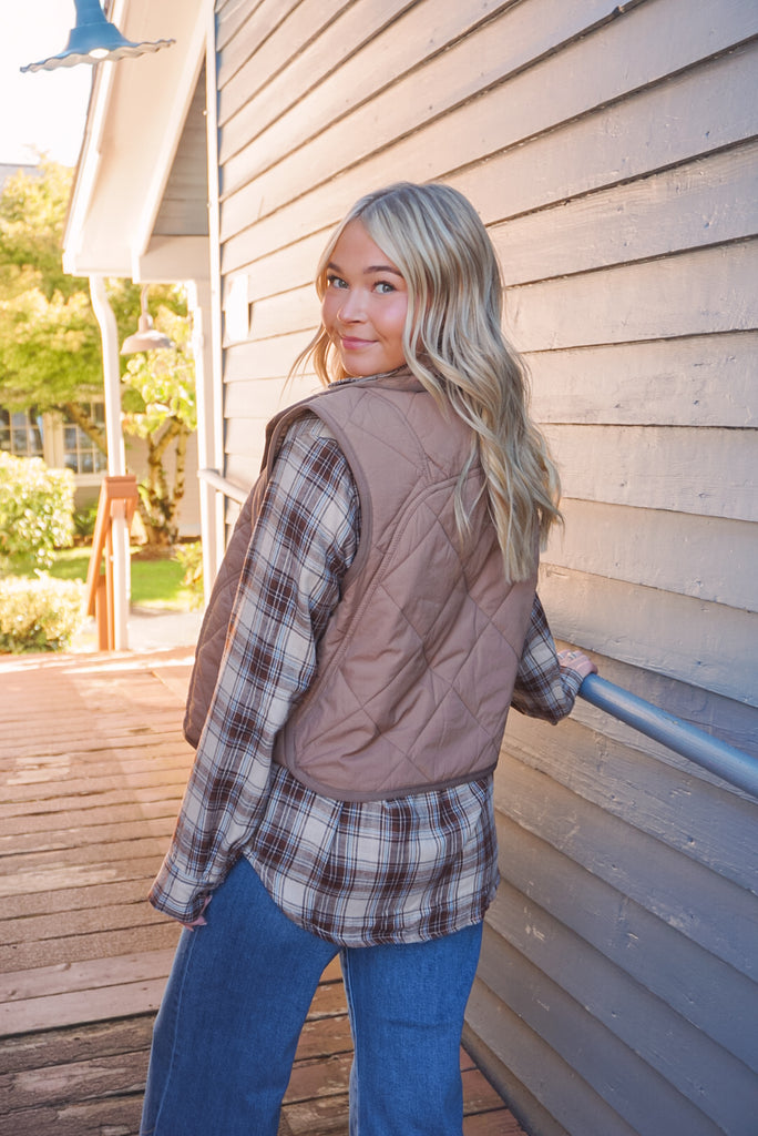 Stay warm and stylish with the Raina Vest. This quilted vest features a mock neckline and snap button down for versatility, while the lining adds extra coziness. Perfect for layering, this sleeveless vest is a perfect dupe at a fraction of the price!