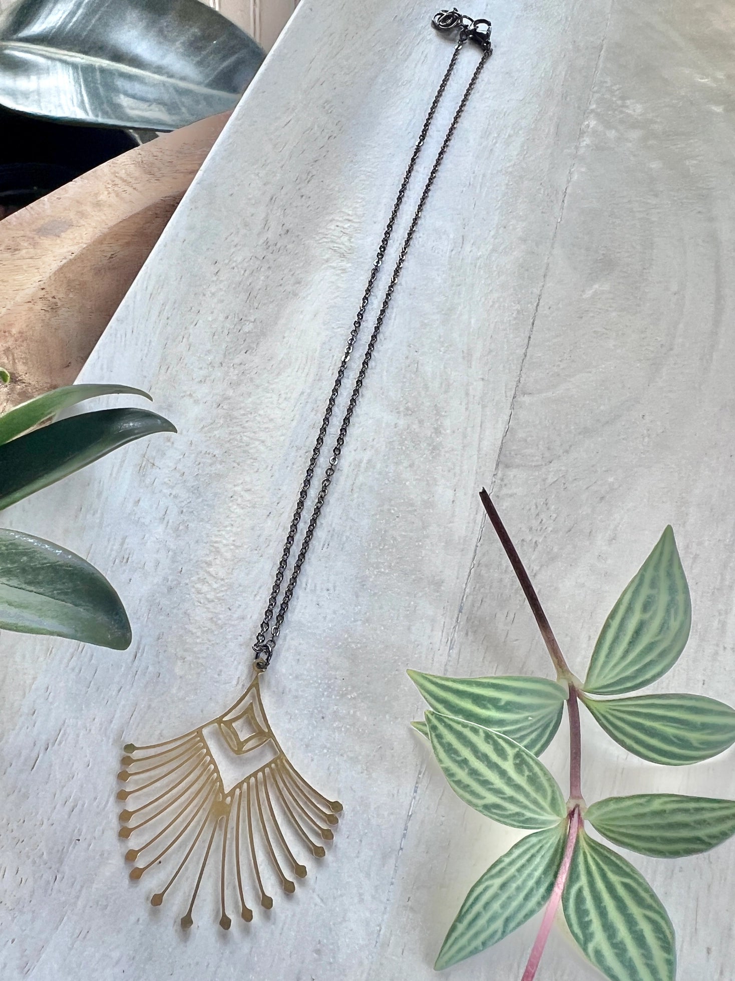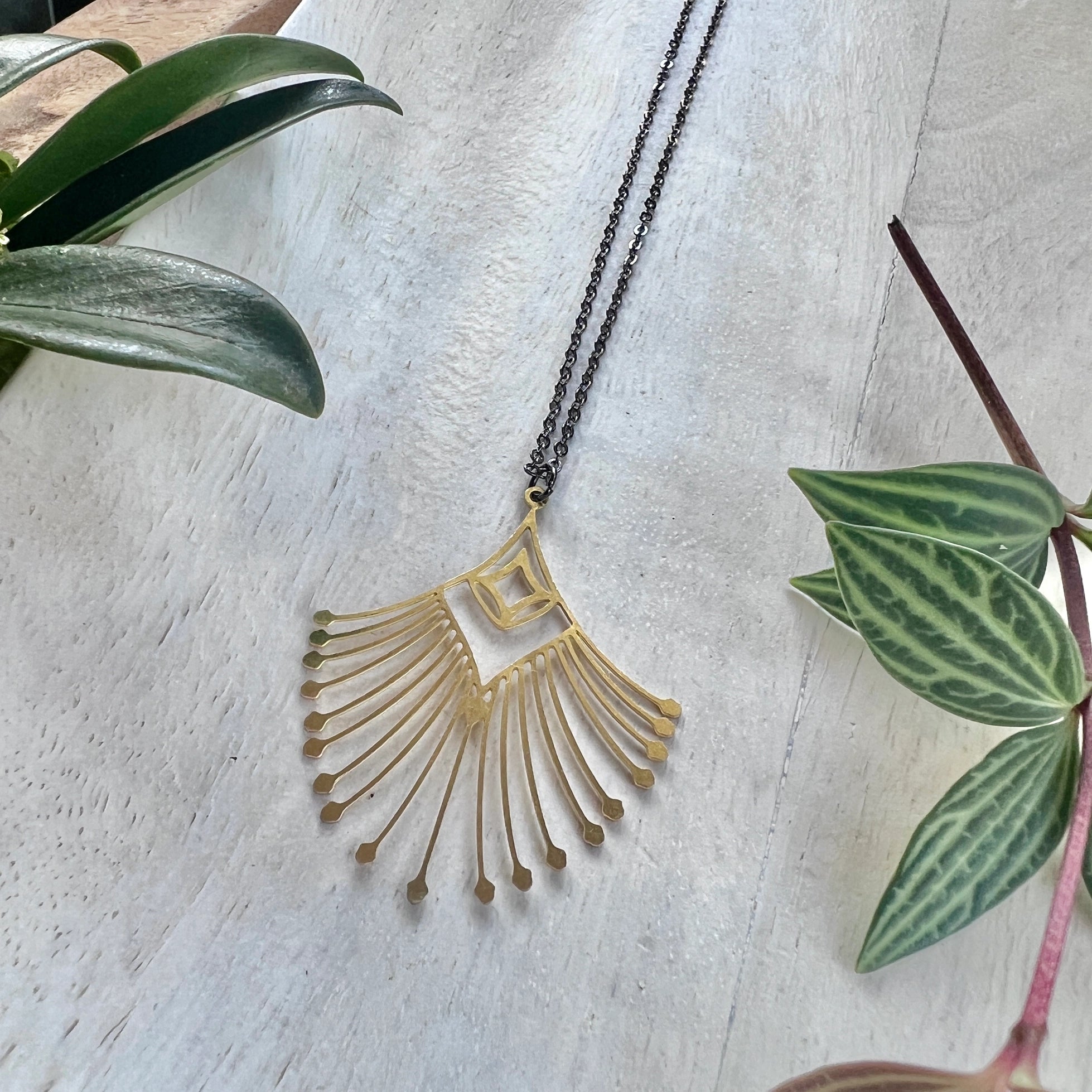 Elevate your outfit with the Leona Necklace, featuring a charming art deco brass pendant on an adjustable 16-18" gunmetal brass chain. The pendant measures 1.5 x 1.75", making it the perfect accessory for any occasion. Enjoy the versatility and timelessness of this beautiful necklace.