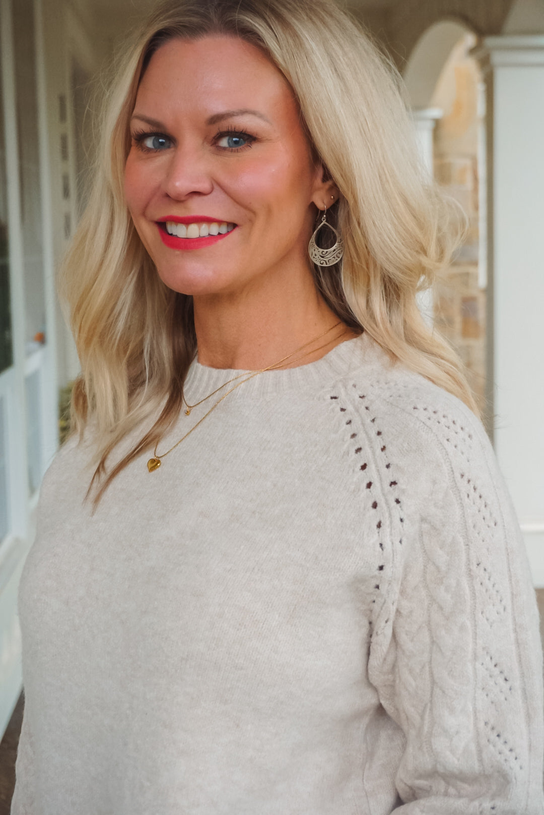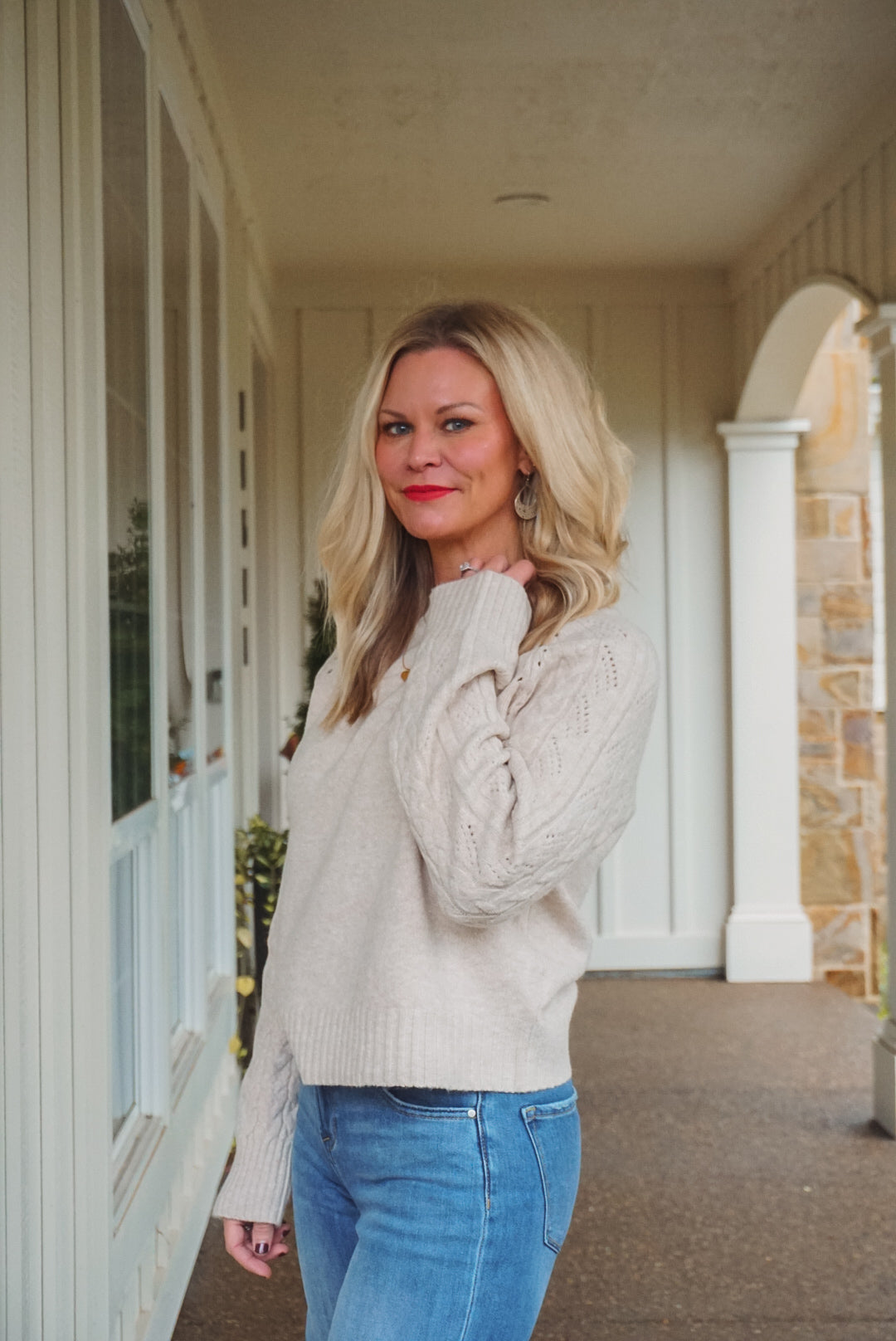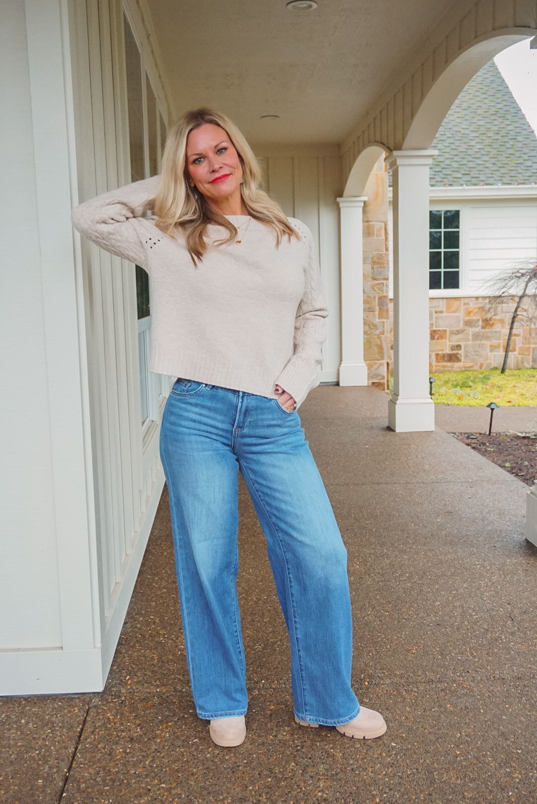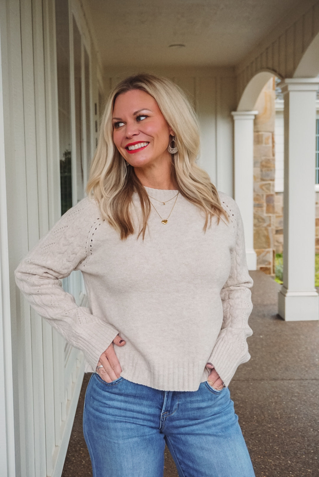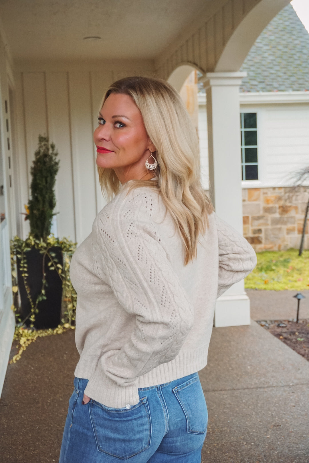 Get ready to cozy up in the Alena Sweater! Made from a luxurious, buttery soft knit fabric, this sweater features a classic crew neckline and relaxed fit for ultimate comfort. The cable knit detailing on the sleeves adds a touch of texture and style. Perfect for keeping you warm and stylish on those chilly days!