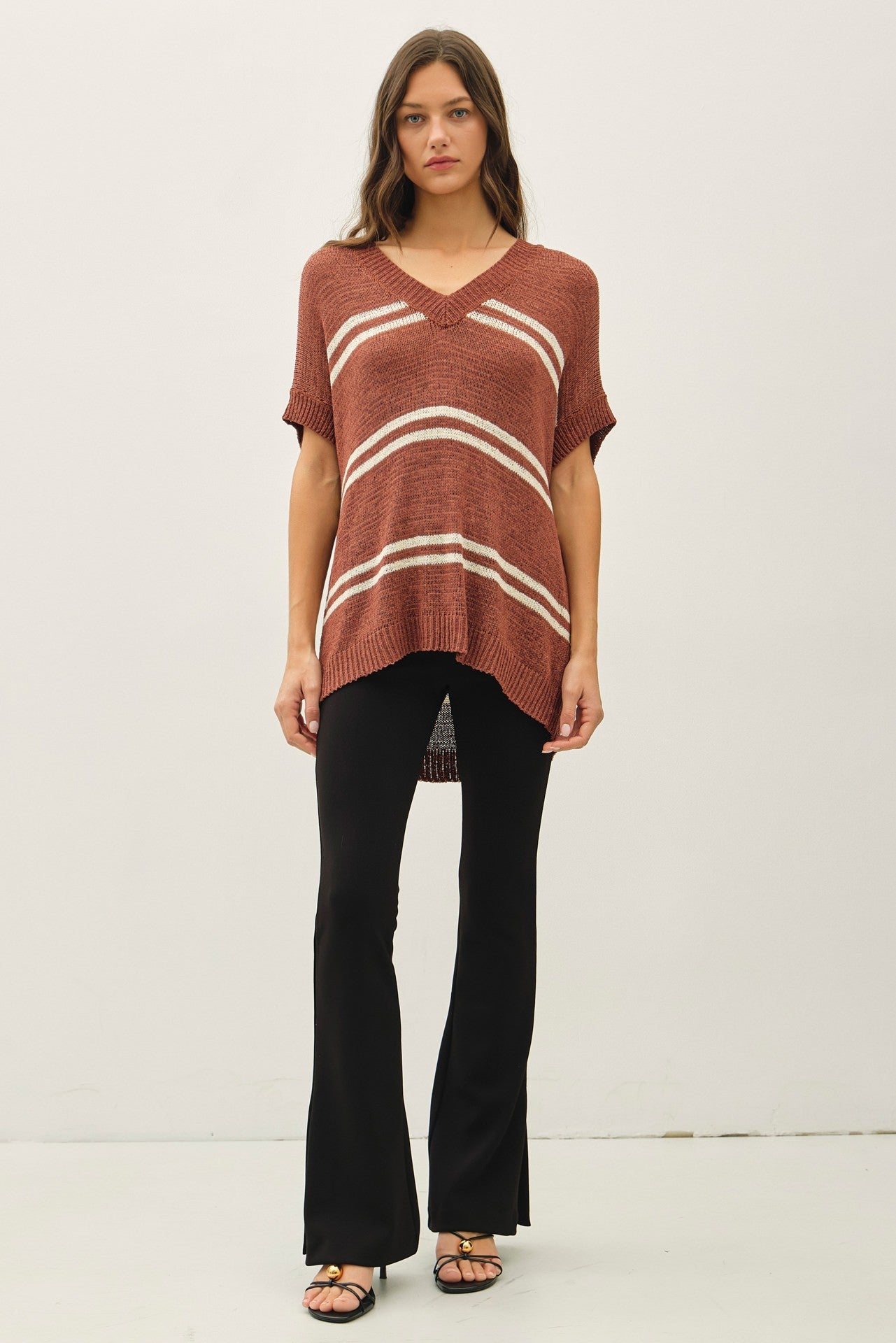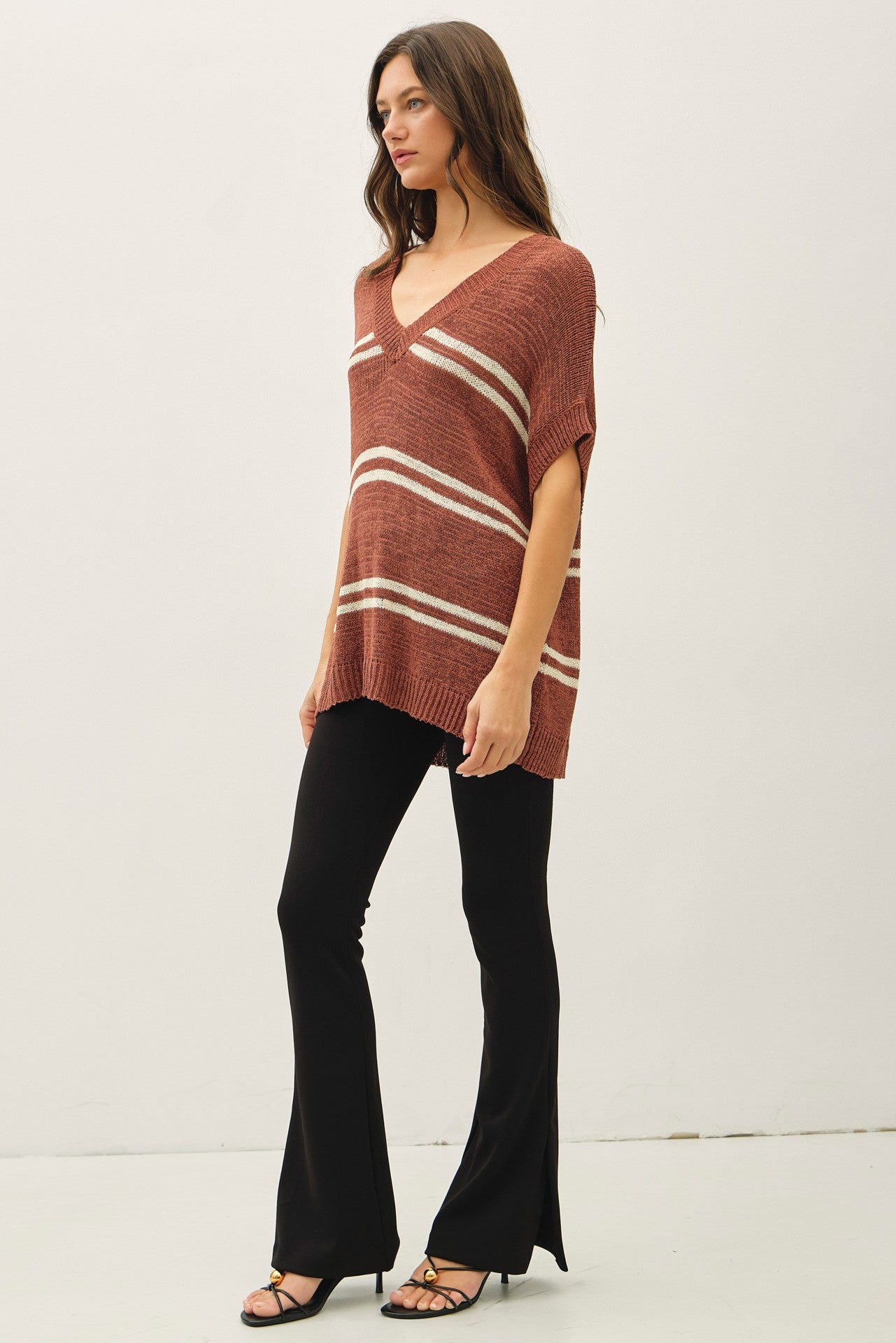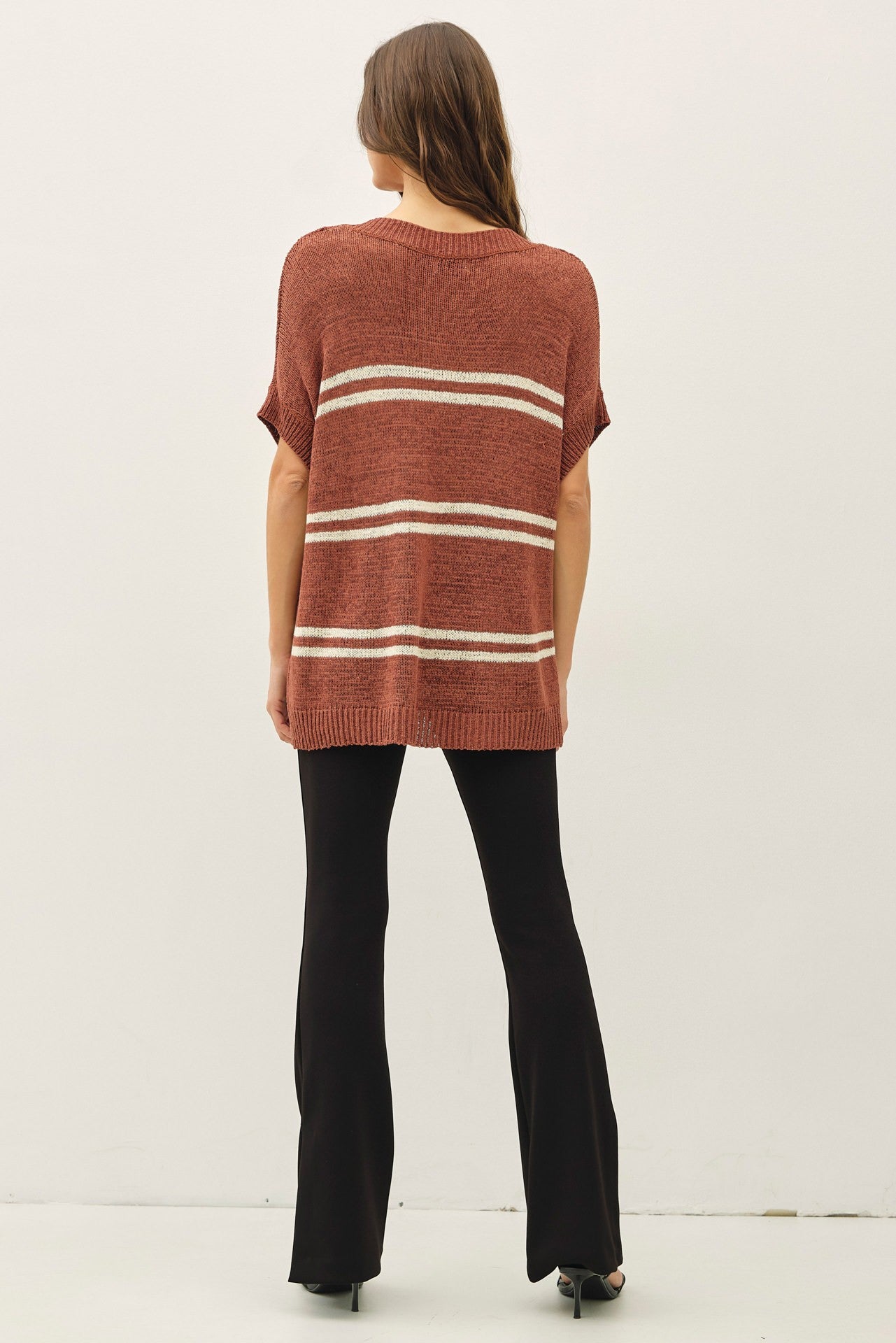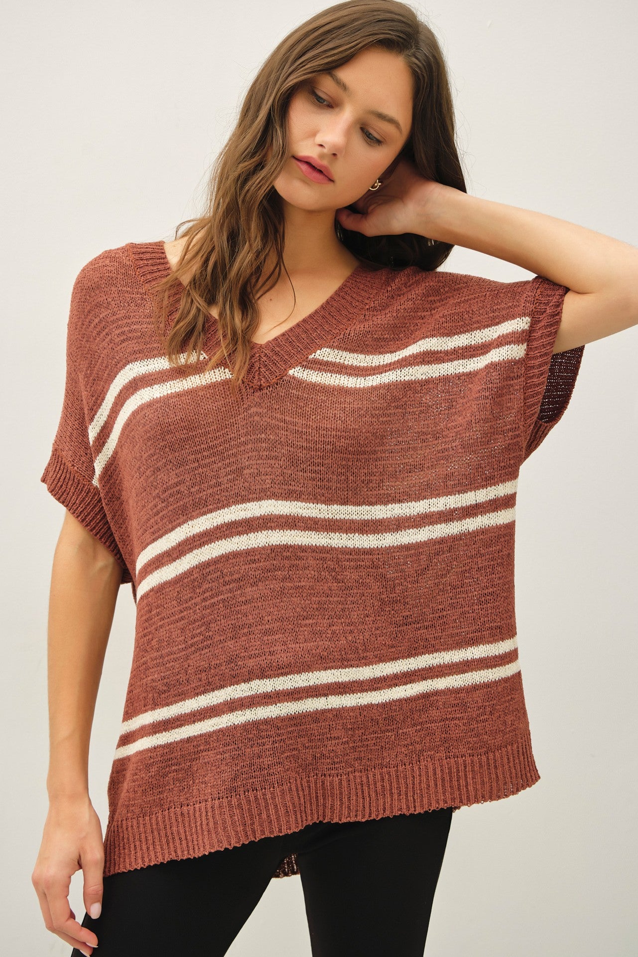 Meet the Nika Sweater: a lightweight, breathable piece designed for comfort. Its oversized, relaxed fit and cap sleeves make it perfect for layering or wearing solo. The stylish V-neck and large double stripes add a chic touch, making it an ideal choice for casual outings or cozy days at home.