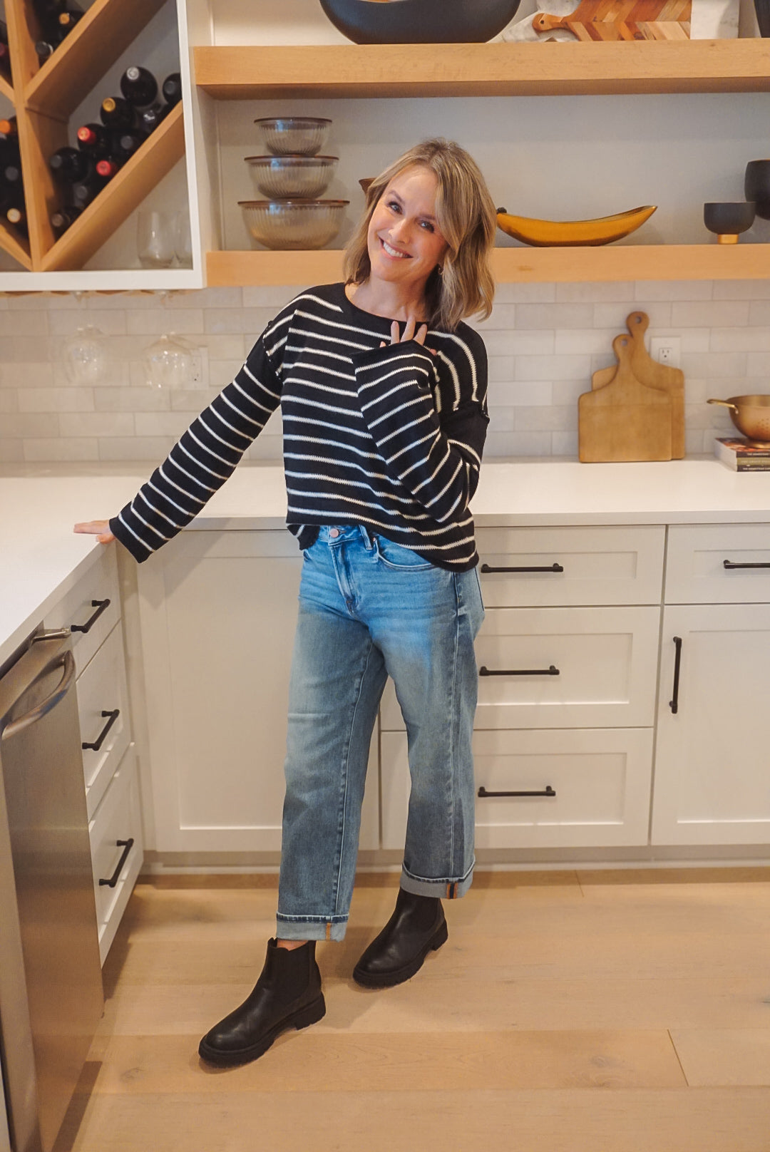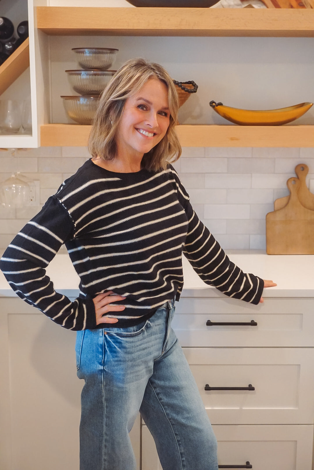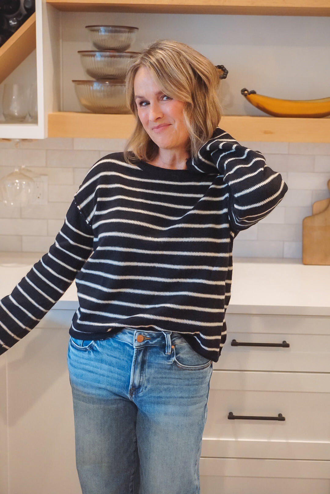 A classic stripe pullover sweater top featured in a super soft fabric, slouchy silhouette, round neckline, exposed seam detailing and a dropped shoulder. Sure to be a favorite to pair with staple denim, a tailored trouser or any skirt. This pullover will be your favorite throw-on-and-go sweater this season.