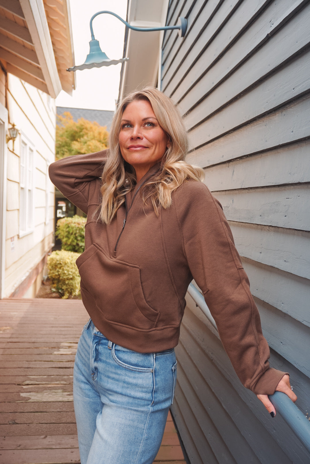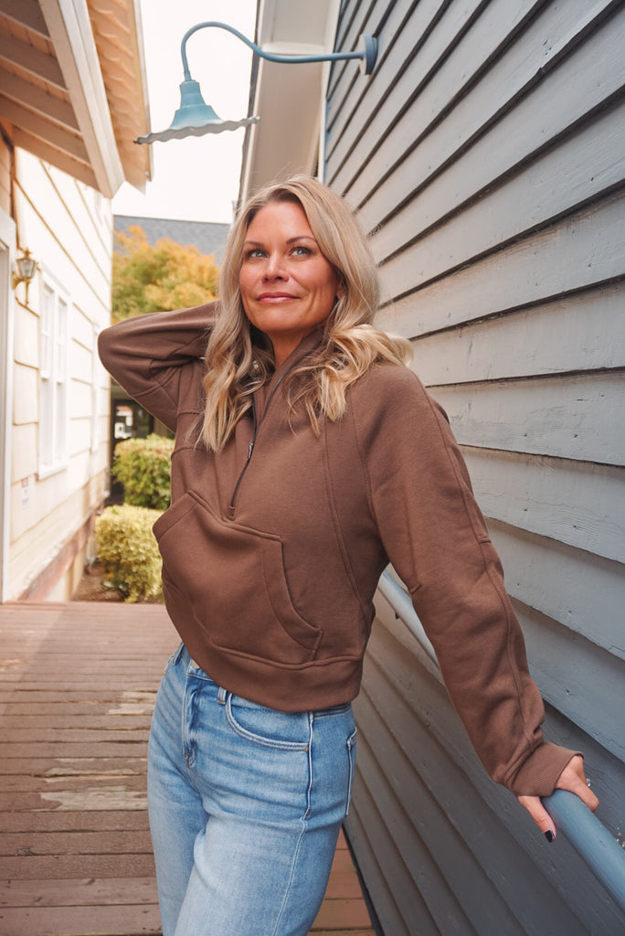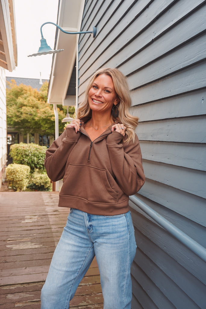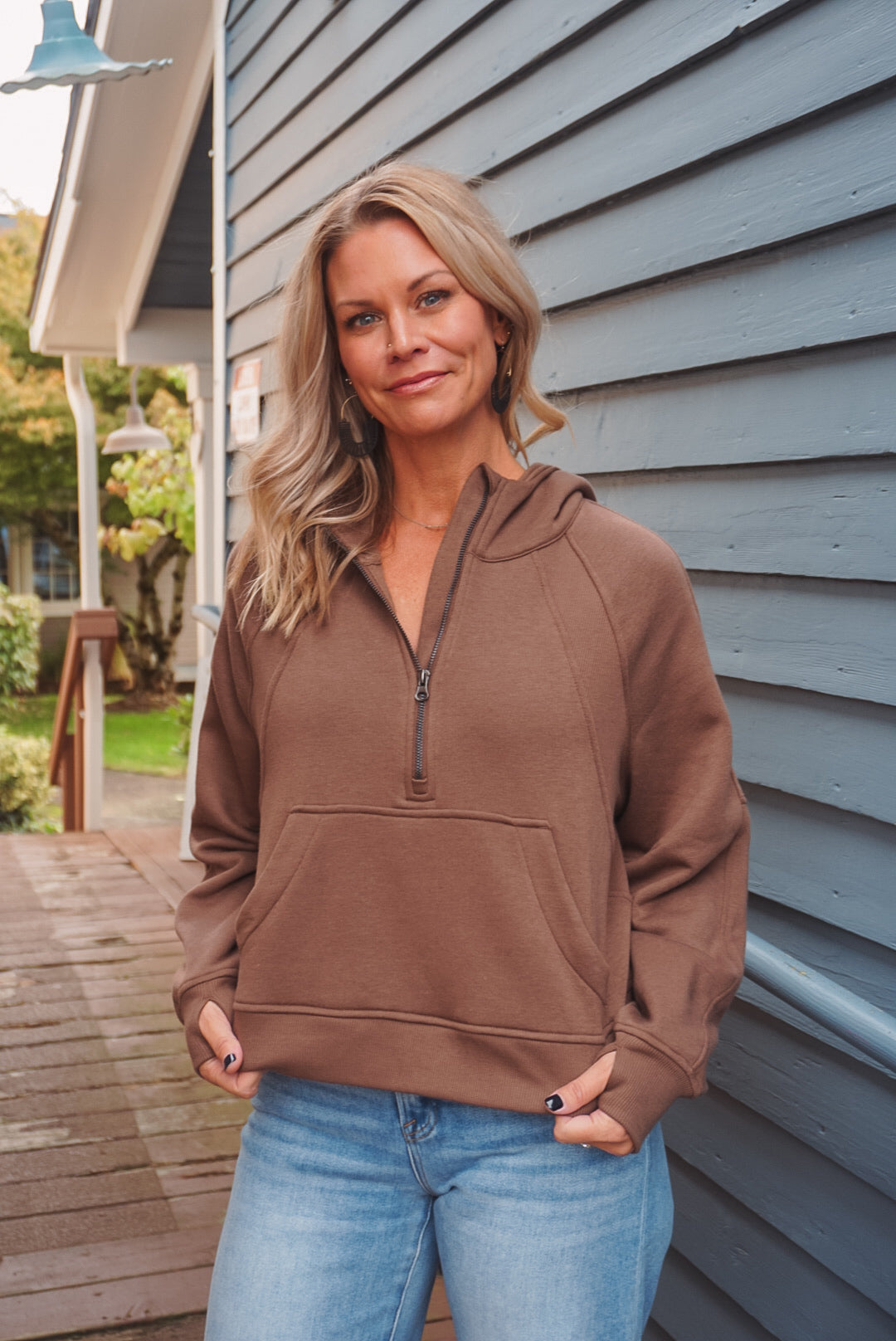 Stay cozy and stylish with our Charlotte Quarter Zip Hoodie. This scuba hoodie features a quarter zip neckline and a front kangaroo pocket for added. The rich chocolate brown color and ribbed accents make this hoodie stand out, and the thumb holes add the perfect finishing touch. Pair with denim or leggings for an effortlessly cozy wear!
