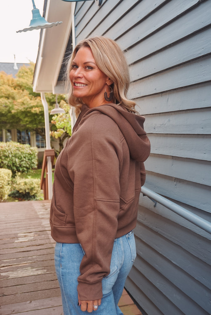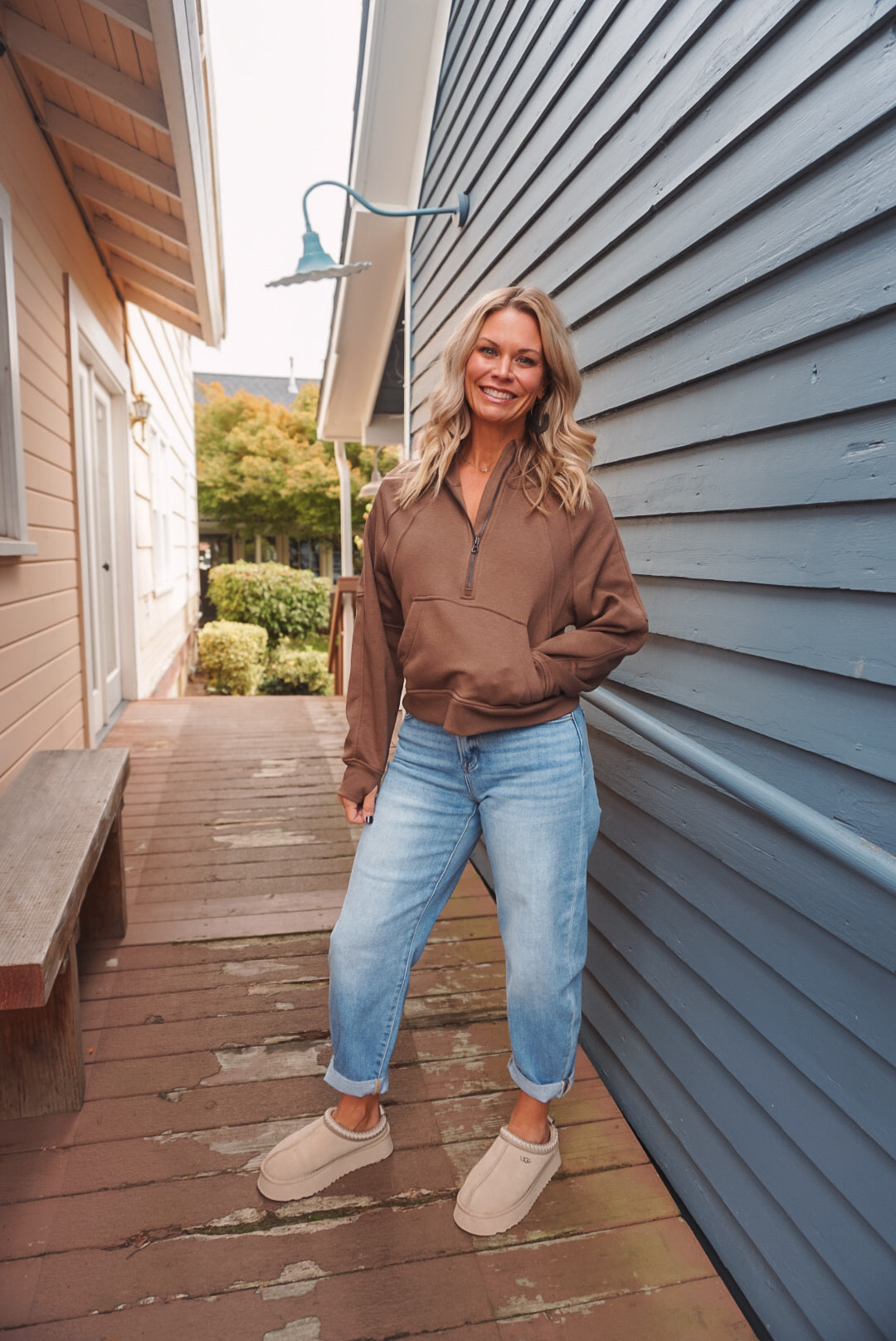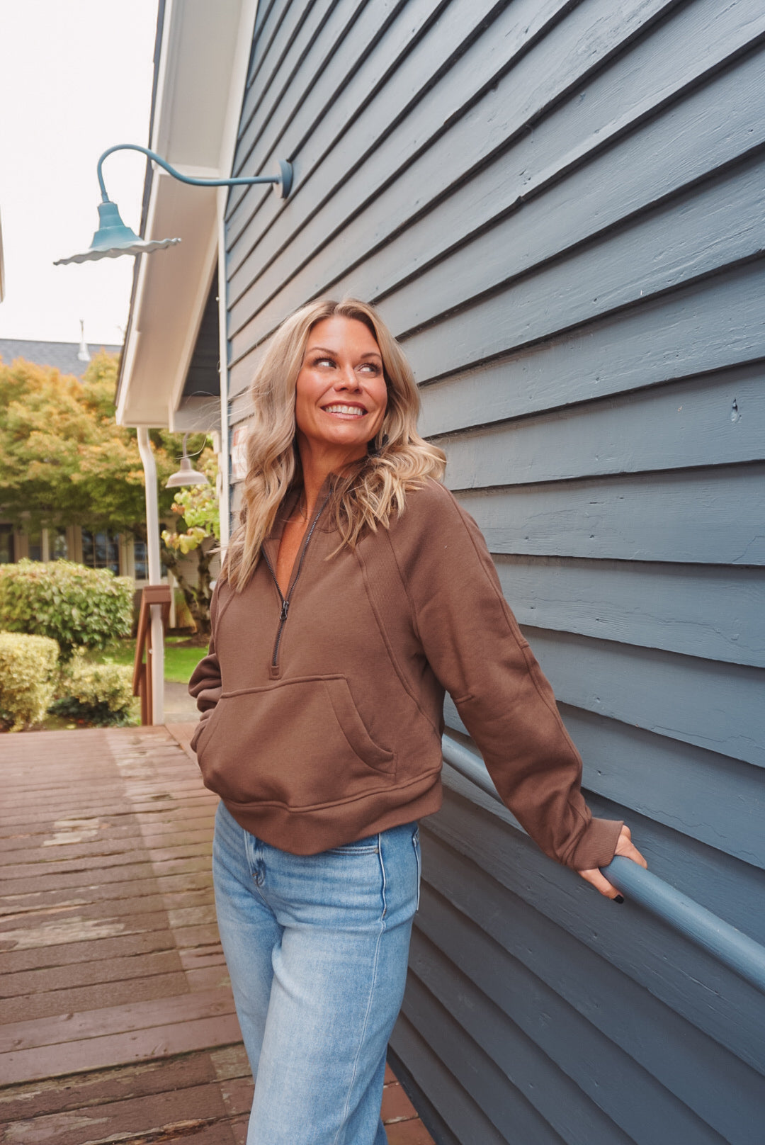 Stay cozy and stylish with our Charlotte Quarter Zip Hoodie. This scuba hoodie features a quarter zip neckline and a front kangaroo pocket for added. The rich chocolate brown color and ribbed accents make this hoodie stand out, and the thumb holes add the perfect finishing touch. Pair with denim or leggings for an effortlessly cozy wear!