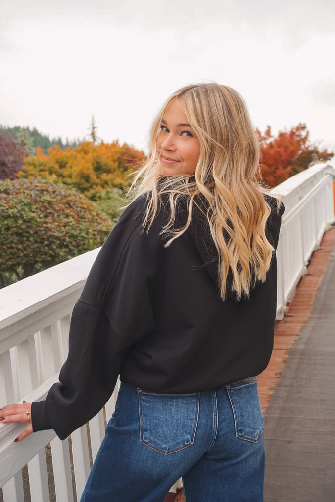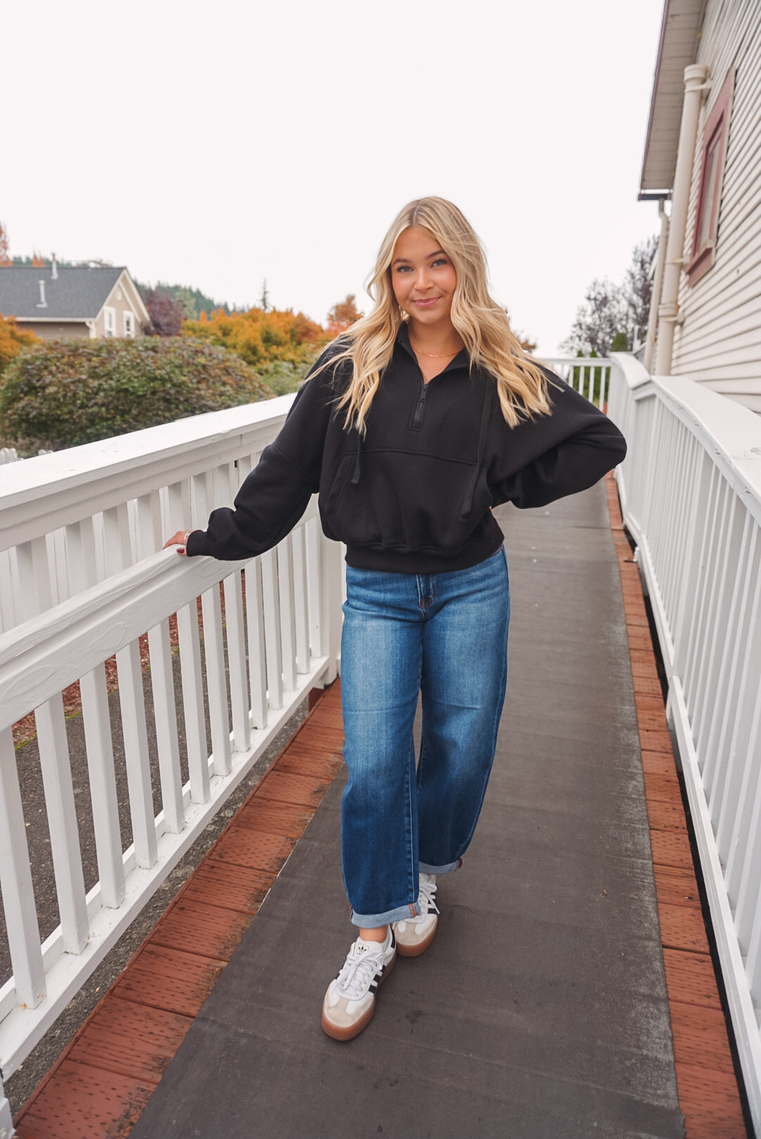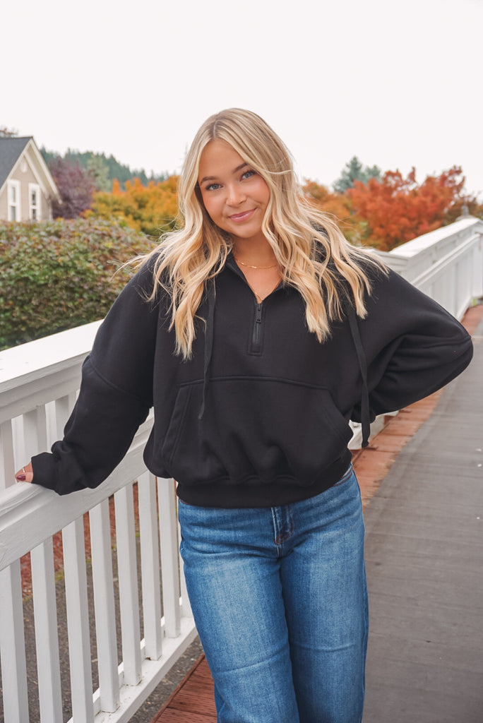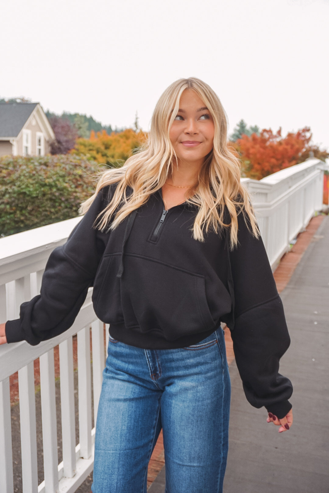 Introducing the Lulu Quarter Zip Hoodie, made with buttery soft fabric for ultimate comfort. Featuring a quarter zip neckline, drawstring hood, and front kangaroo pocket. Complete with a relaxed slouchy fit and cuffed long sleeves, this hoodie is perfect for lounging or running errands.