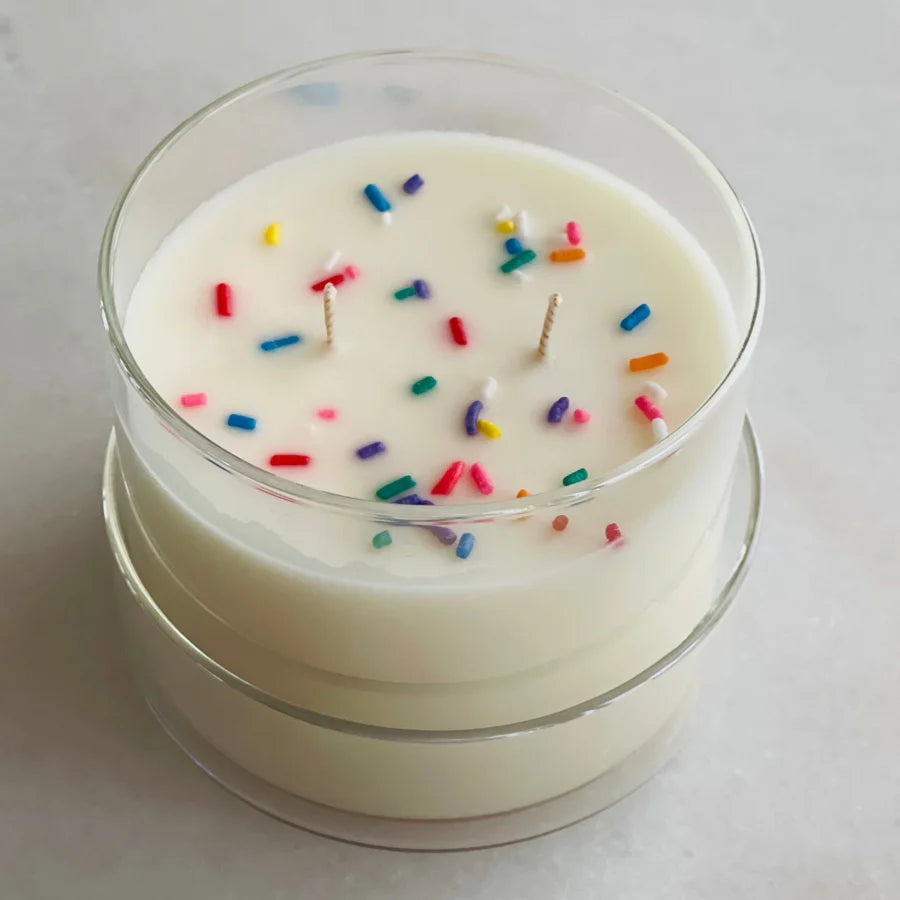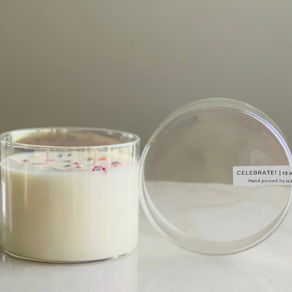 This gorgeous iridescent glass vessel inspires you to Celebrate! This vessel includes 2 wicks and you can visibly see the glow through the glass when burned. When you are not burning your candle, you can top it off with a matching glass lid. The burn hours are approximately 55-60 hours.