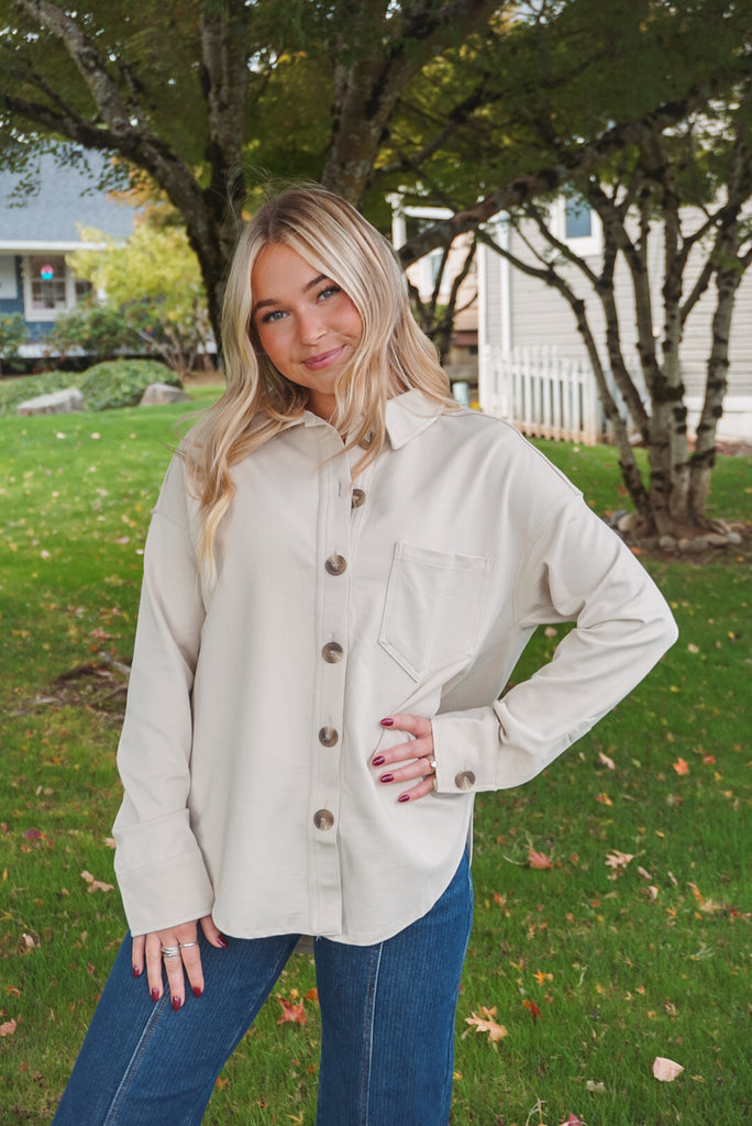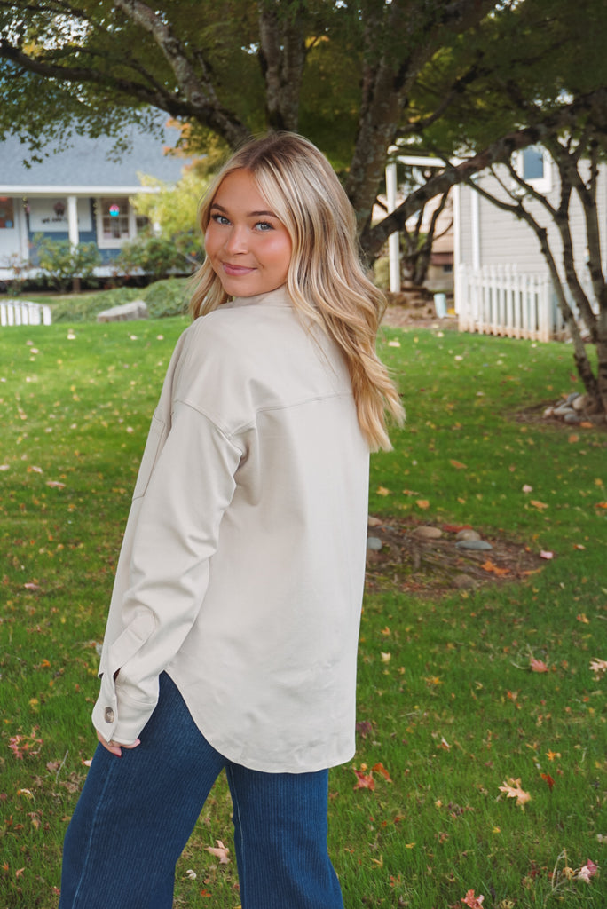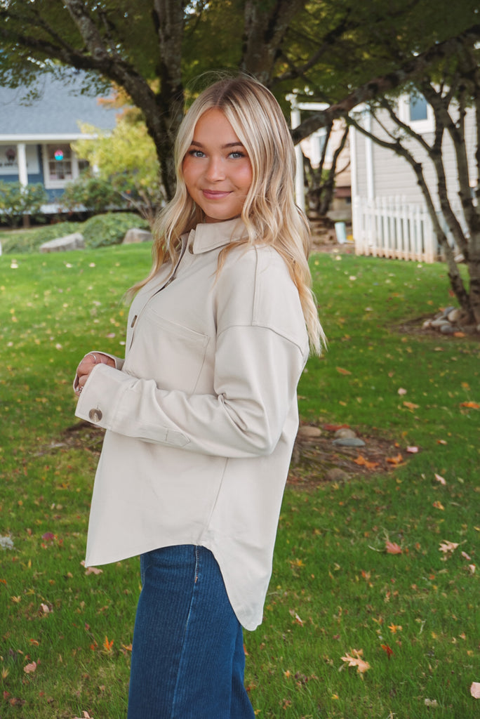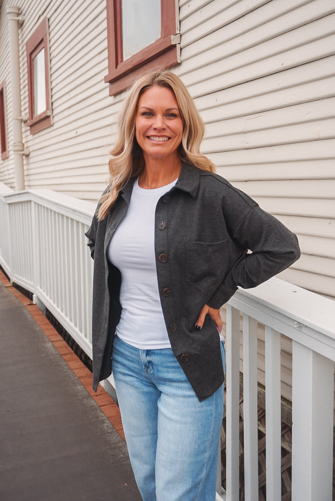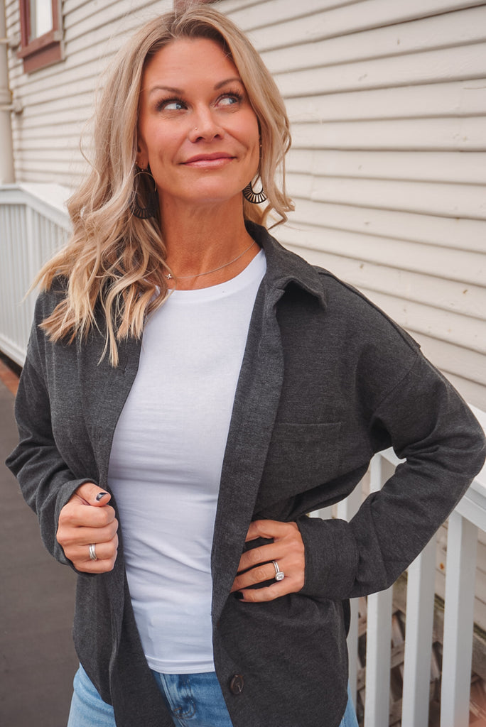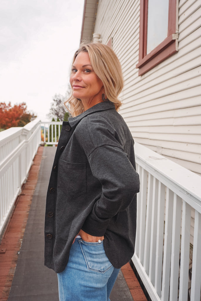 The Chase Shacket: a collared, button-down top perfect for all occasions. With long sleeves, a single pocket, and a unique U hem, this solid shacket is both stylish and practical. And, with its unlined design, it's perfect for layering without all the bulk. Available in two neutral hues, charcoal & cream.