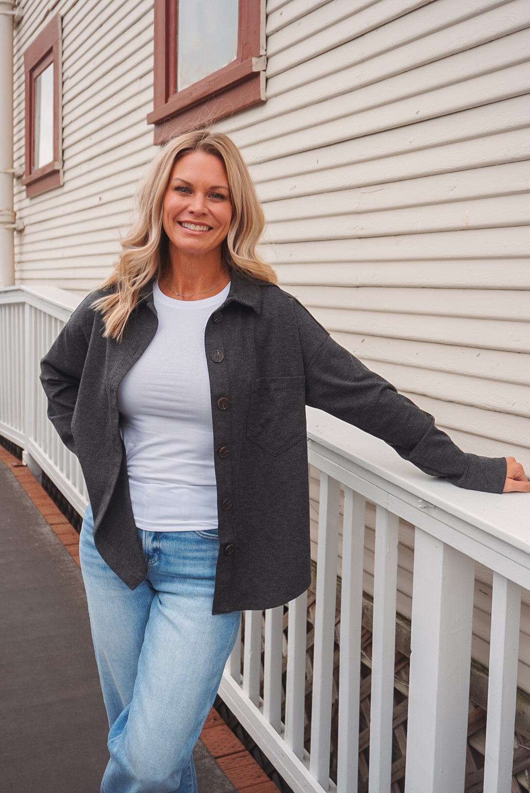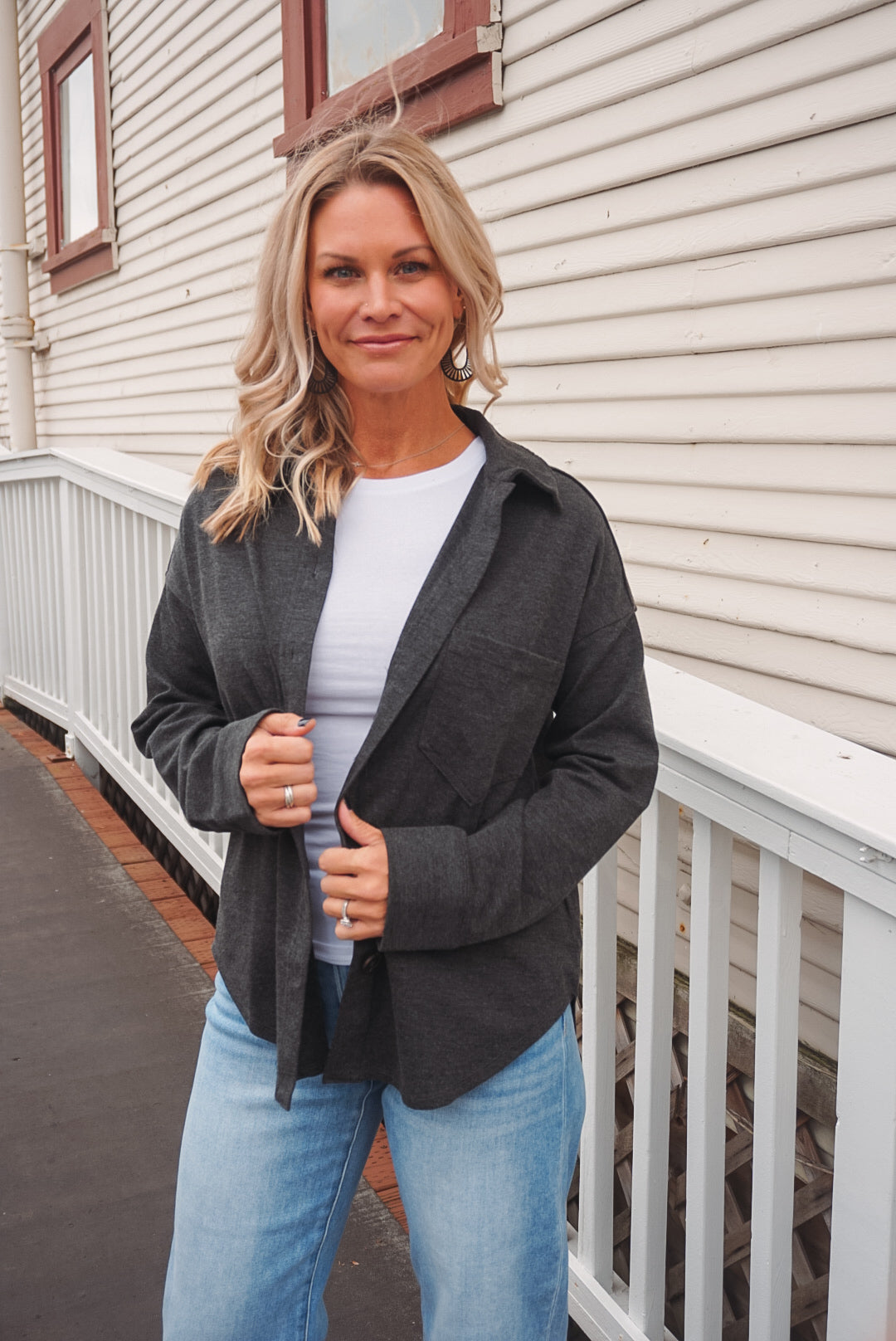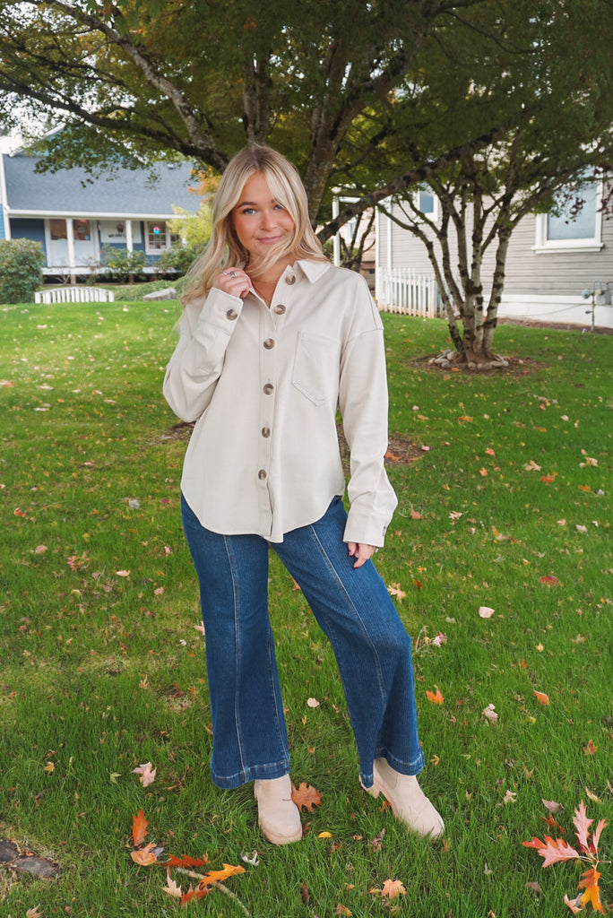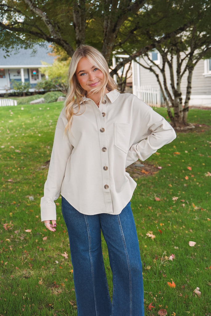 The Chase Shacket: a collared, button-down top perfect for all occasions. With long sleeves, a single pocket, and a unique U hem, this solid shacket is both stylish and practical. And, with its unlined design, it's perfect for layering without all the bulk. Available in two neutral hues, charcoal & cream.