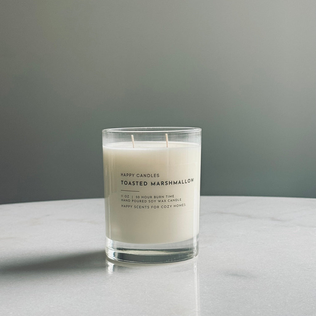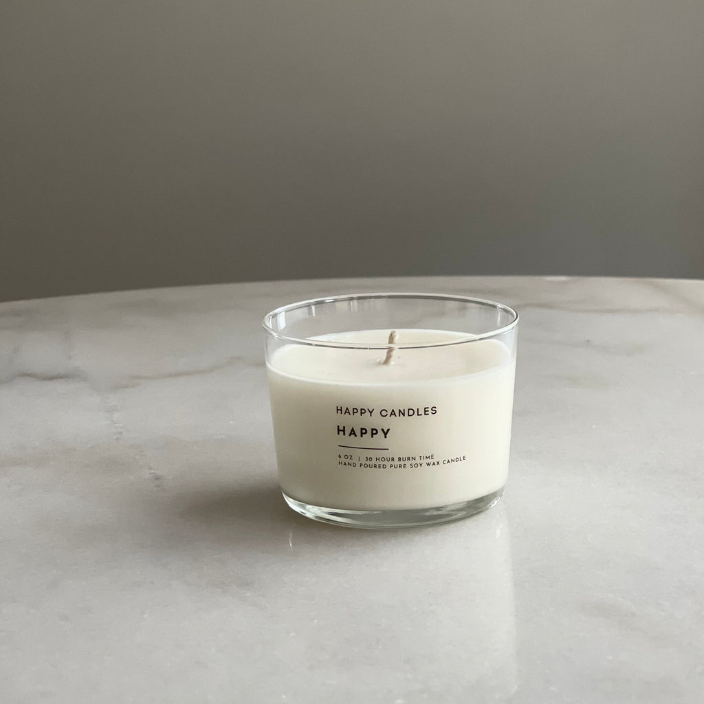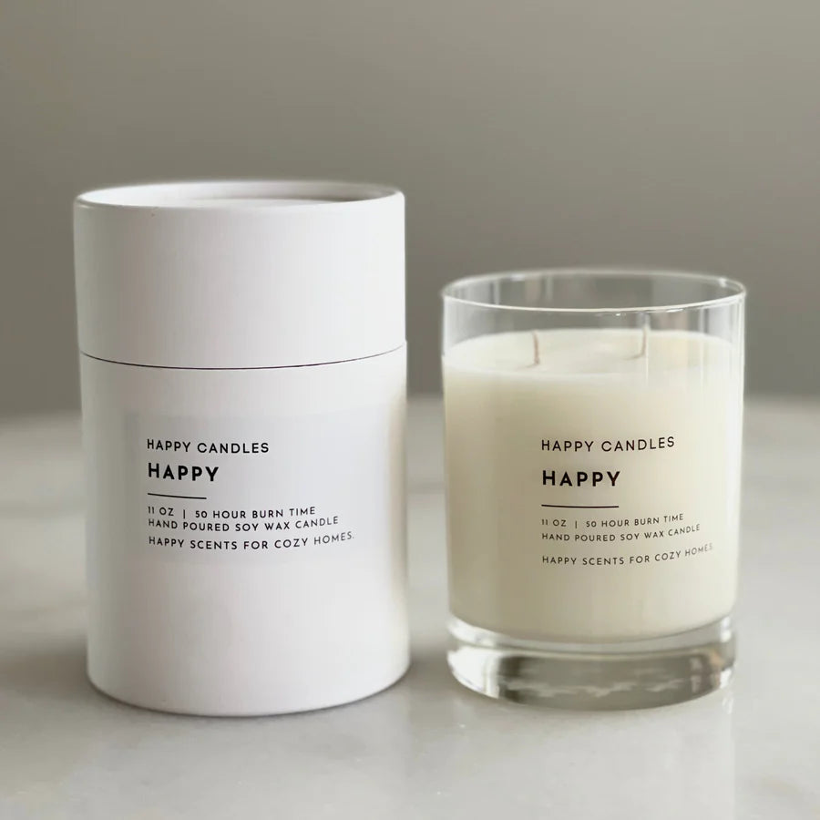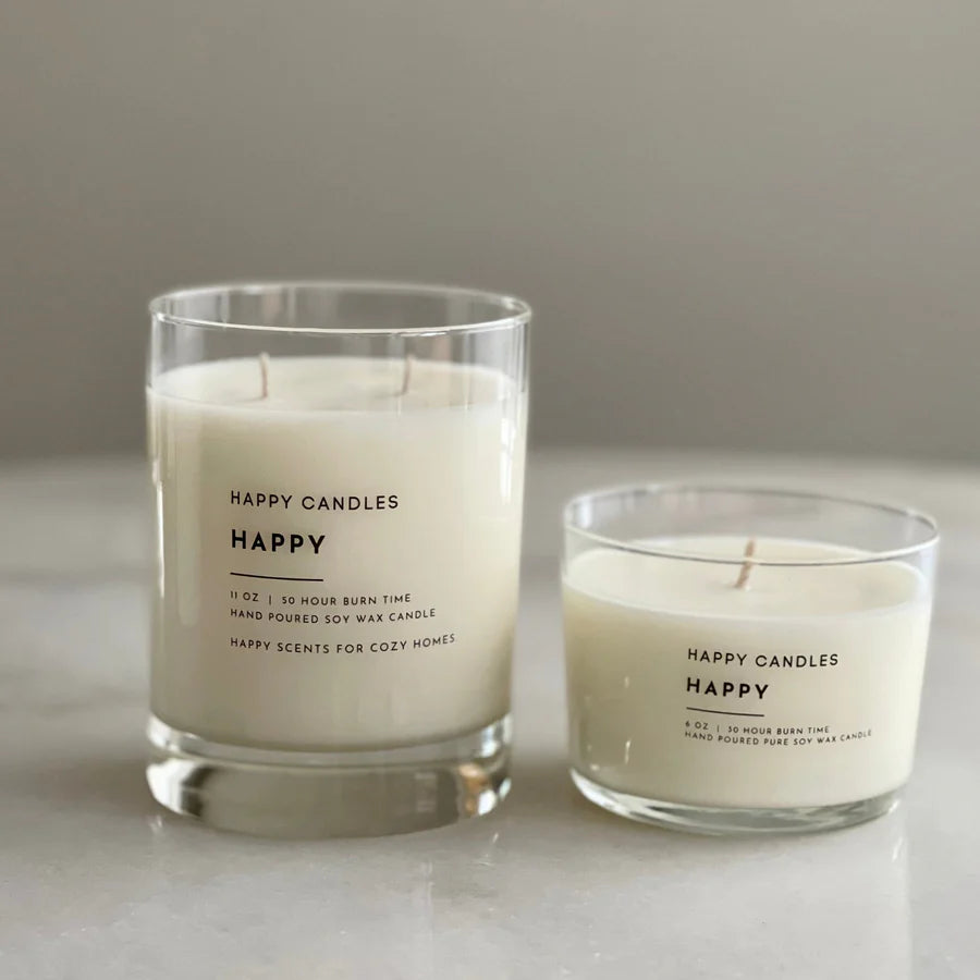 HAPPY CANDLES are hand poured with 100% soy wax and clean fragrance oils. They don't use chemicals to enhance the fragrance, nor do they blend the wax with other types of wax. They keep it clean and simple and that makes us HAPPY for us and you!