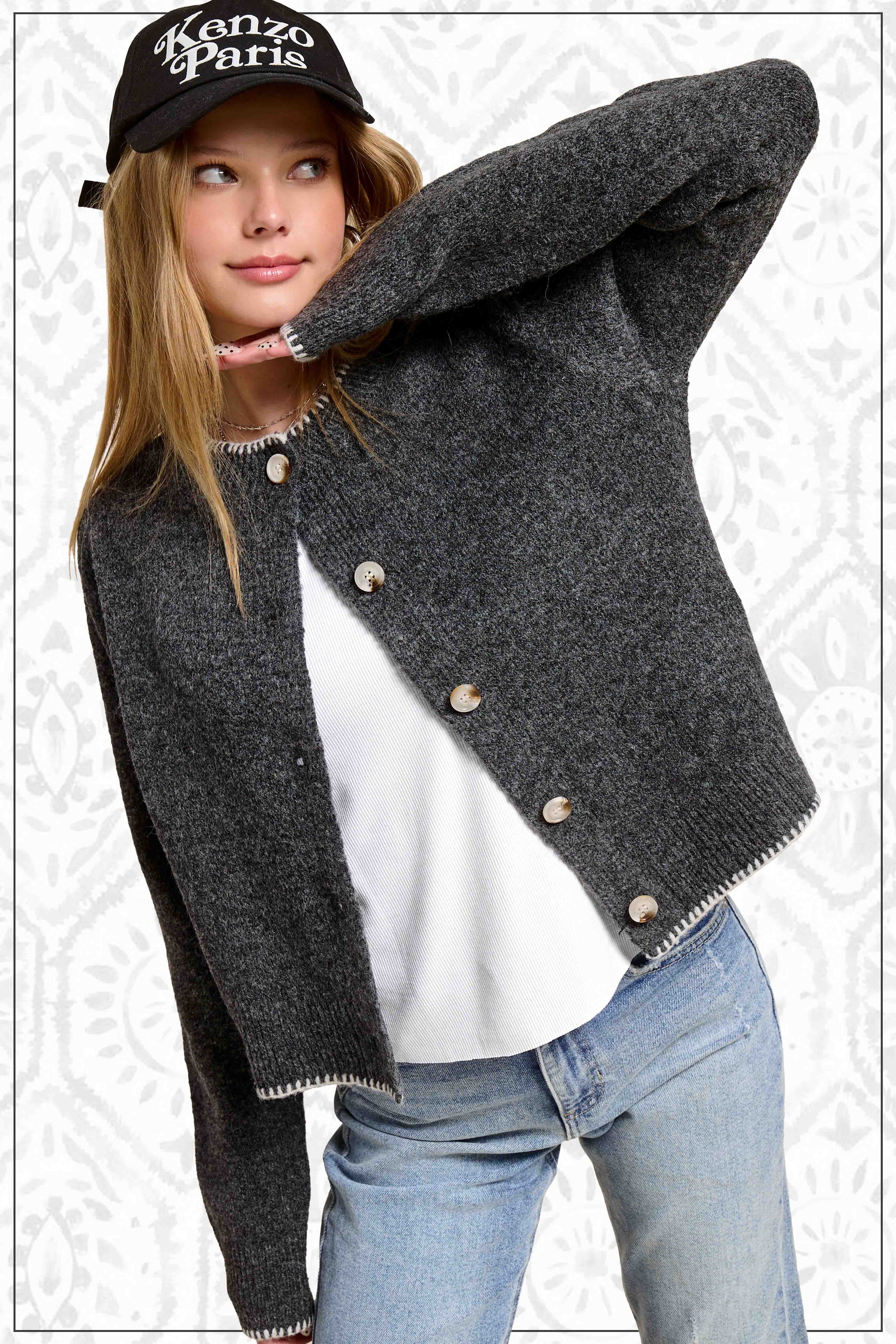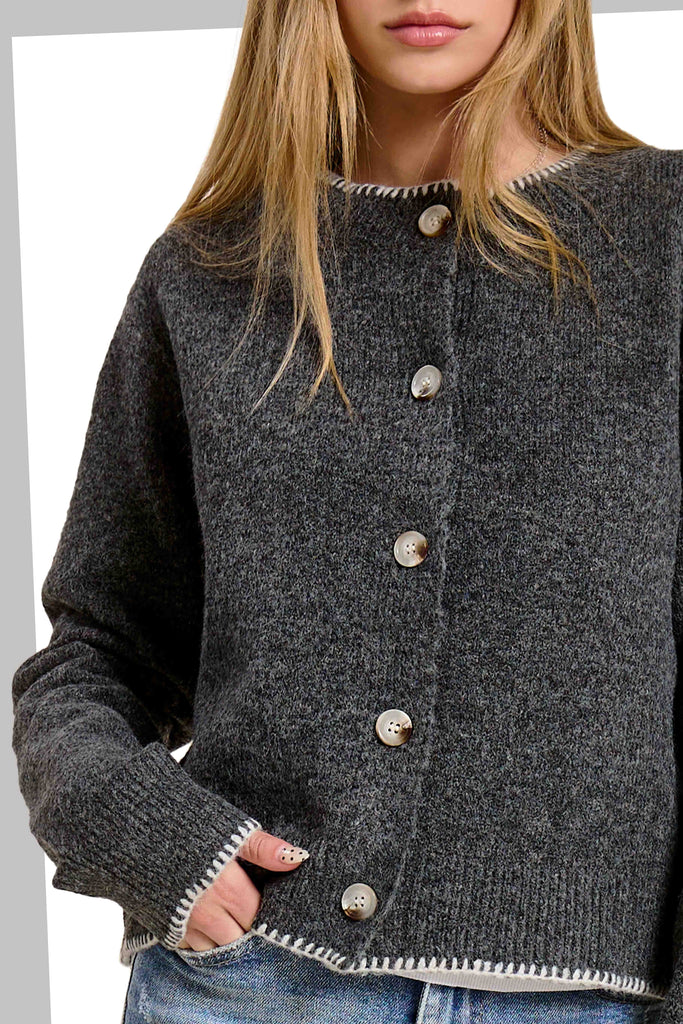 Elevate your layers with this soft, fuzzy cardigan featuring elegant marbled buttons along a vertical ribbed button band. The long sleeves, crew neckline, and waist hem are finished with contrast blanket stitch edges and ribbed cuffs for a refined touch. Stretchy and sophisticated, it's the perfect cozy-chic addition to your wardrobe.