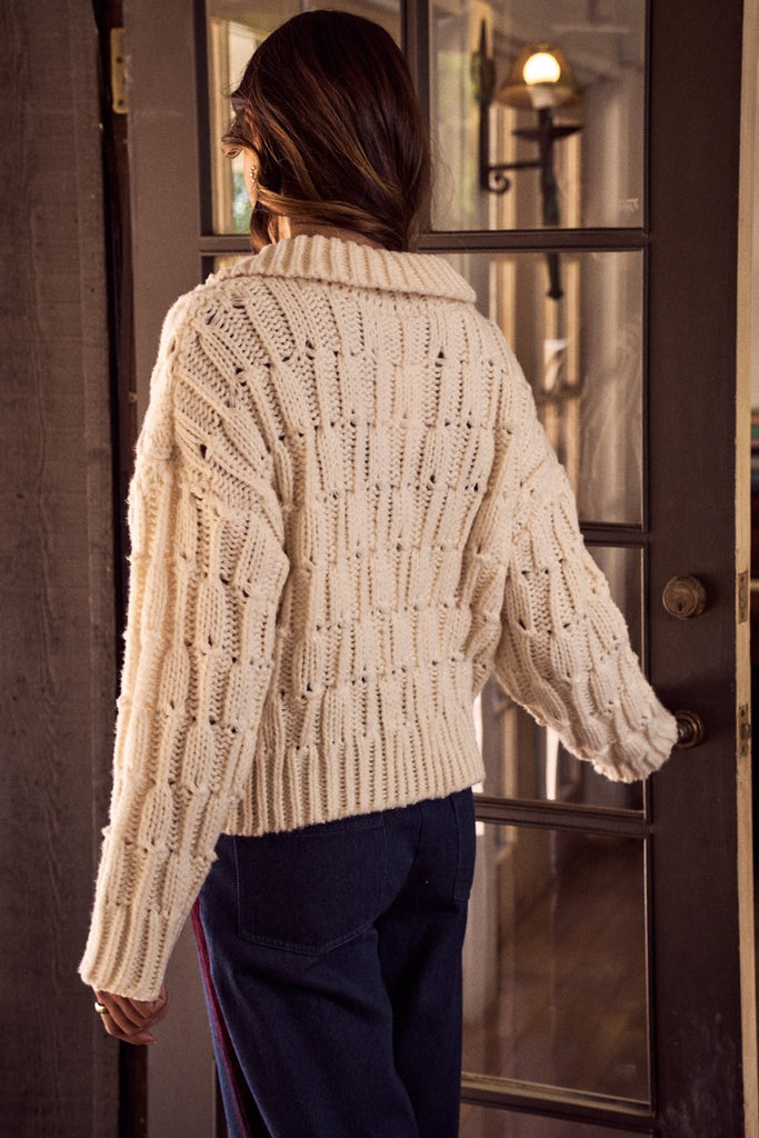 Get ready to cozy up in the Freya Sweater! This textured sweater top features a unique collared neckline and relaxed fit, making it the perfect choice for a casual day or a night out. With a v neckline, it's both comfortable and stylish. Say hello to your new go-to sweater!