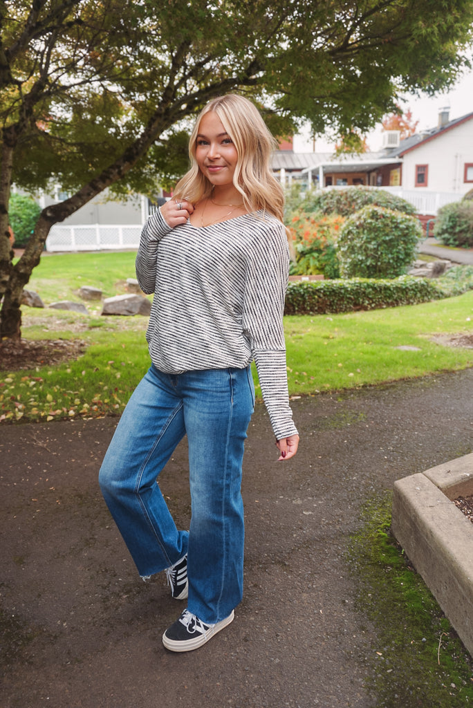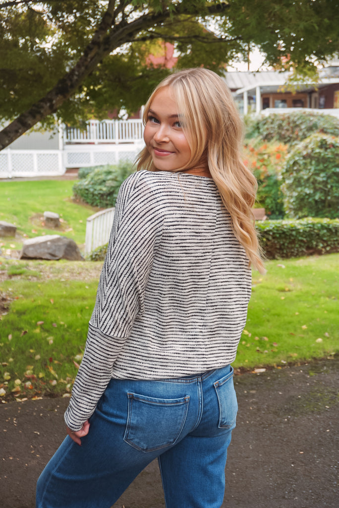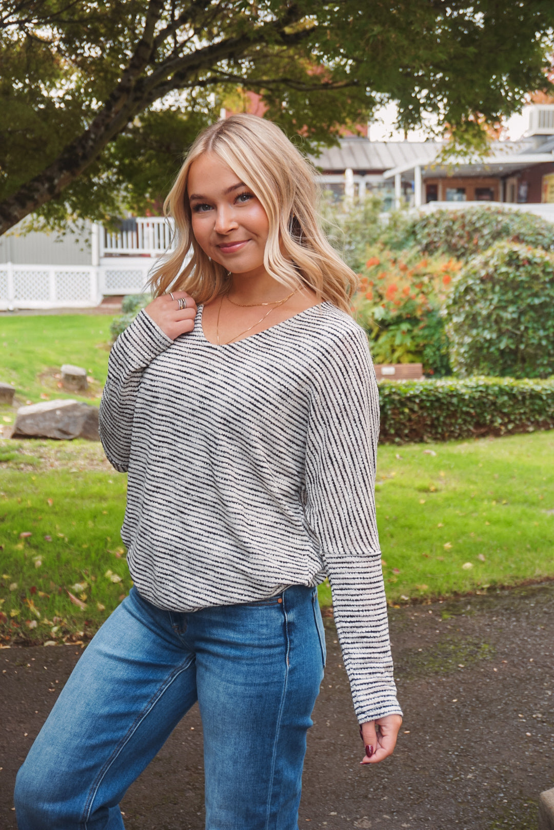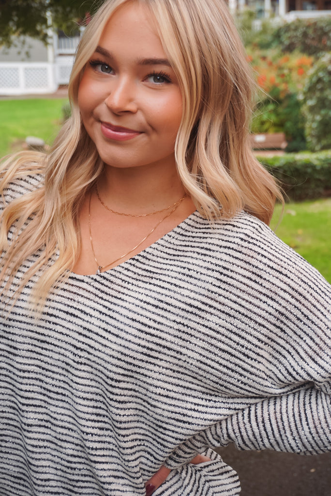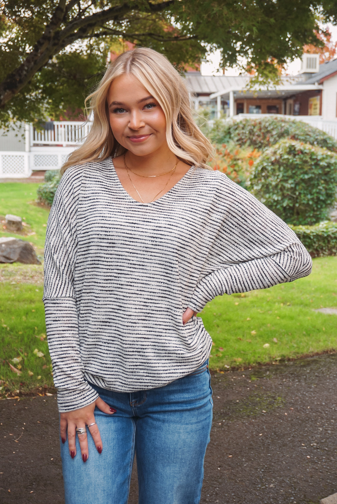 Meet your new go-to piece for casual days. The Lexi V Neck Dolman is designed with a flattering and easy-going v neckline, relaxed fit, and dolman sleeves that offer a lightweight and comfortable feel. The striped print and textured knit add a touch of style, making it perfect for any occasion.