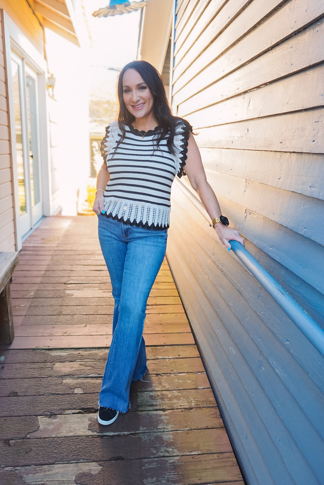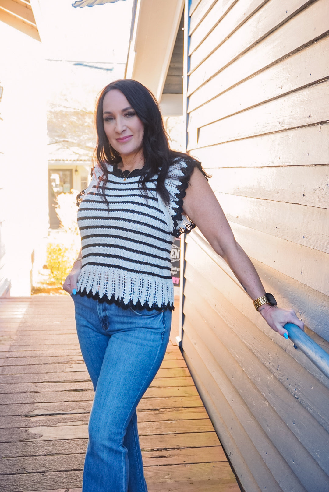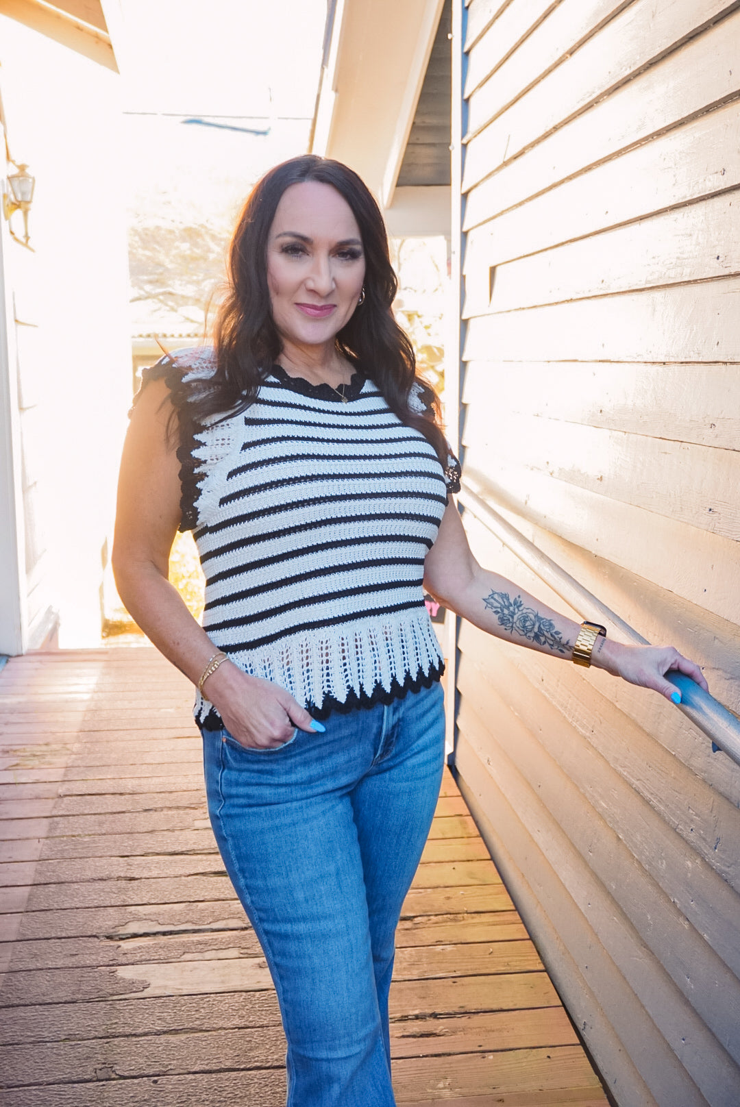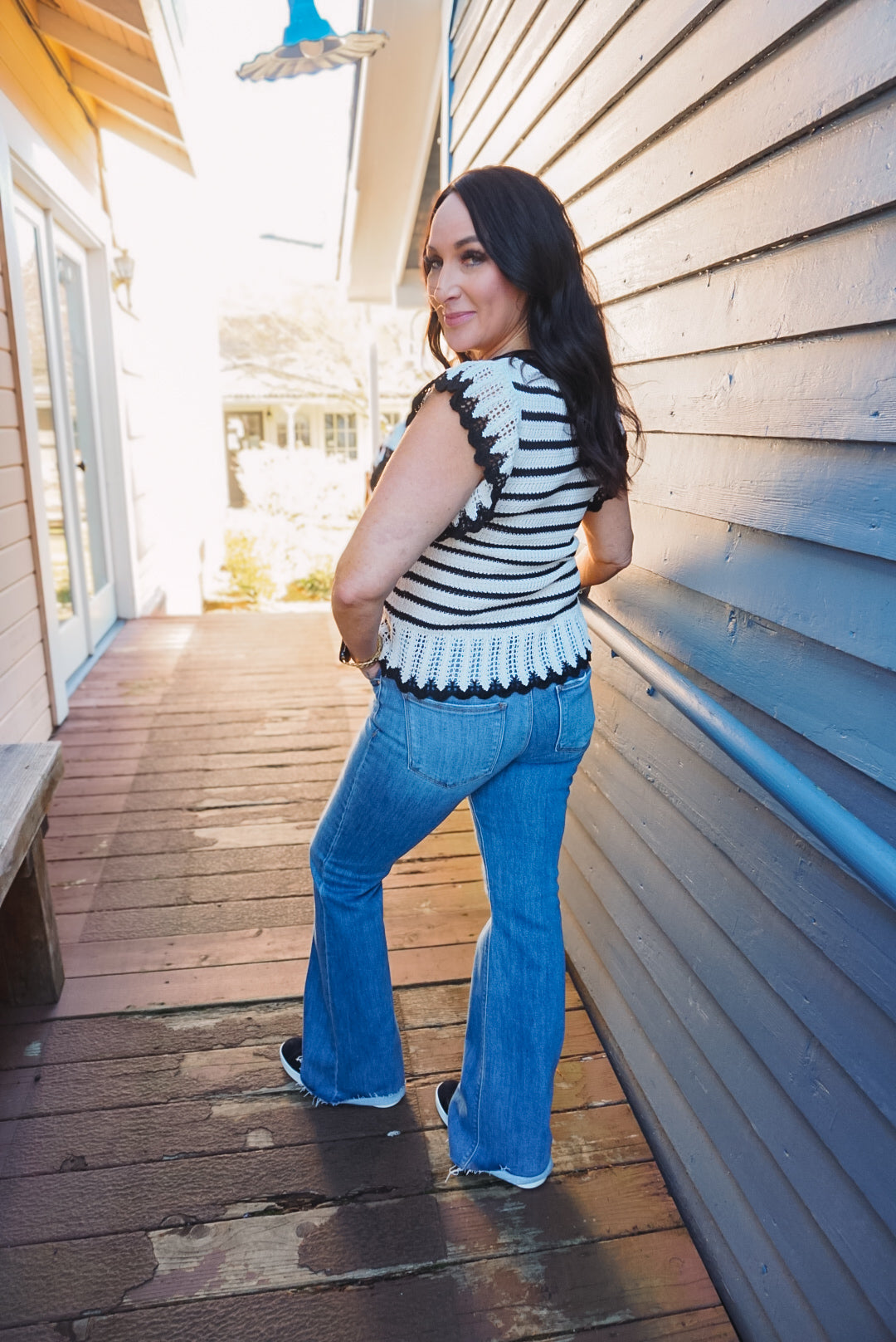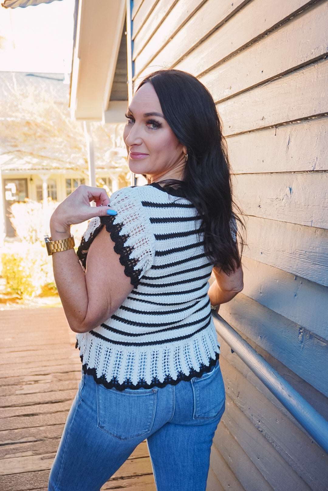 The Maelee Sweater Tank is a playful addition to any wardrobe. Featuring a charming striped print, adorable crochet flutter sleeves, and a ruffled crochet hem, this top adds a touch of whimsy to any outfit. The perfect tank for your next vacay in the sun!