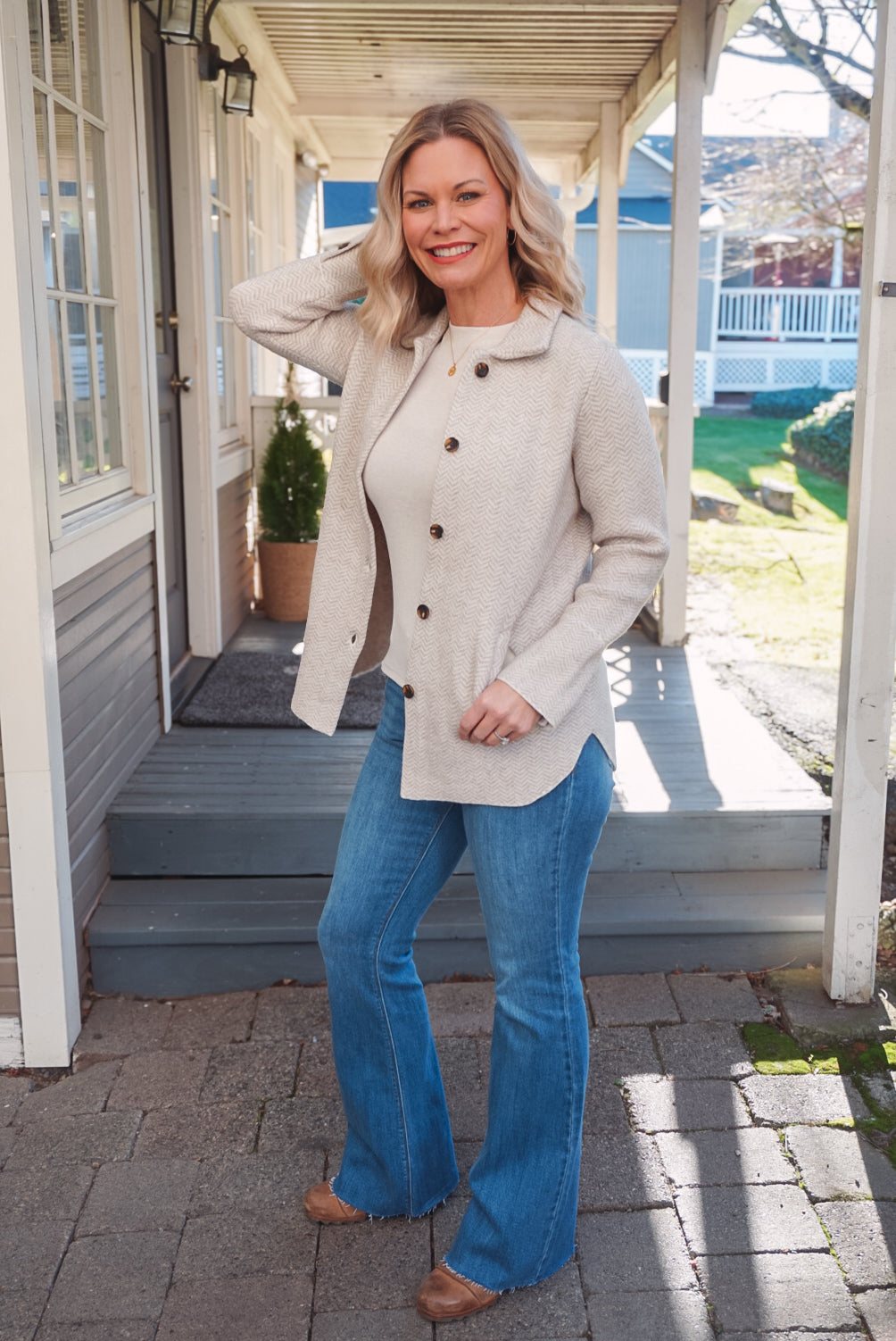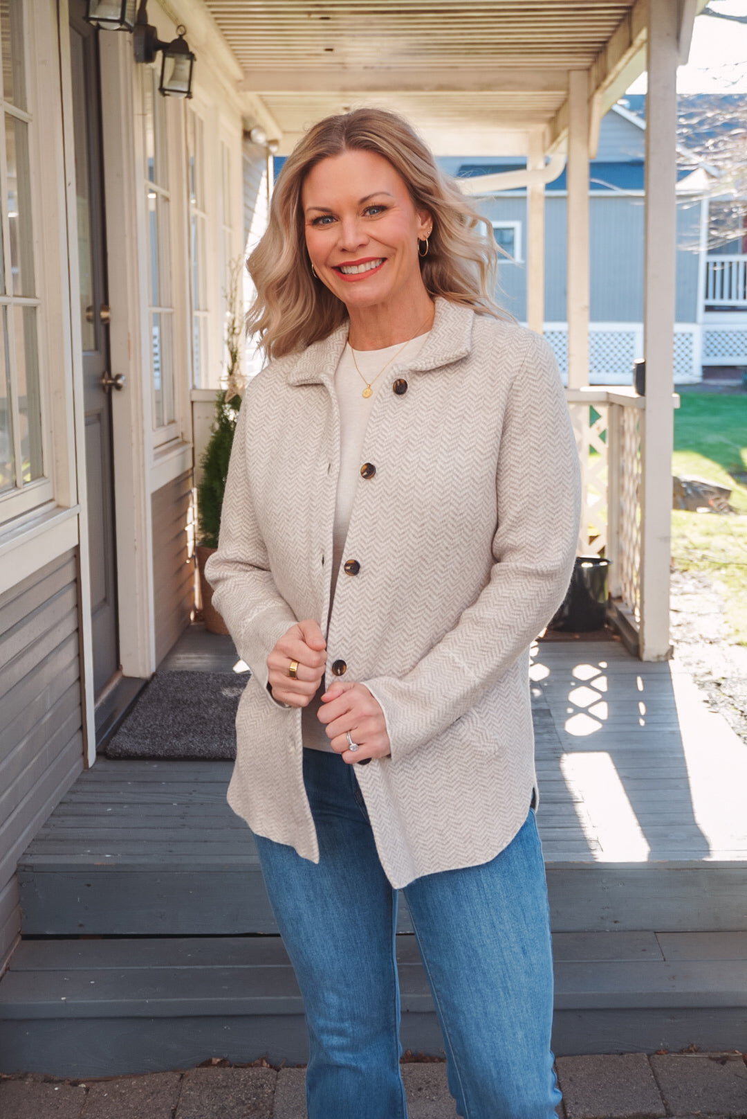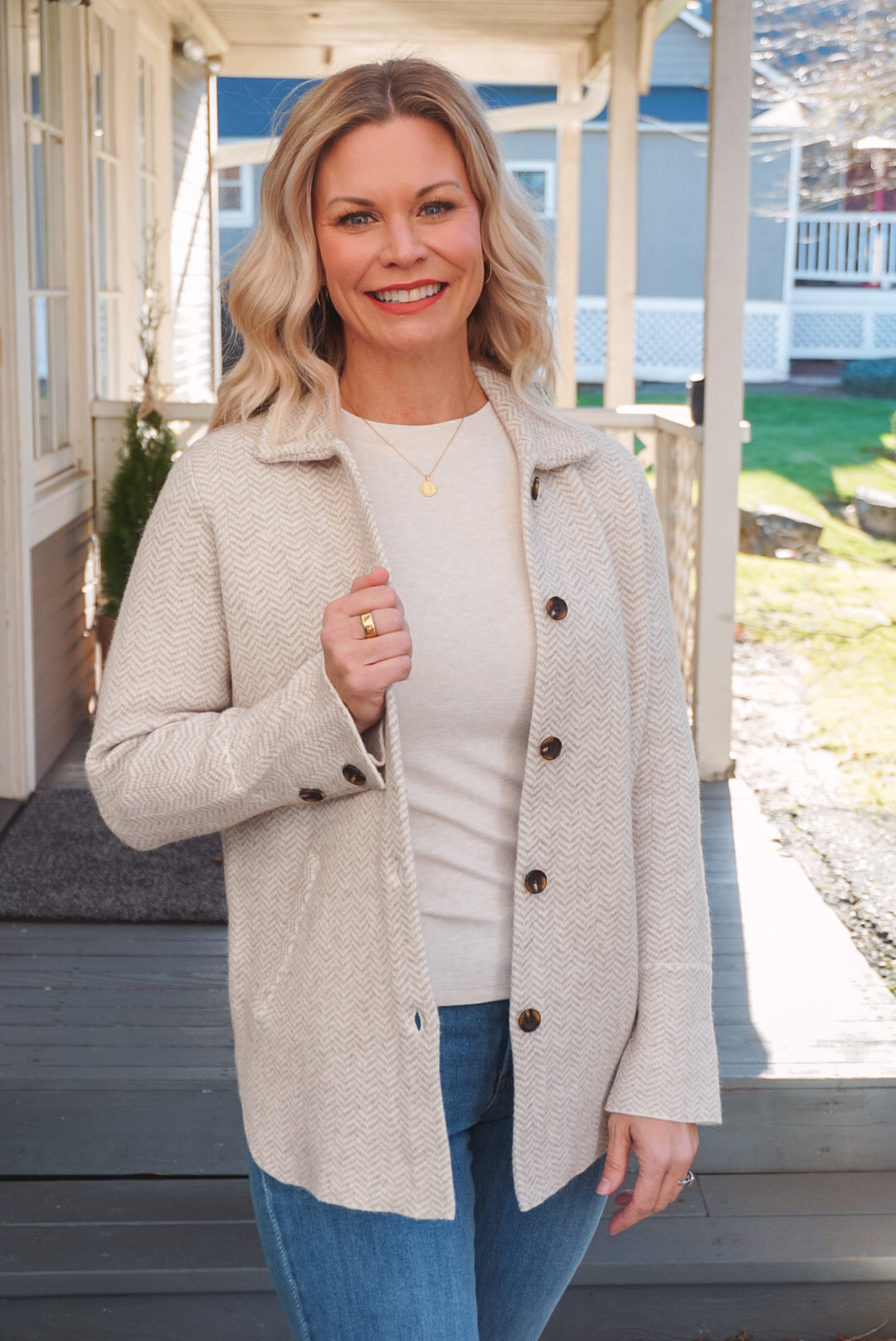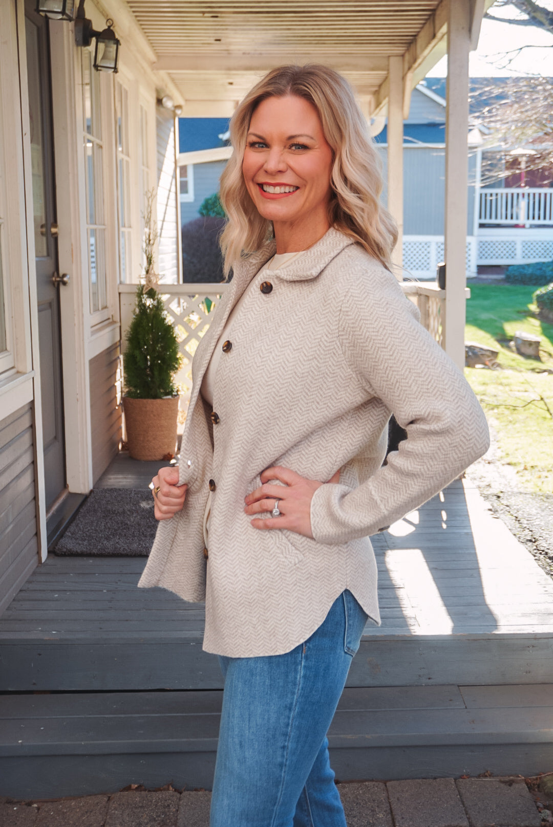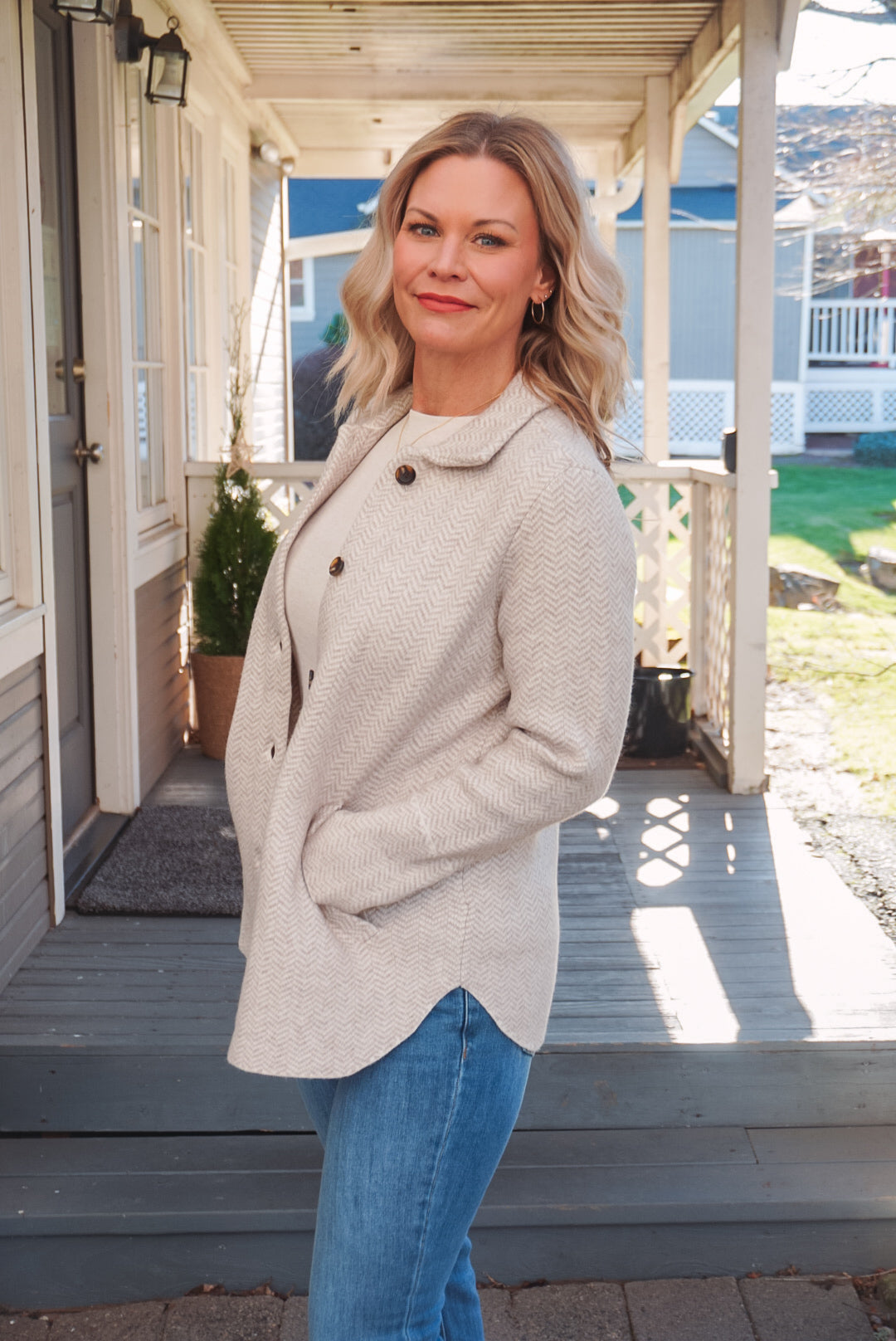 A sprinkle of old-school pattern meets new-school ease. With its soft structure, button-up front, and cozy pockets, this herringbone shacket makes any outfit feel just a little more polished.
