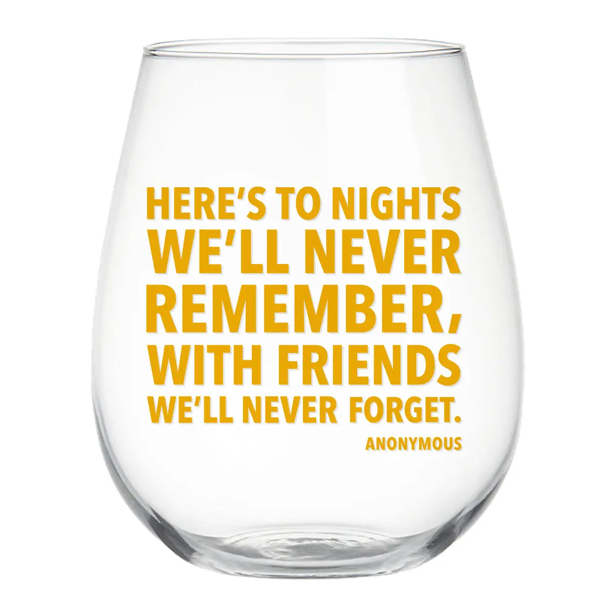 To Nights We'll Never Remember With Friends We'll Never Forget Friendship inspired stemless wine glass. When you have a good friend and a glass of wine, what more can you ask for? It makes a great gift. Perfect for any occasion or just because.