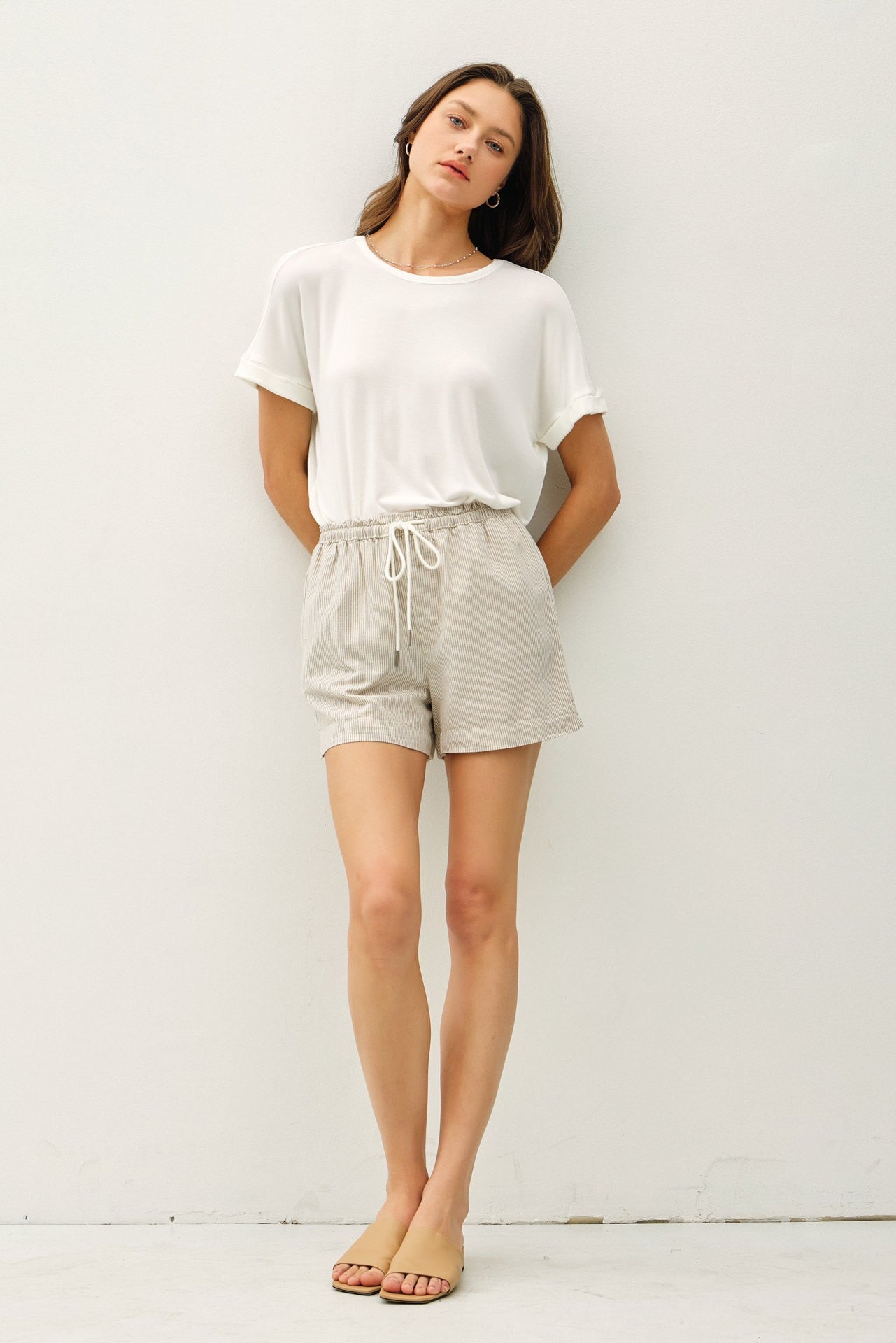 Get ready for a beach day with our Oceanside Linen Shorts! Made with a linen blend, these pinstripe shorts are both comfy and cute. The drawstring elastic waist ensures a perfect fit, while the side pockets add convenience. Perfect for strolling along the shore or lounging in the sun!