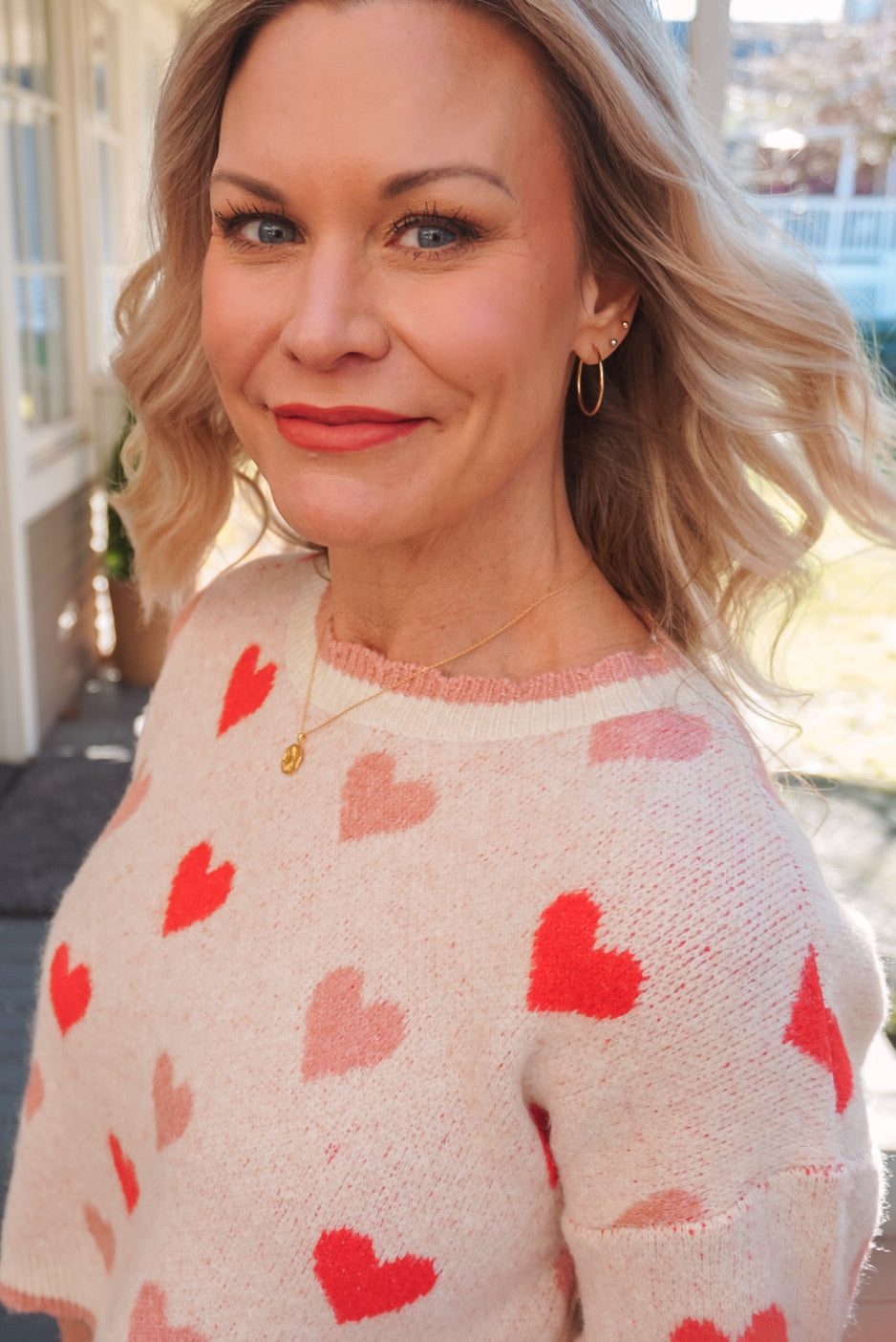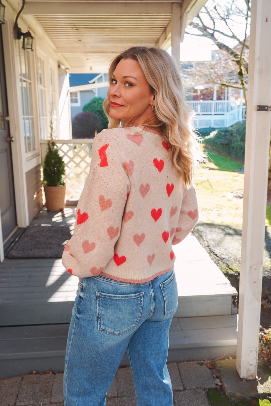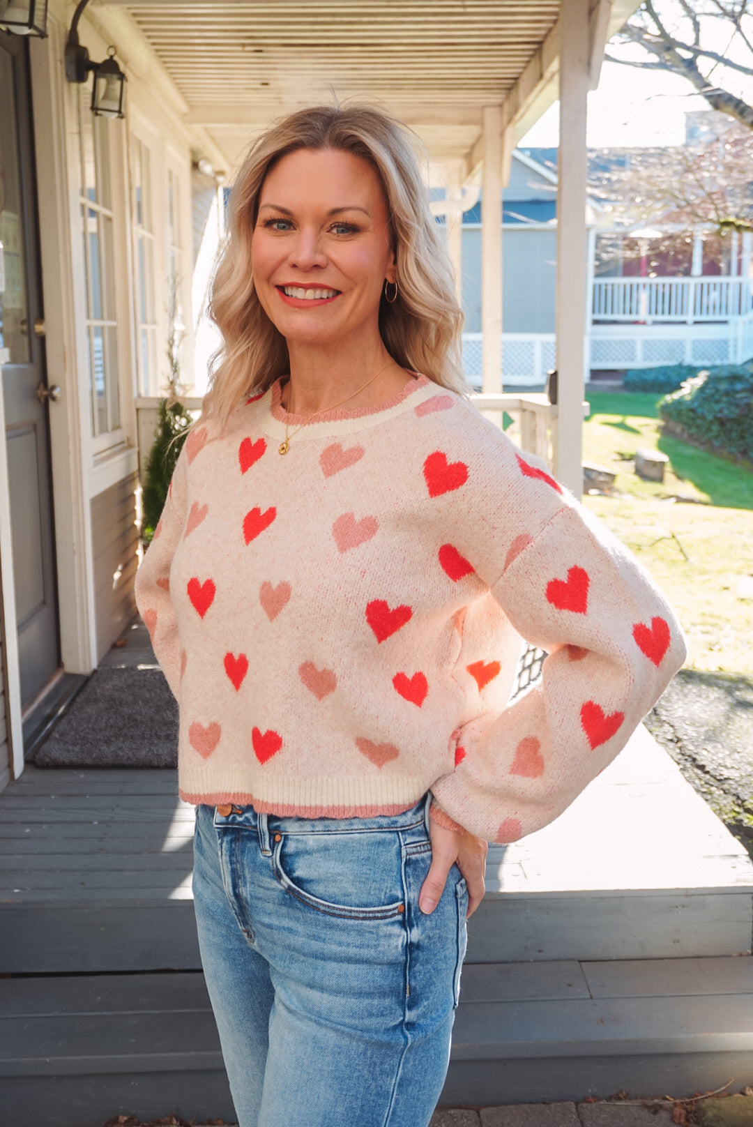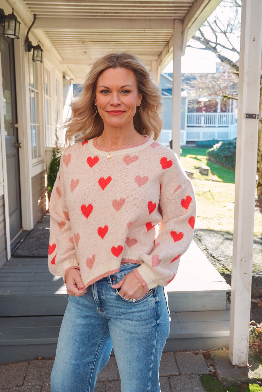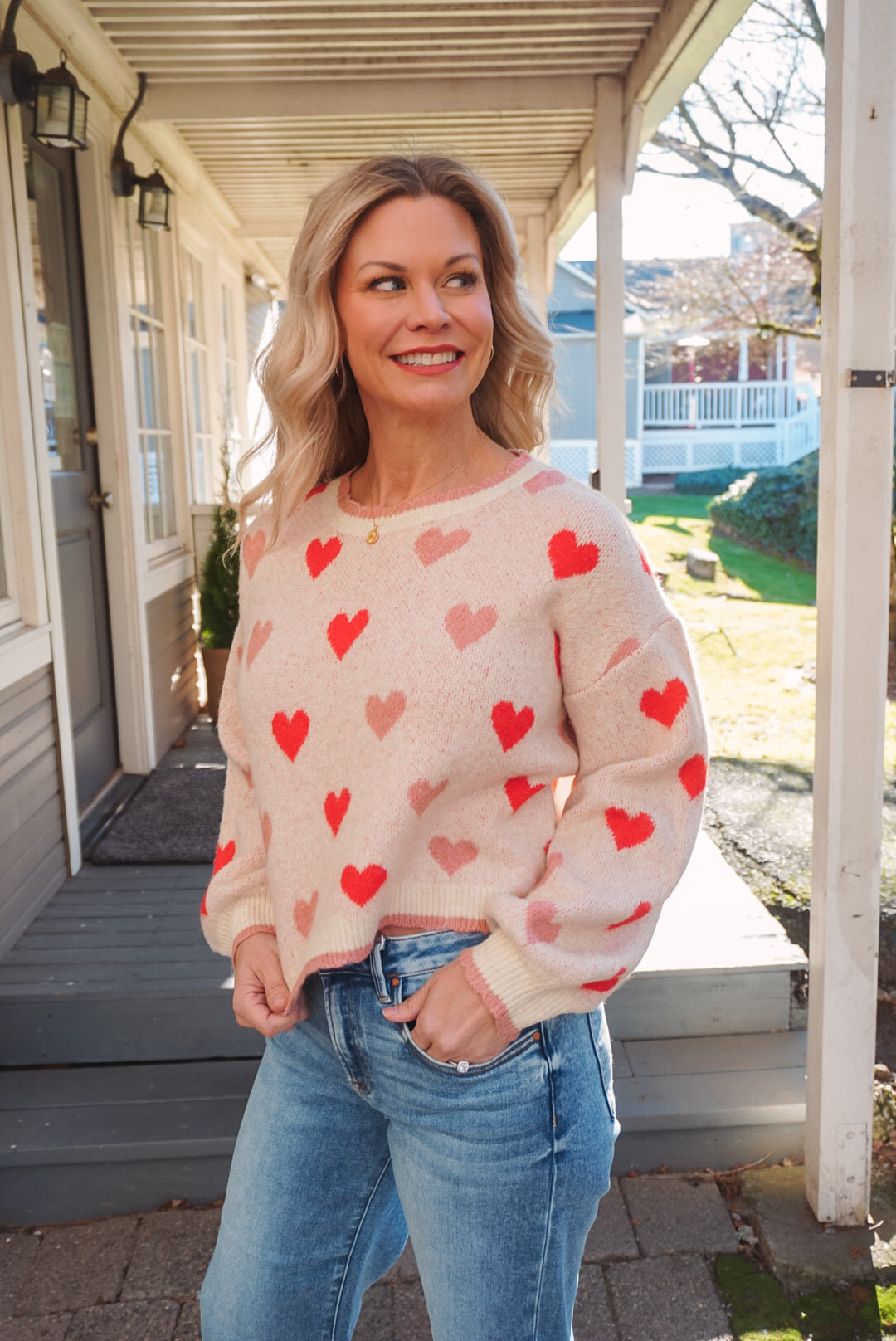 Dress to impress with our Queen Of Hearts Sweater! This playful and relaxed fit sweater features a unique all over two-tone heart pattern, perfect for spreading the love on Valentine's Day. The soft material and long sleeves make it the ultimate cozy and stylish addition to your wardrobe.