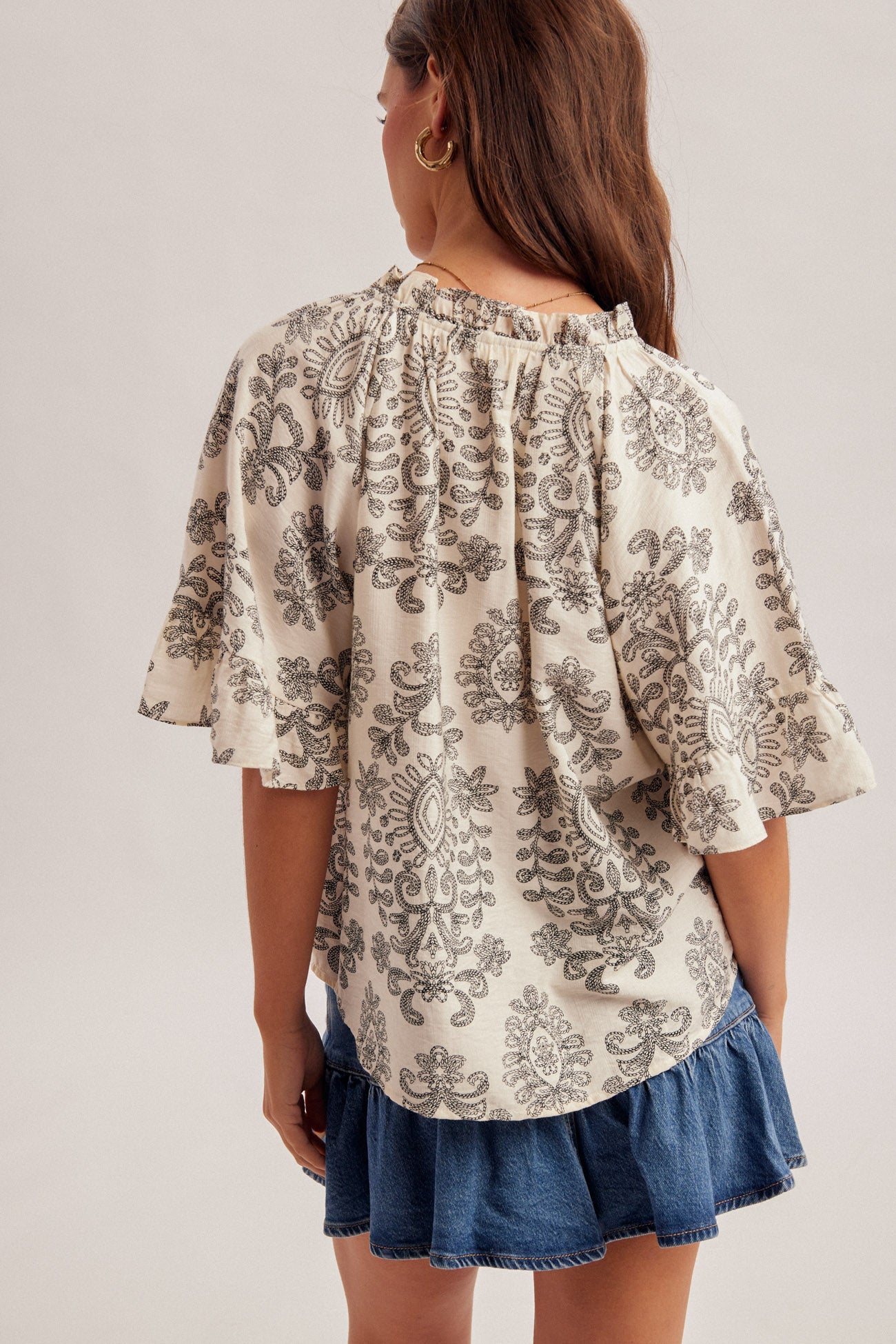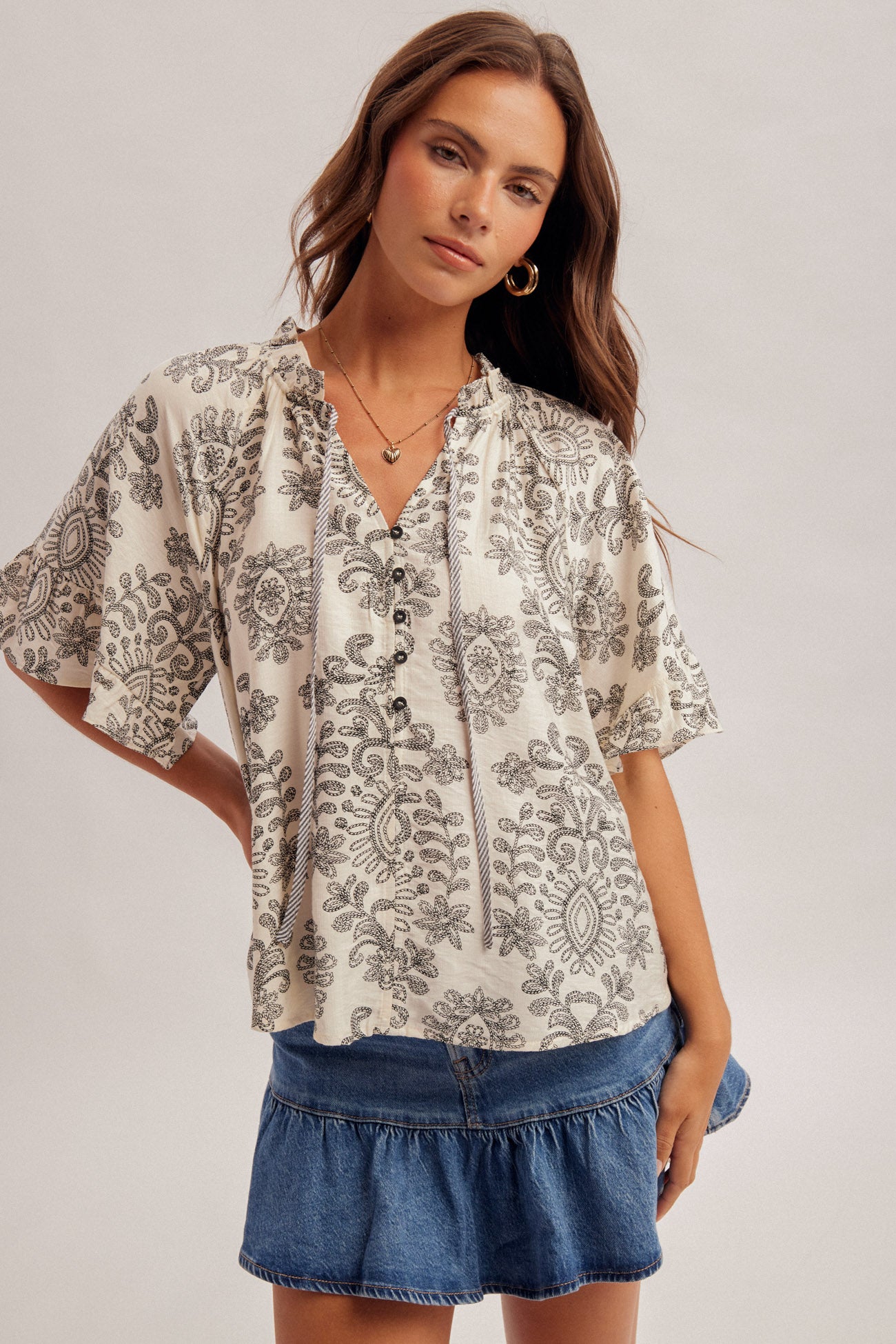 The Silvia Blouse combines delicate embroidery-like prints with charming contrast ties, making it perfect for any occasion. Its soft, lightweight fabric and flutter sleeves ensure comfort and ease, helping you look and feel your best all day long. Enjoy effortless style with this lovely addition to your wardrobe!