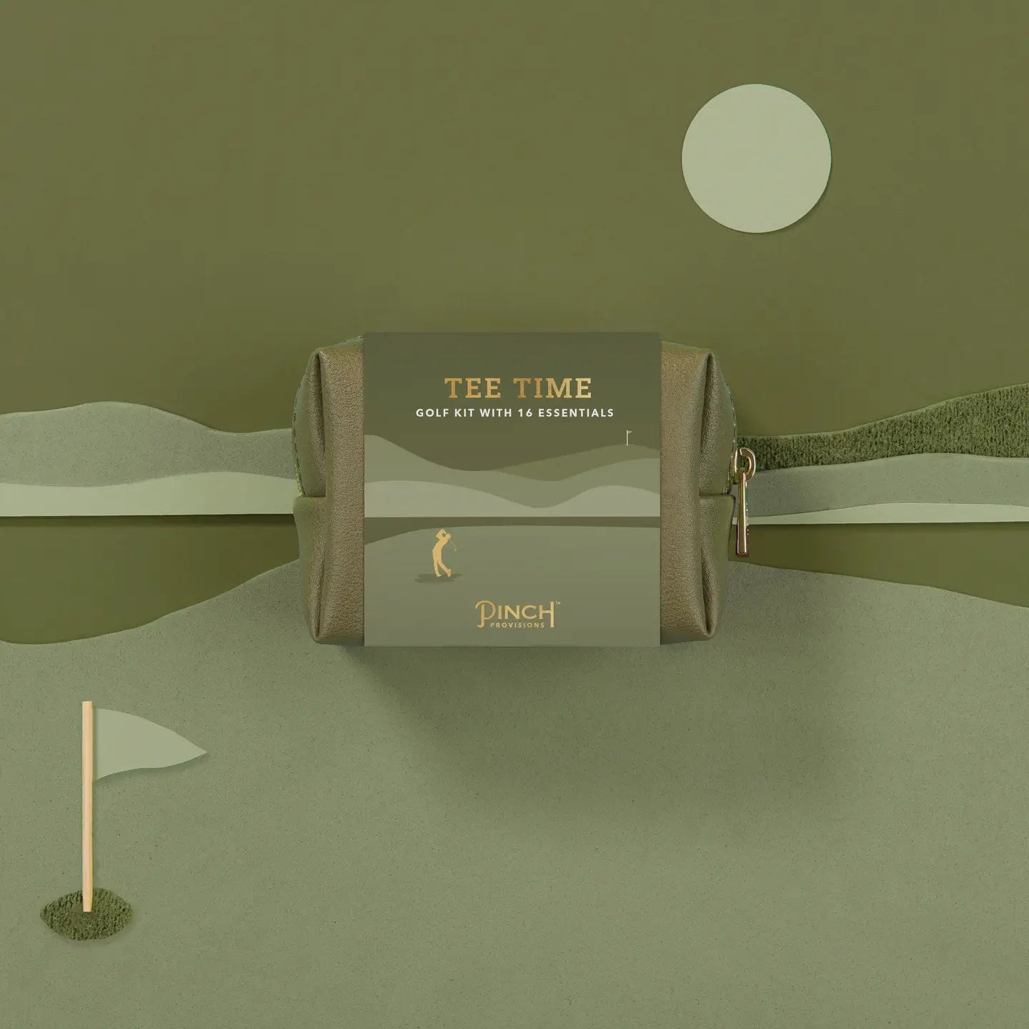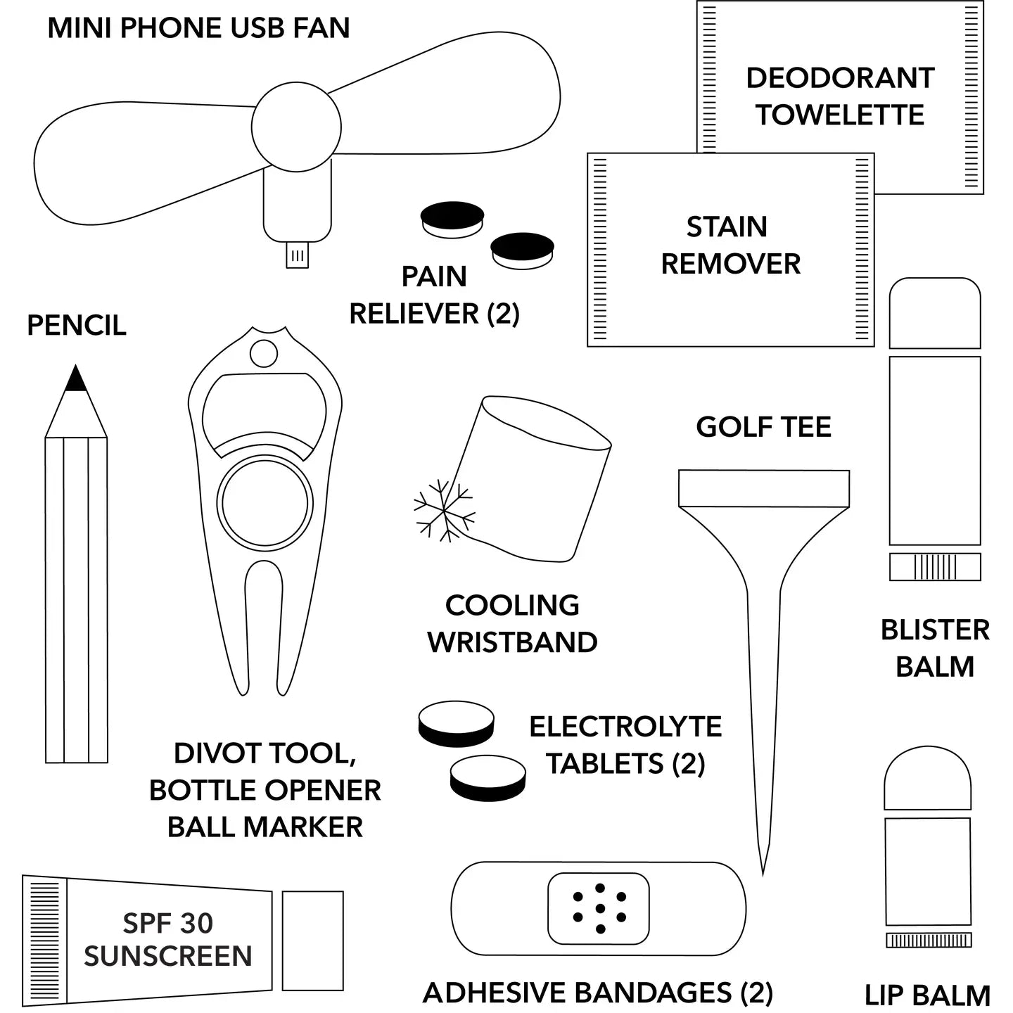 Master your game with our new "Tee Time" Golf Kit. This olive green vegan leather pouch is filled with 16 must-haves, including a USB phone fan, cooling wristband, golf tees, golf pencil, pain reliever, electrolytes, blister balm, SPF lip balm/sunscreen duo, stain remover, deodorant towelette, divot tool, ball marker, bottle opener, and adhesive bandages. Ideal for Father's Day gifting and for the golfer gals in your life.