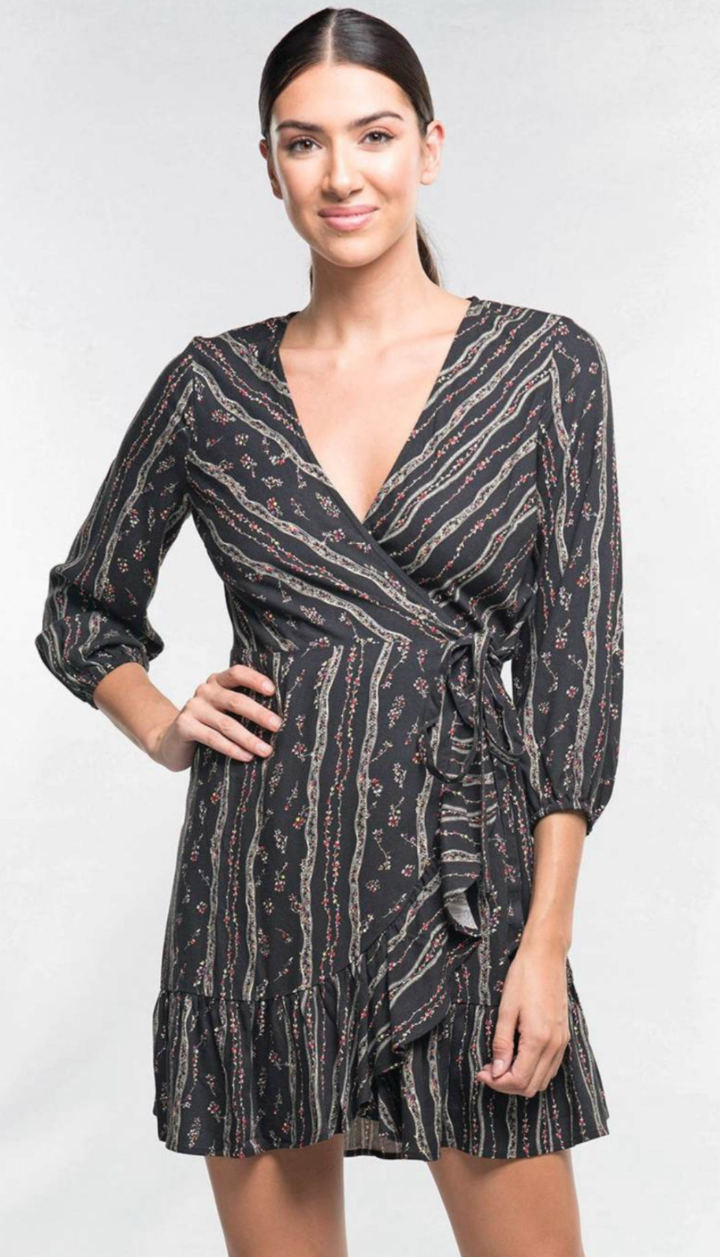 Flaunt your playful side with the Waverly Dress. This thigh length dress features a V neckline, wrap style with tie front detailing, and ruffle trim. The 3/4 length sleeves add a touch of elegance. Perfect for a fun, flirty look.